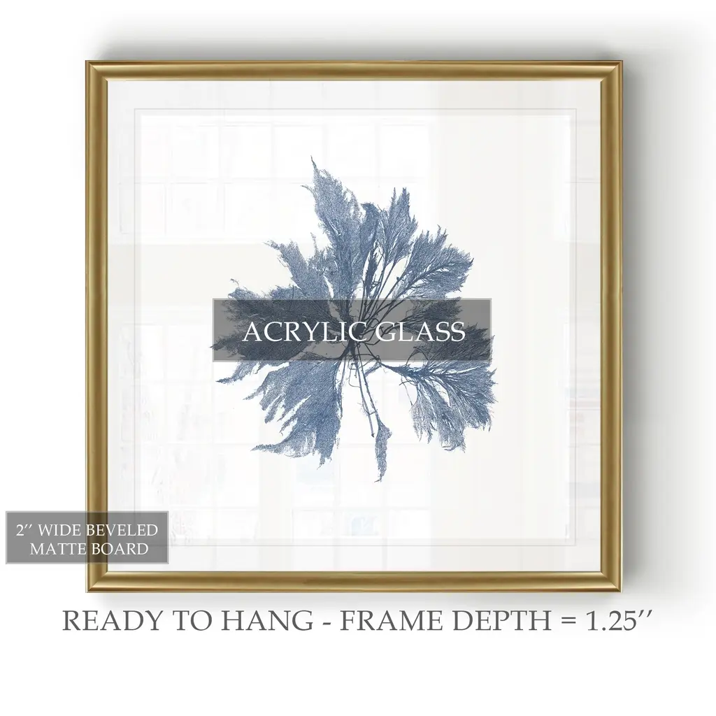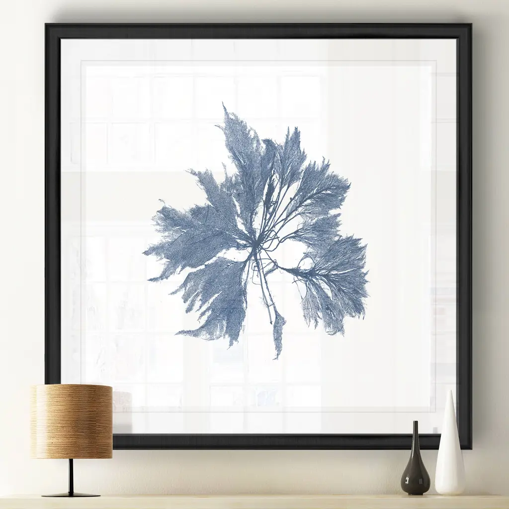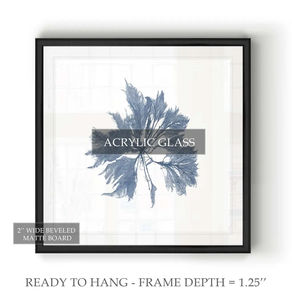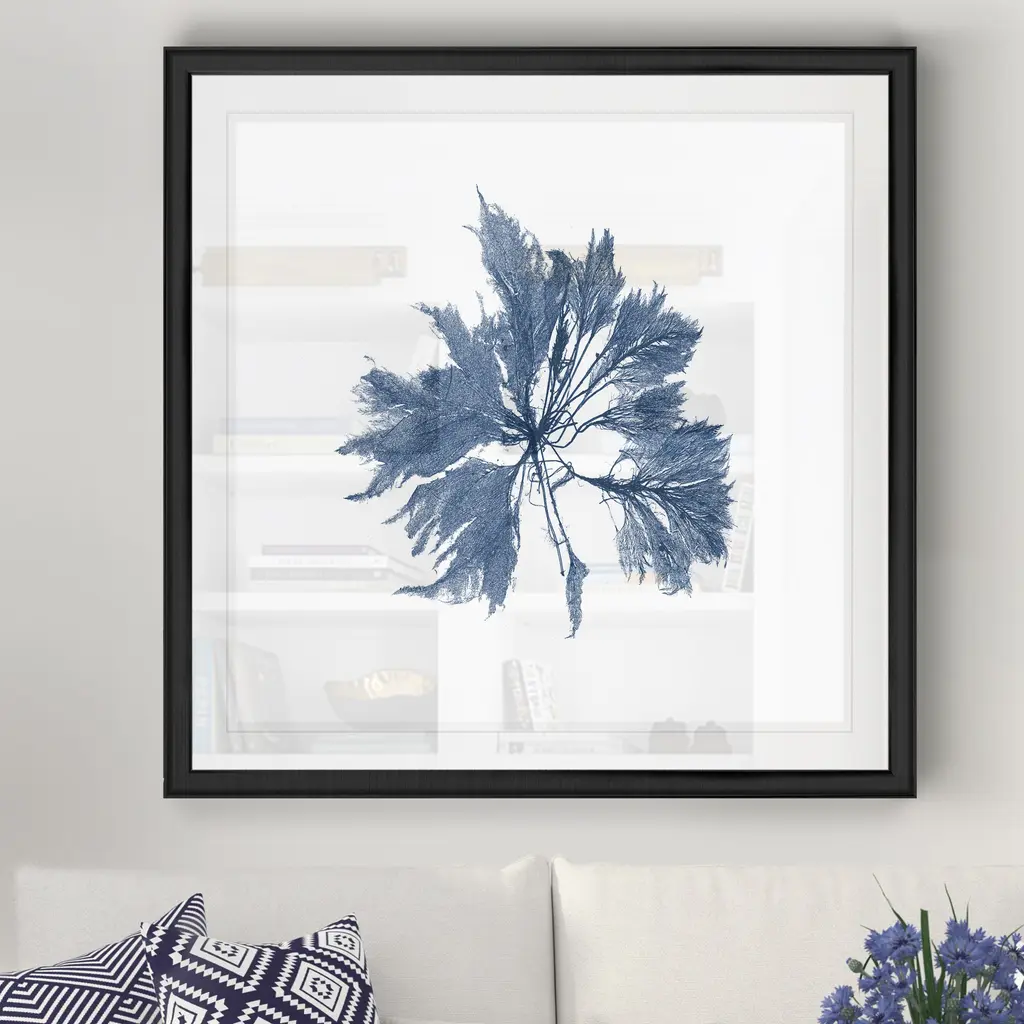 Navy Seaweed I -Black Framed Print A premium Black Framed giclee print Featuring a beveled a matt , acrylic glass, and a high quality giclee print 5 SIZES AVAILABLE 34''x34''- Overall Size 30''x30'' - Overall Size 26''x26''' - Overall Size 22''x22''' - Overall Size 18''x18''' - Overall Size Each piece is made to order. Built to Last Each piece comes ready to hang Fade and Water resistant Made domestically