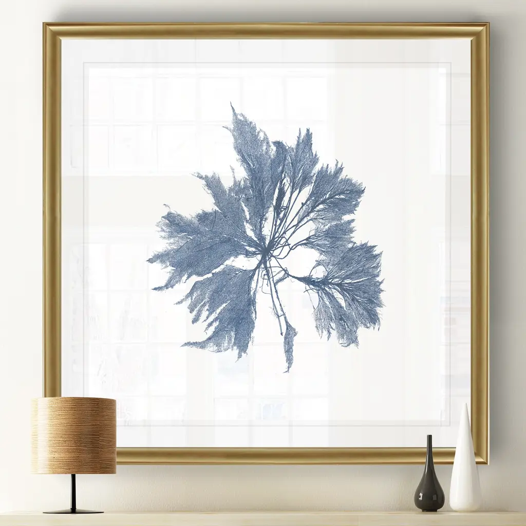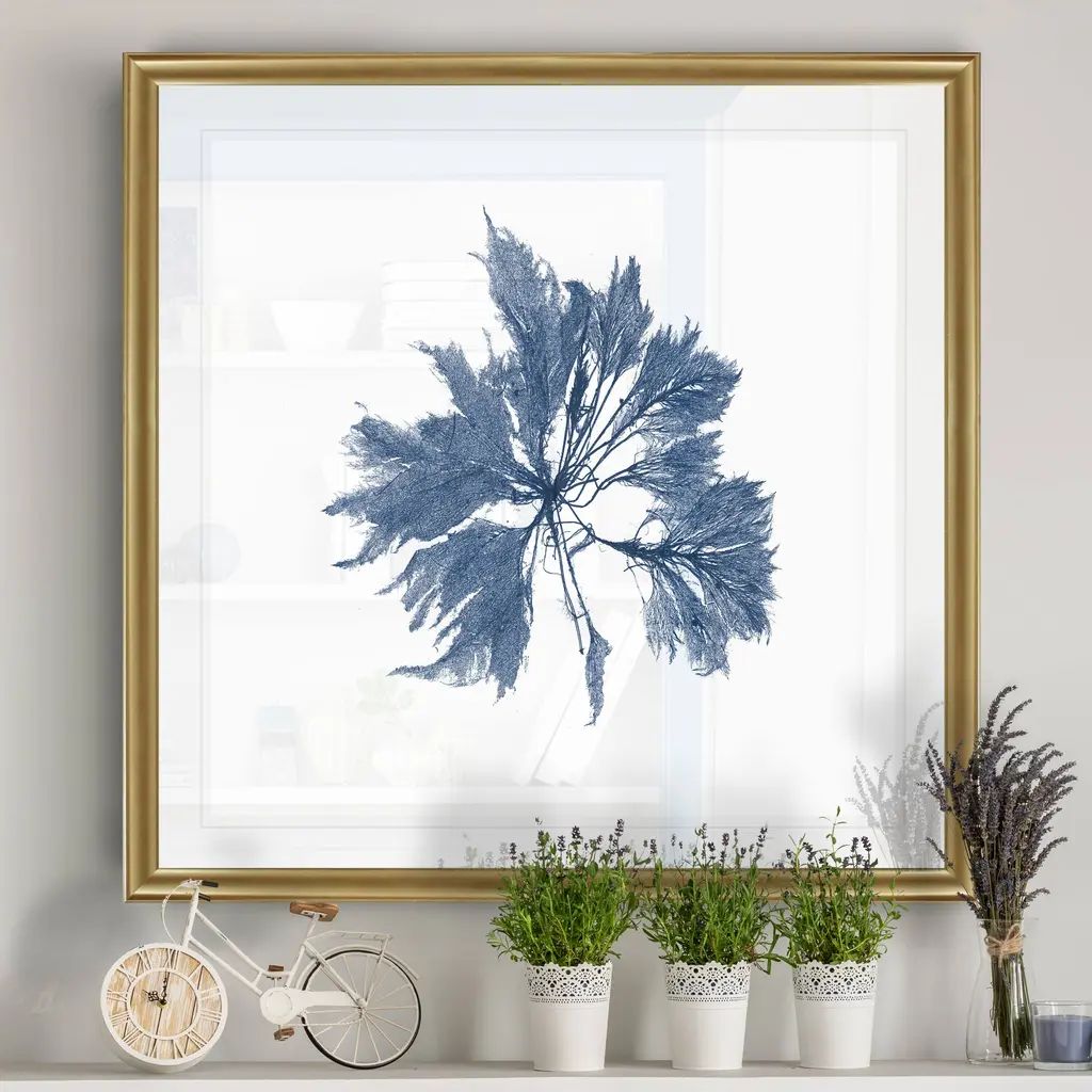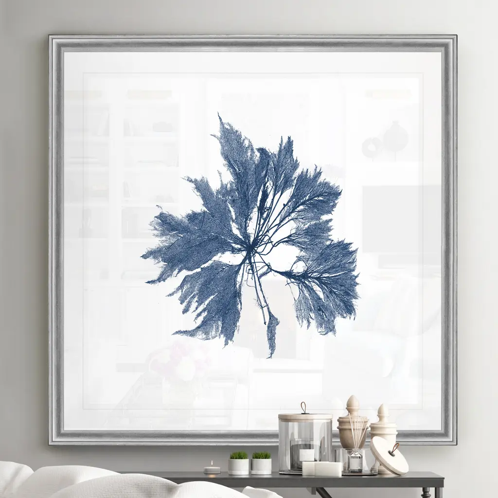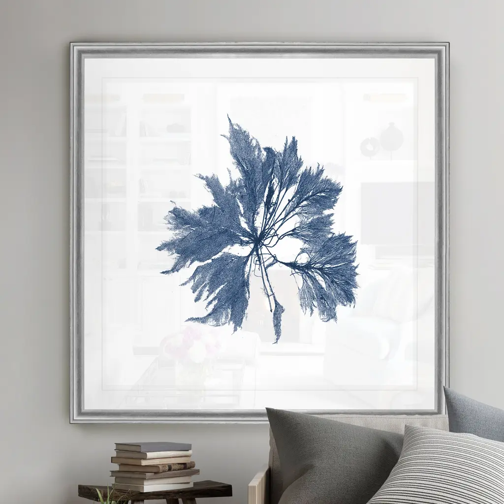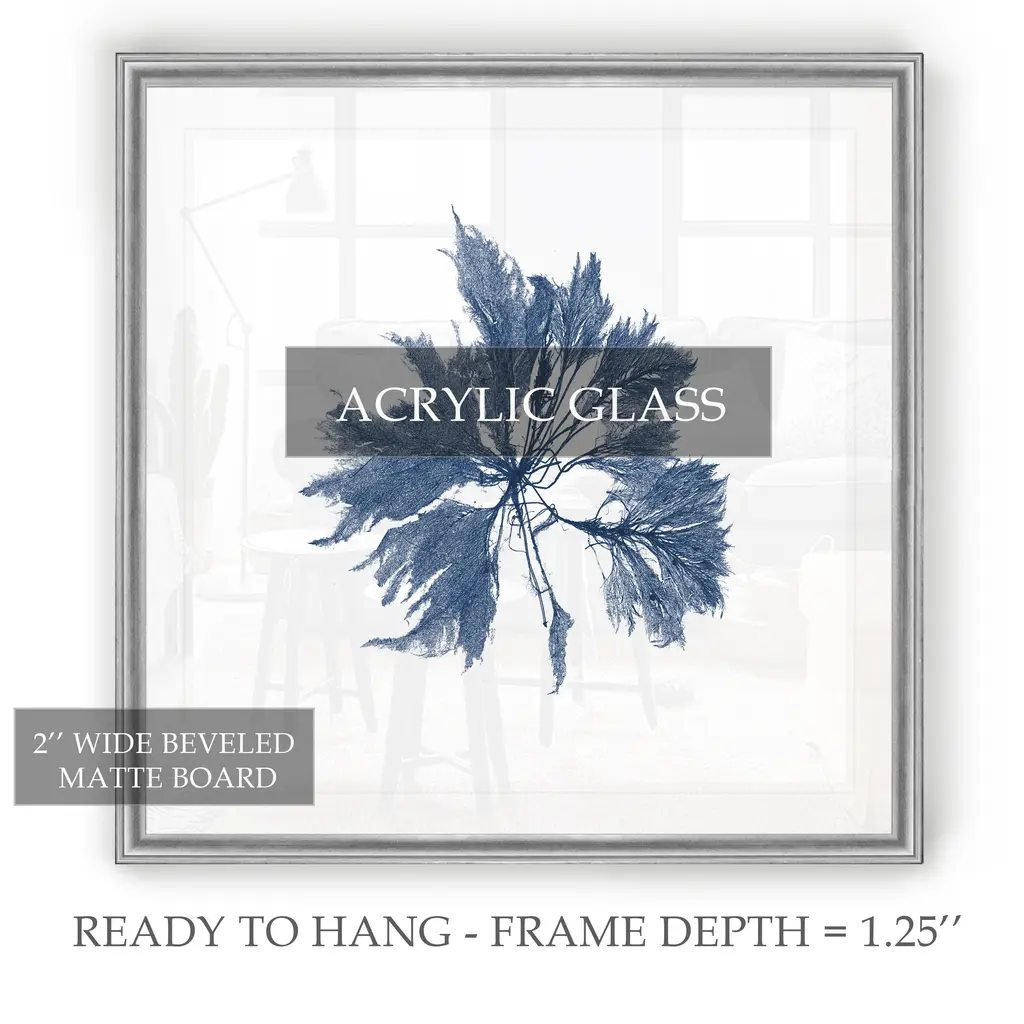 Navy Seaweed I -Black Framed Print A premium Black Framed giclee print Featuring a beveled a matt , acrylic glass, and a high quality giclee print 5 SIZES AVAILABLE 34''x34''- Overall Size 30''x30'' - Overall Size 26''x26''' - Overall Size 22''x22''' - Overall Size 18''x18''' - Overall Size Each piece is made to order. Built to Last Each piece comes ready to hang Fade and Water resistant Made domestically