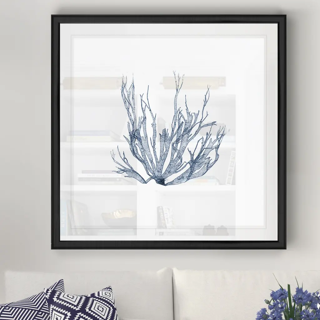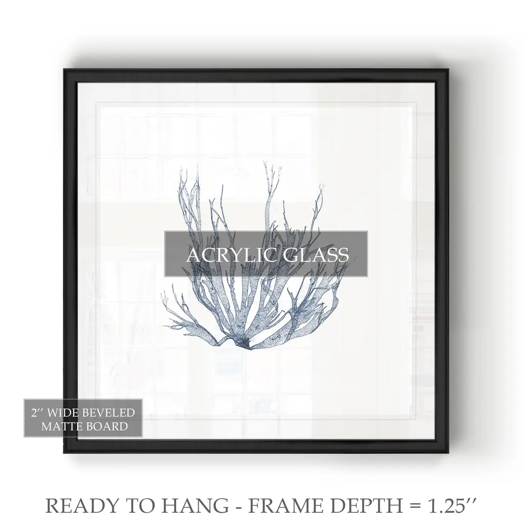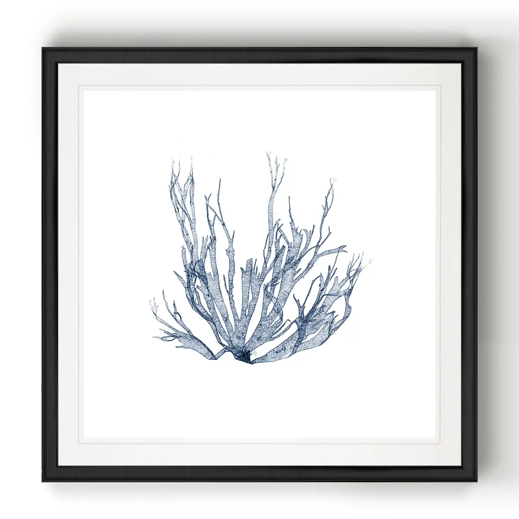 Navy Seaweed IV -Black Framed Print A premium Black Framed giclee print Featuring a beveled a matt , acrylic glass, and a high quality giclee print 5 SIZES AVAILABLE 34''x34''- Overall Size 30''x30'' - Overall Size 26''x26''' - Overall Size 22''x22''' - Overall Size 18''x18''' - Overall Size Each piece is made to order. Built to Last Each piece comes ready to hang Fade and Water resistant Made domestically