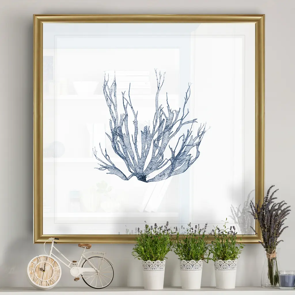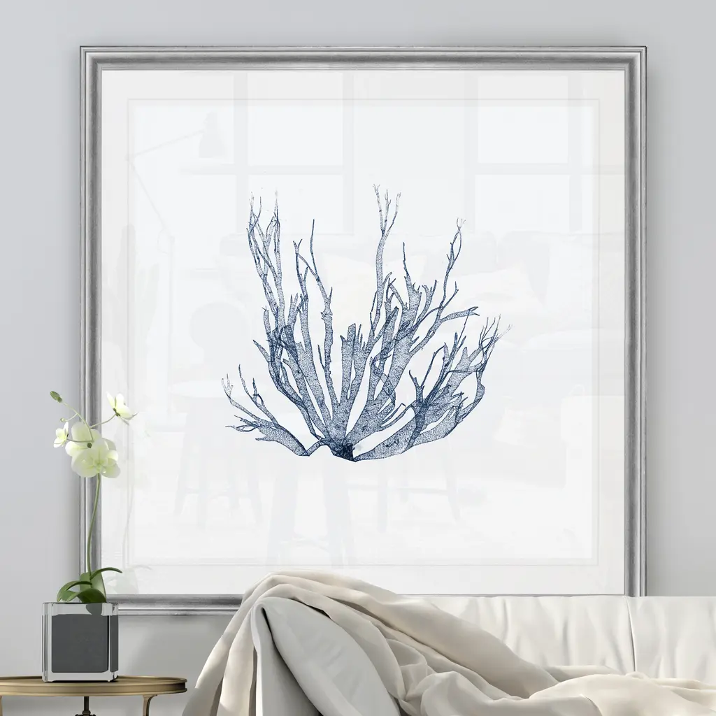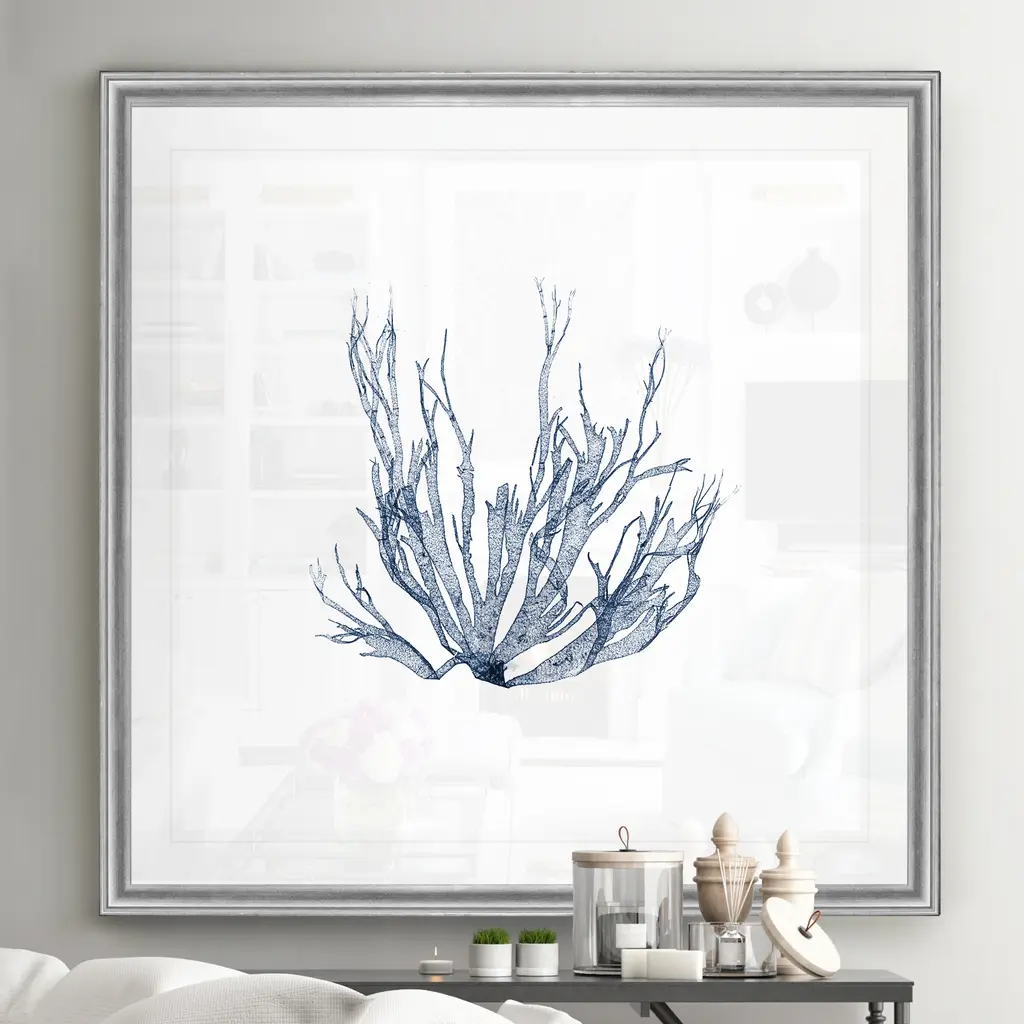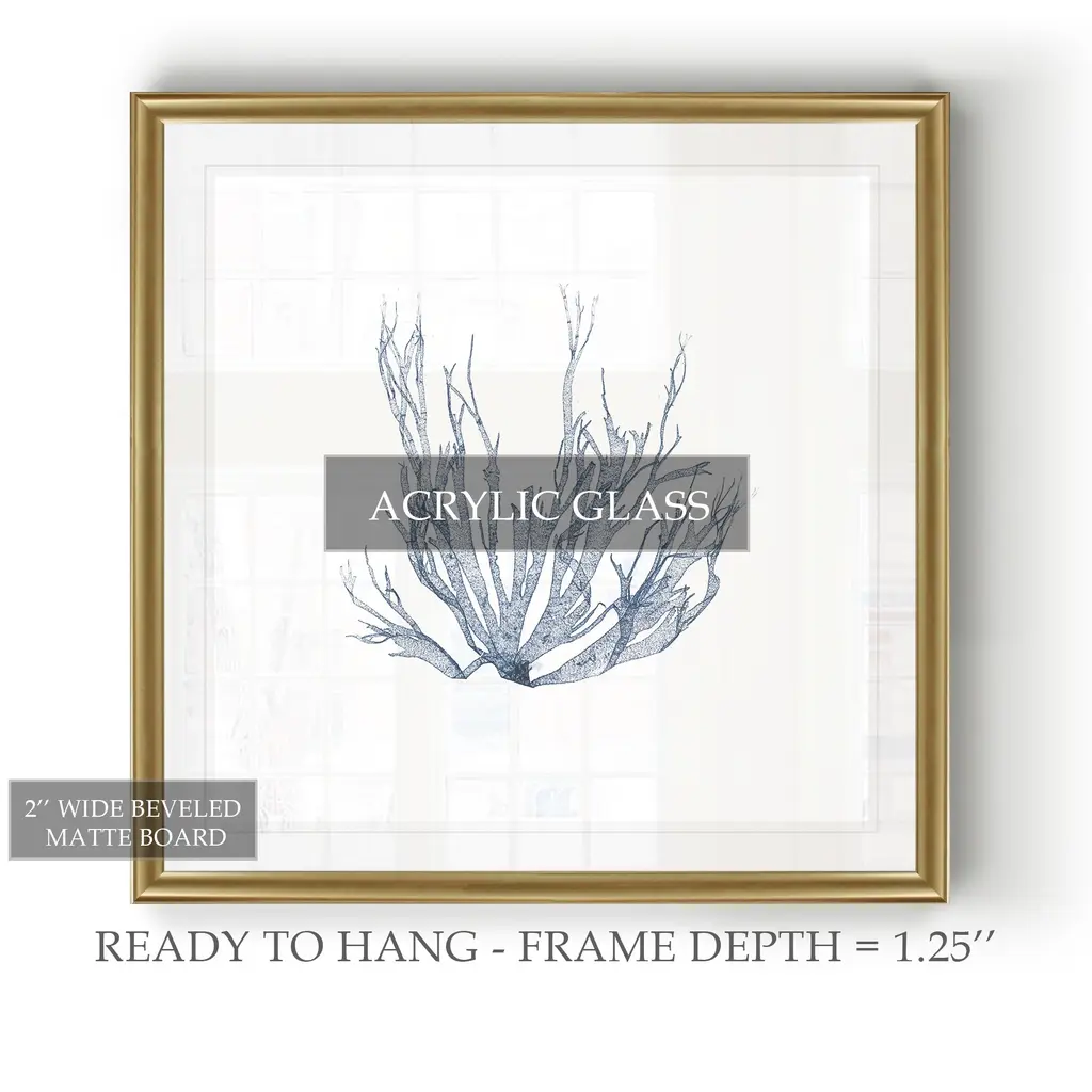 Navy Seaweed IV -Black Framed Print A premium Black Framed giclee print Featuring a beveled a matt , acrylic glass, and a high quality giclee print 5 SIZES AVAILABLE 34''x34''- Overall Size 30''x30'' - Overall Size 26''x26''' - Overall Size 22''x22''' - Overall Size 18''x18''' - Overall Size Each piece is made to order. Built to Last Each piece comes ready to hang Fade and Water resistant Made domestically