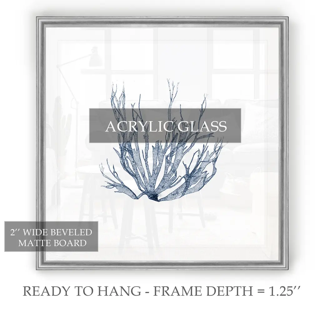 Navy Seaweed IV -Black Framed Print A premium Black Framed giclee print Featuring a beveled a matt , acrylic glass, and a high quality giclee print 5 SIZES AVAILABLE 34''x34''- Overall Size 30''x30'' - Overall Size 26''x26''' - Overall Size 22''x22''' - Overall Size 18''x18''' - Overall Size Each piece is made to order. Built to Last Each piece comes ready to hang Fade and Water resistant Made domestically