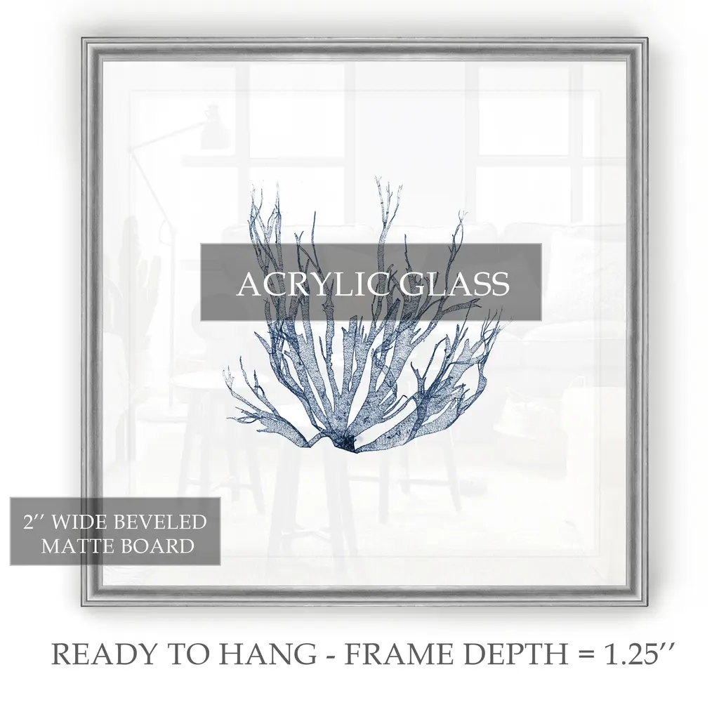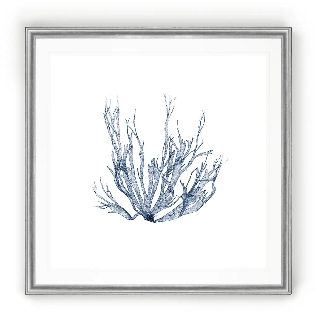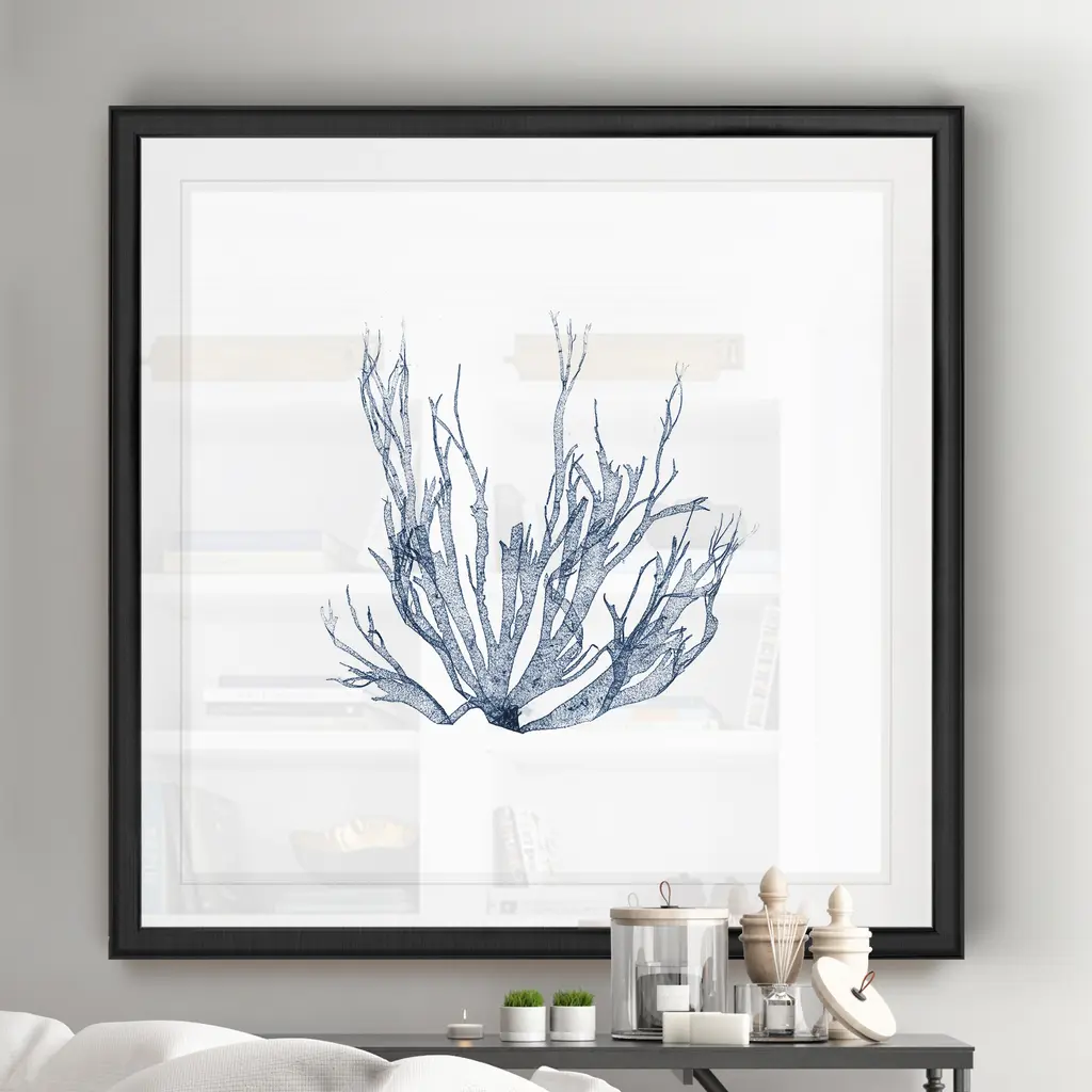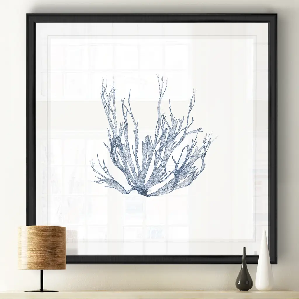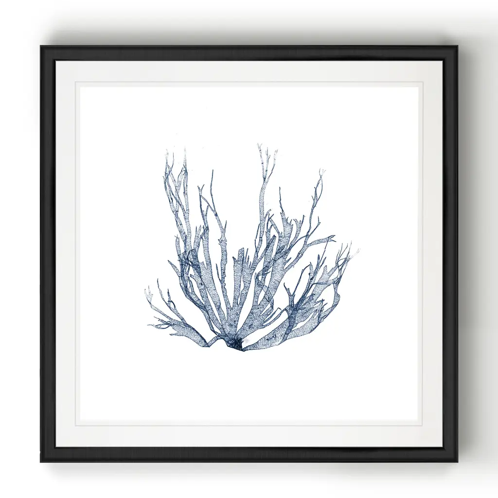 Navy Seaweed IV -Black Framed Print A premium Black Framed giclee print Featuring a beveled a matt , acrylic glass, and a high quality giclee print 5 SIZES AVAILABLE 34''x34''- Overall Size 30''x30'' - Overall Size 26''x26''' - Overall Size 22''x22''' - Overall Size 18''x18''' - Overall Size Each piece is made to order. Built to Last Each piece comes ready to hang Fade and Water resistant Made domestically