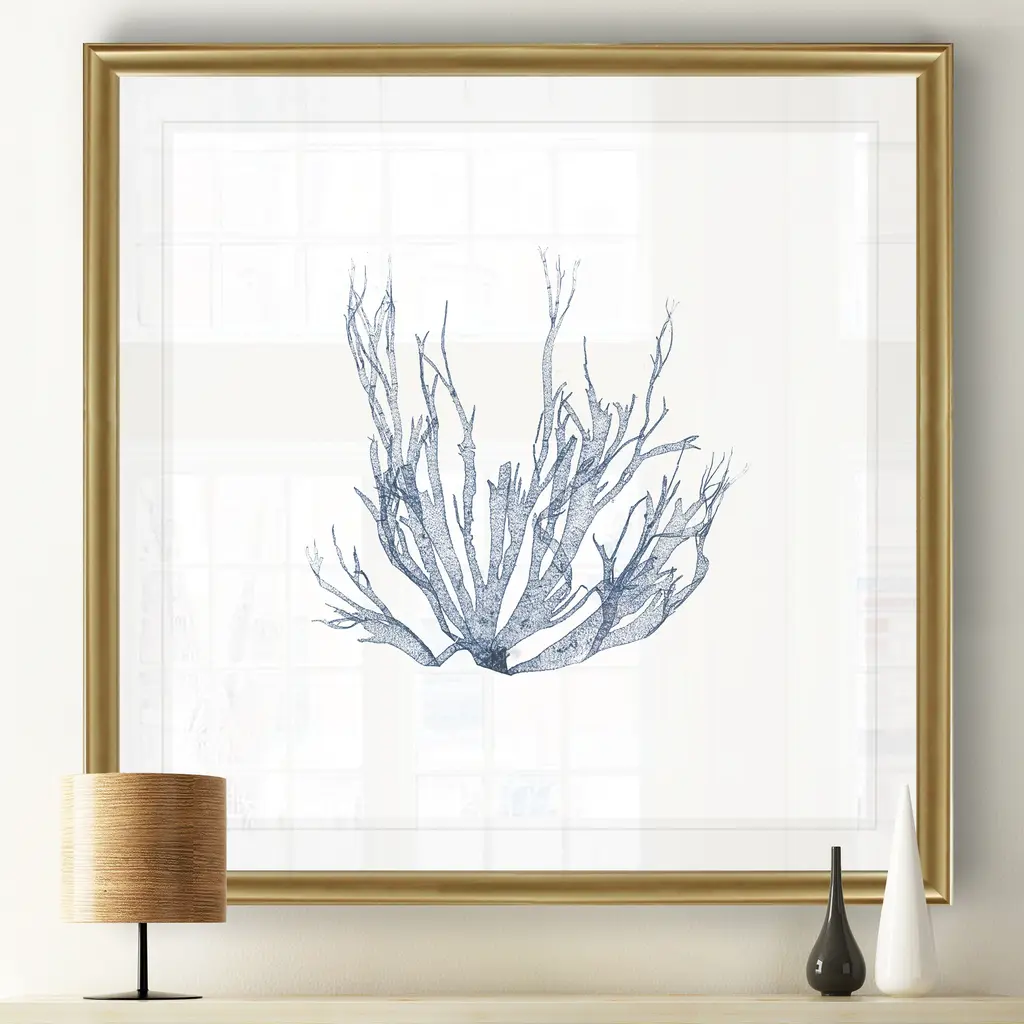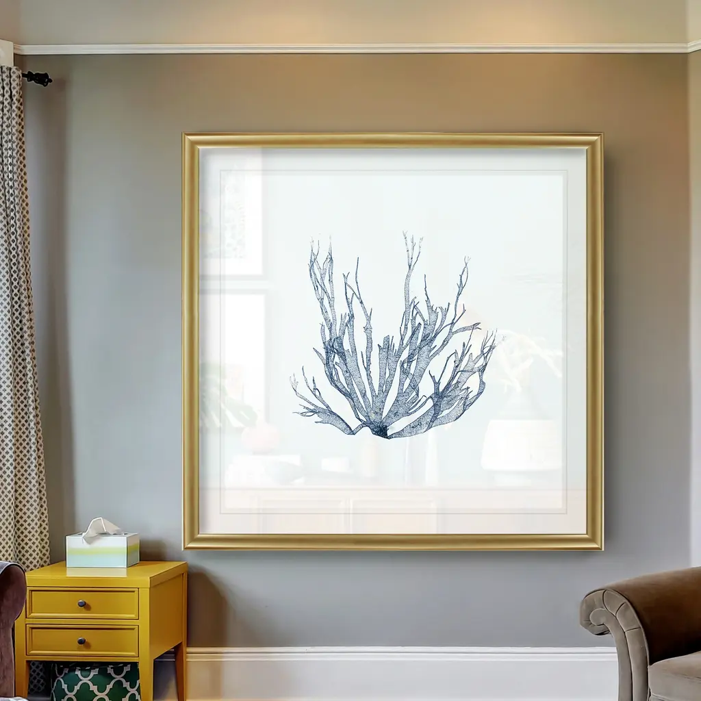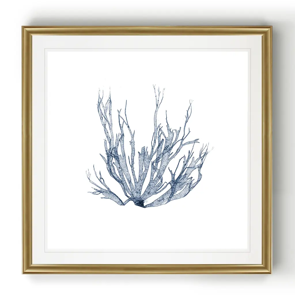 Navy Seaweed IV -Black Framed Print A premium Black Framed giclee print Featuring a beveled a matt , acrylic glass, and a high quality giclee print 5 SIZES AVAILABLE 34''x34''- Overall Size 30''x30'' - Overall Size 26''x26''' - Overall Size 22''x22''' - Overall Size 18''x18''' - Overall Size Each piece is made to order. Built to Last Each piece comes ready to hang Fade and Water resistant Made domestically