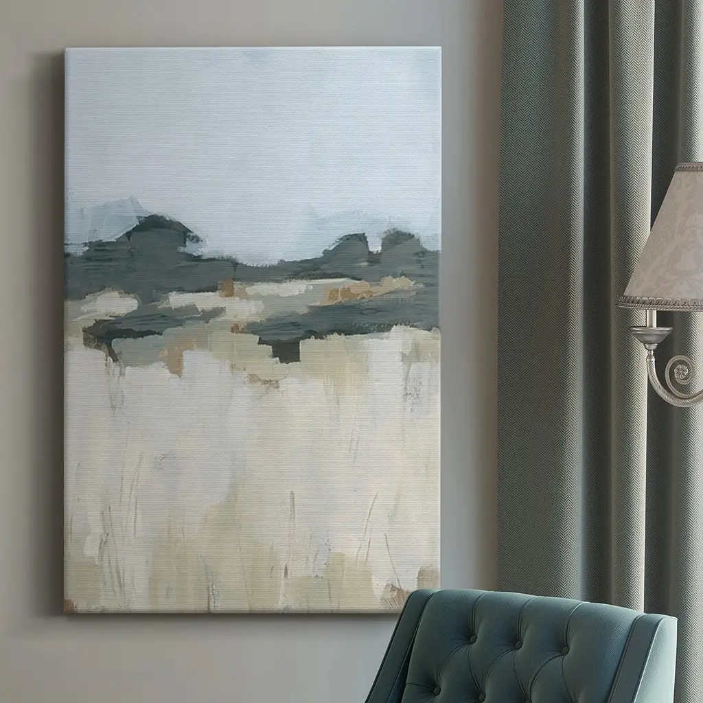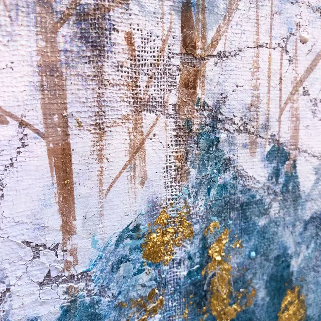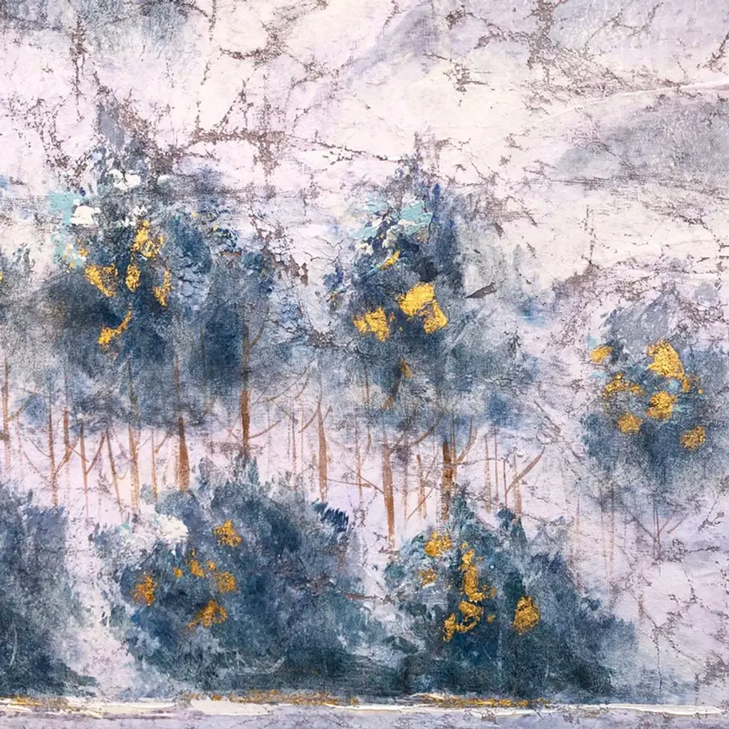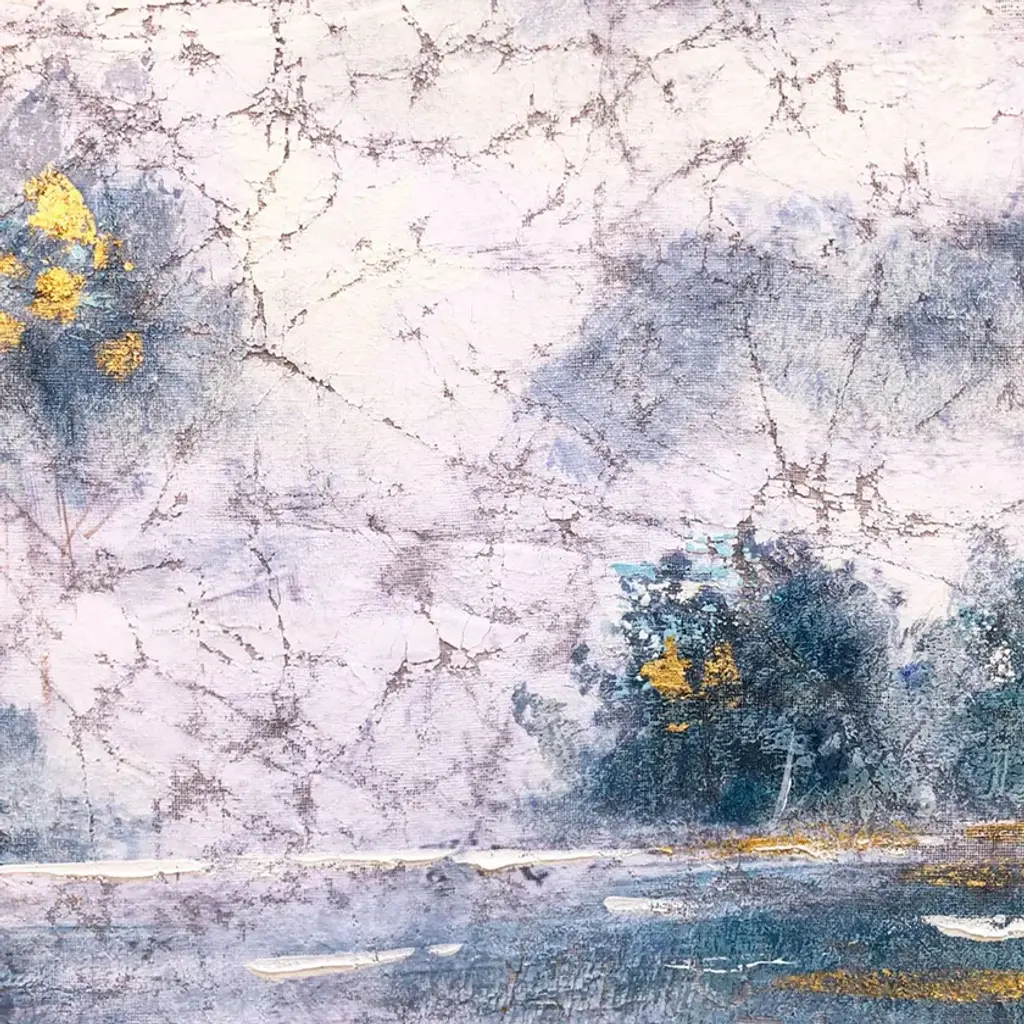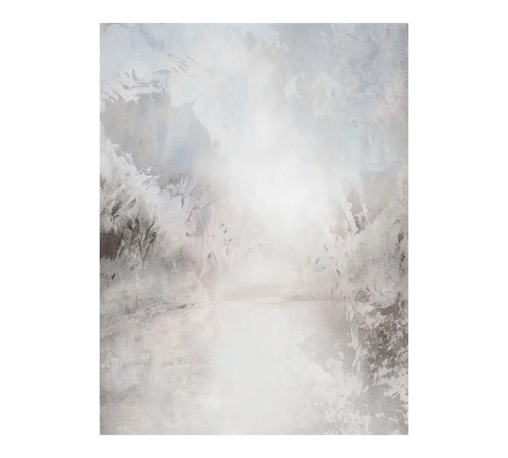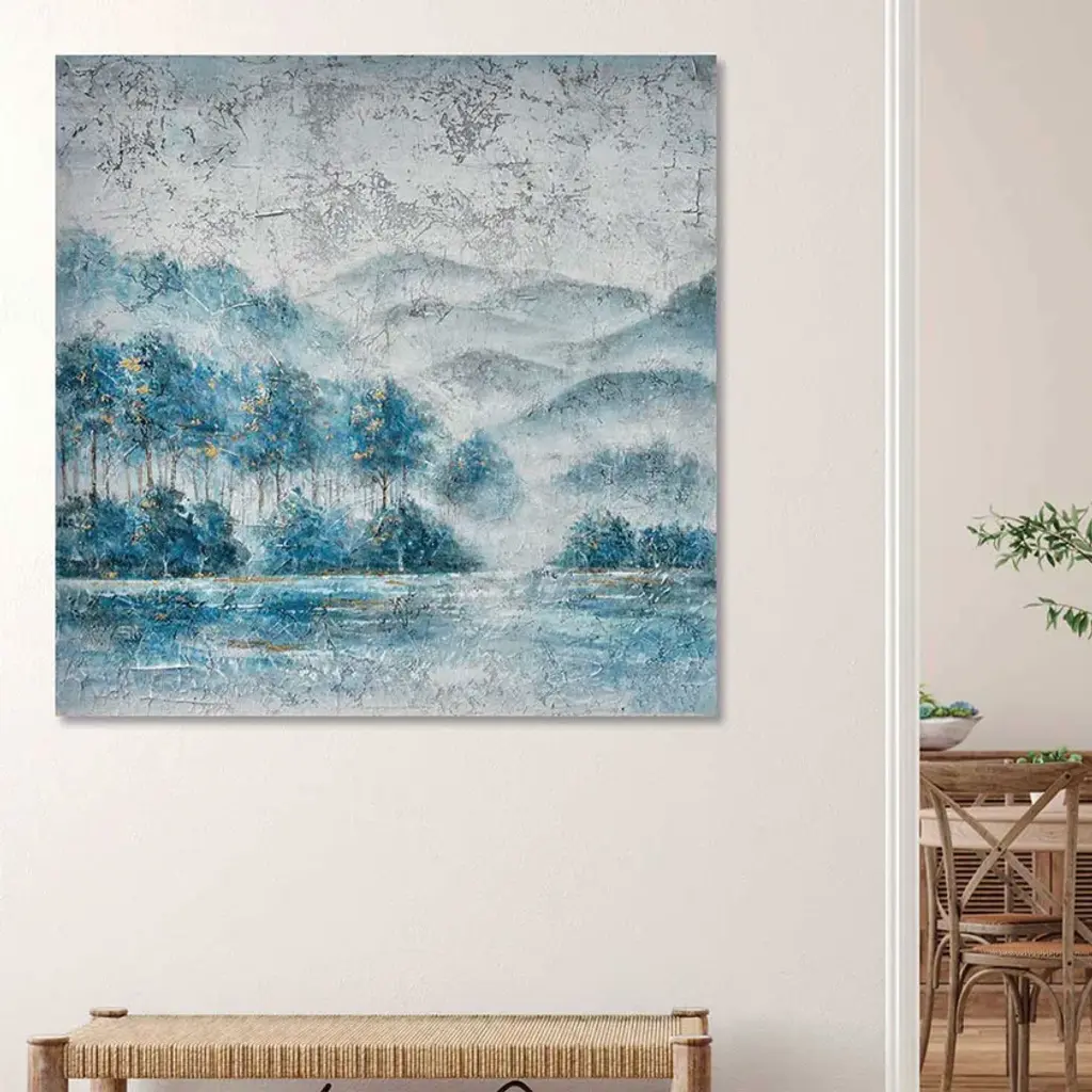 Nebbia Incantata is a hand-painted landscape painting on canvas. The natural environment is poetically depicted by blue and white gradient hues and has golden highlights, evocative of sunlight. The rough texture lends depth to the subject. With a wooden inner frame and painted edges, the painting is ready to hang.The AGAVE Quadri collection represents the excellence of contemporary art applied to the world of interior design. Each piece, hand-painted with artisanal techniques by the finest artists in collaboration with the Italian company AGAVE, combines abstract, natural, and figurative elements to create unique and refined works. These paintings transform spaces into environments of great elegance and character, perfect for interior design projects that require a distinctive and artistic touch.