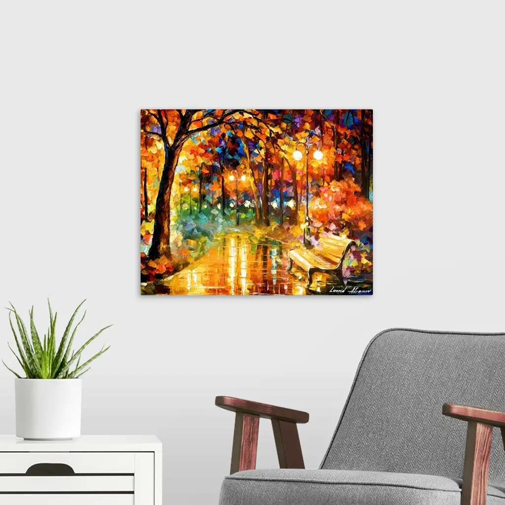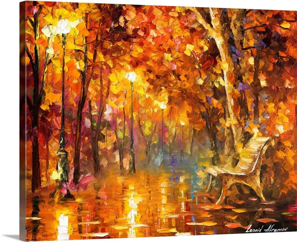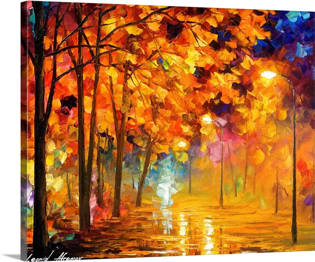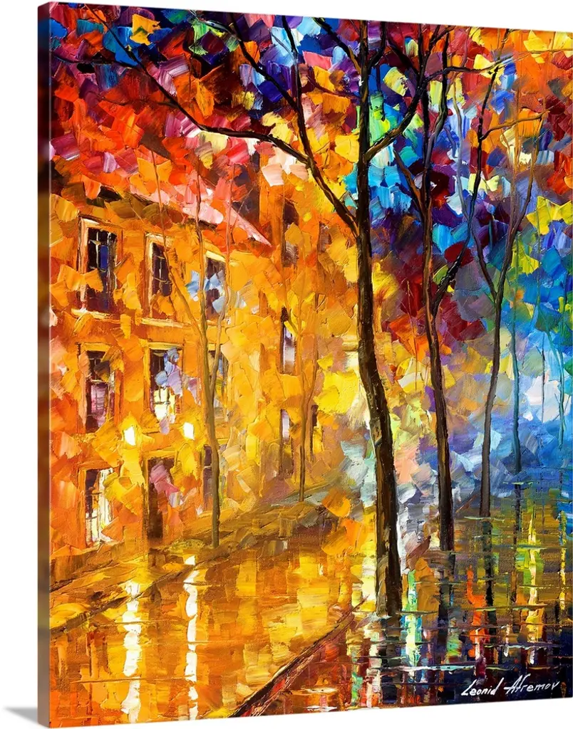 Contemporary colorful painting of wet sidewalk after a rain reflecting the lights and foliage all around.