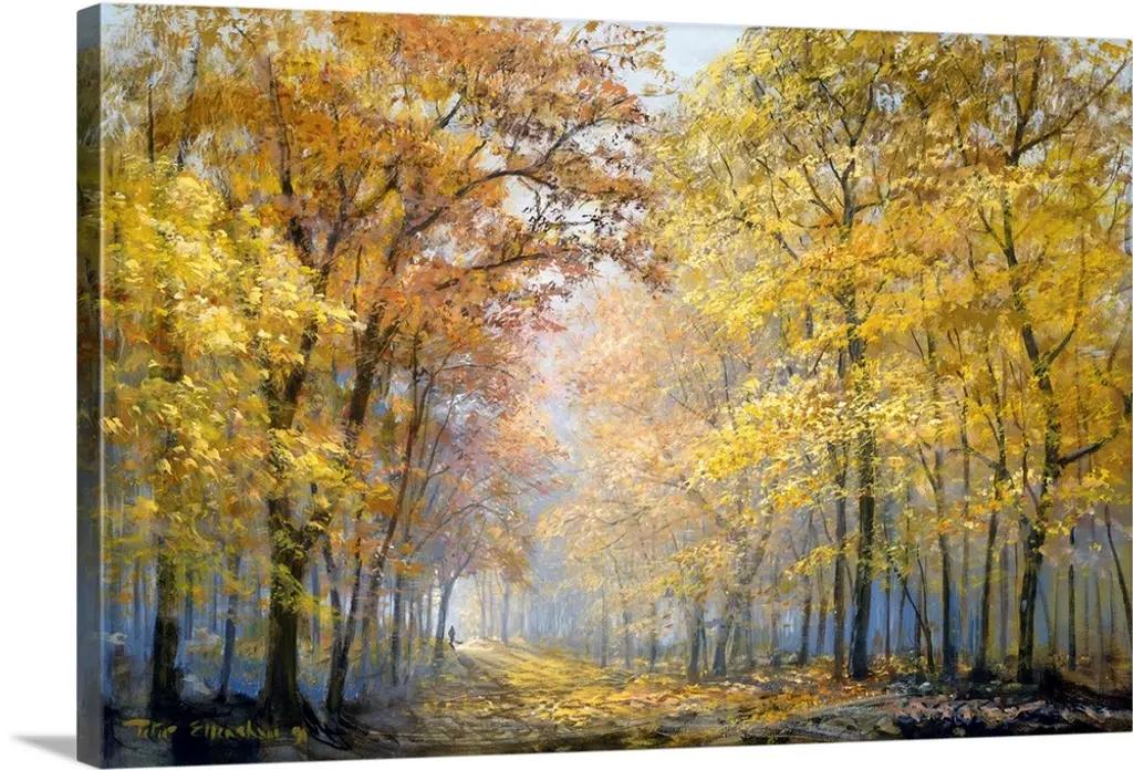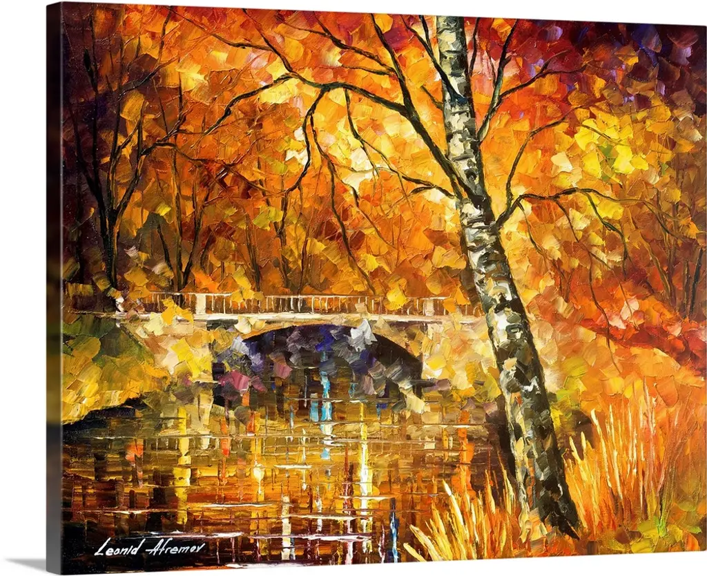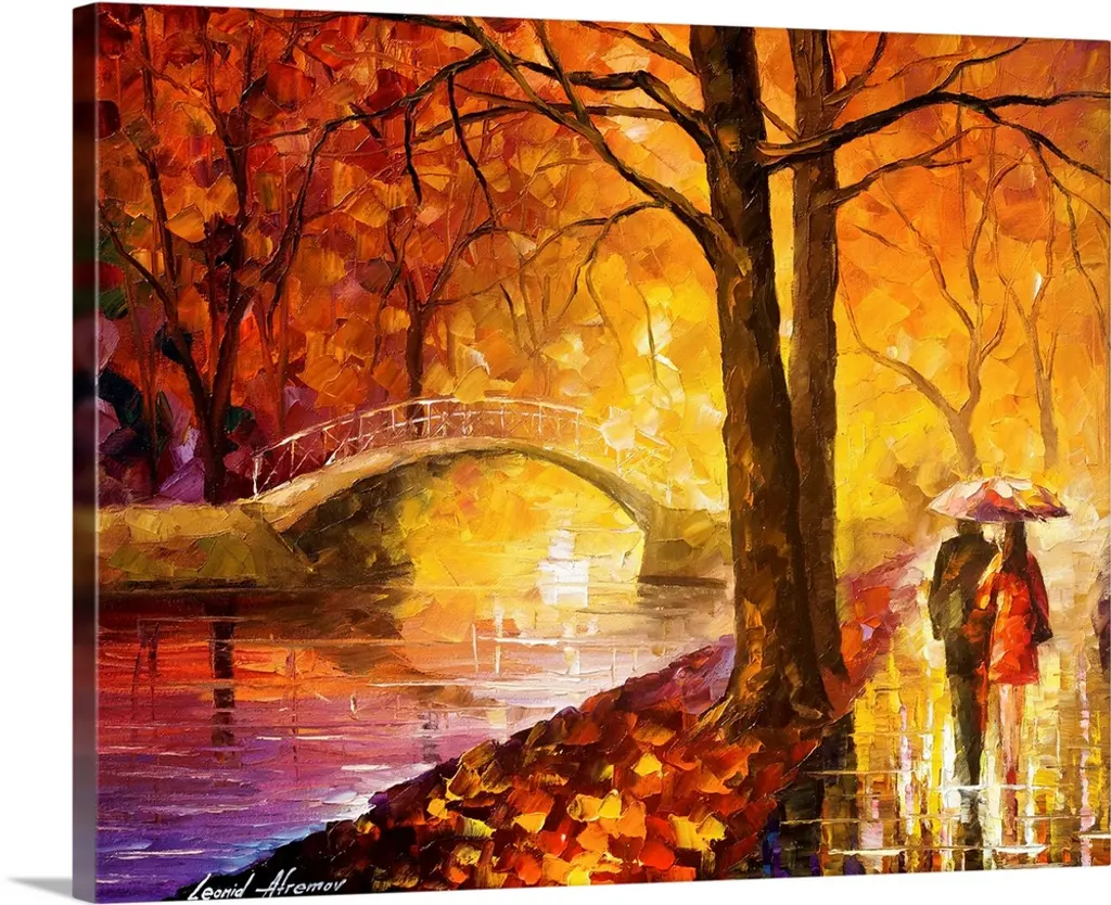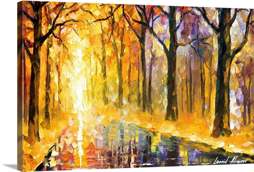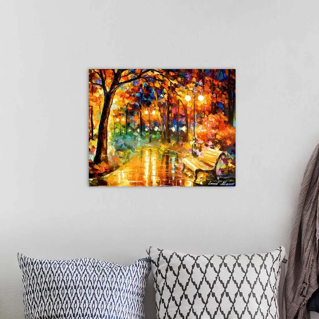 Contemporary colorful painting of wet sidewalk after a rain reflecting the lights and foliage all around.