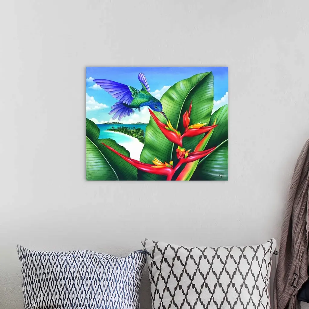 Tropical themed artwork using bright vivid colors to depict the flowers and animals of the environment.