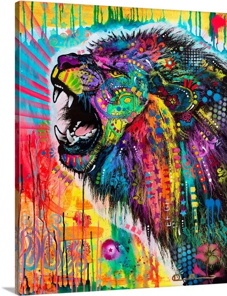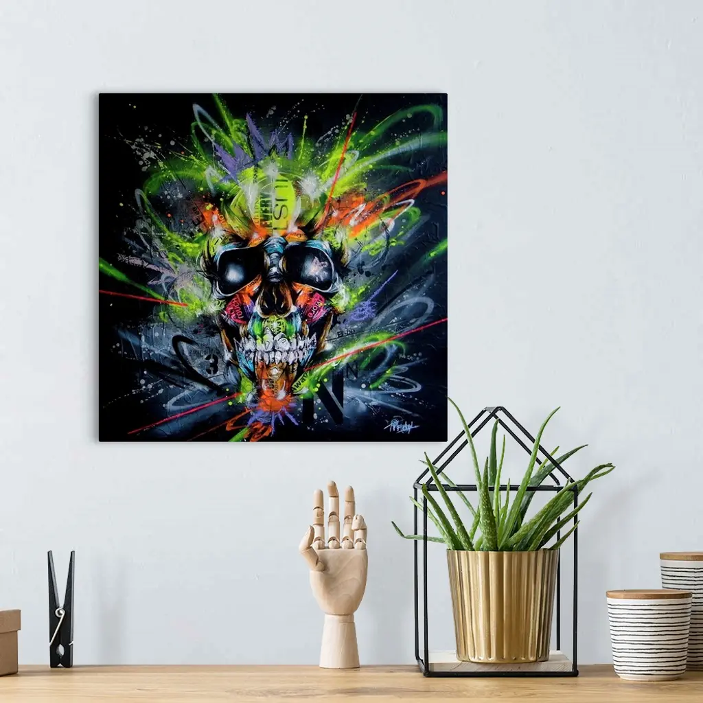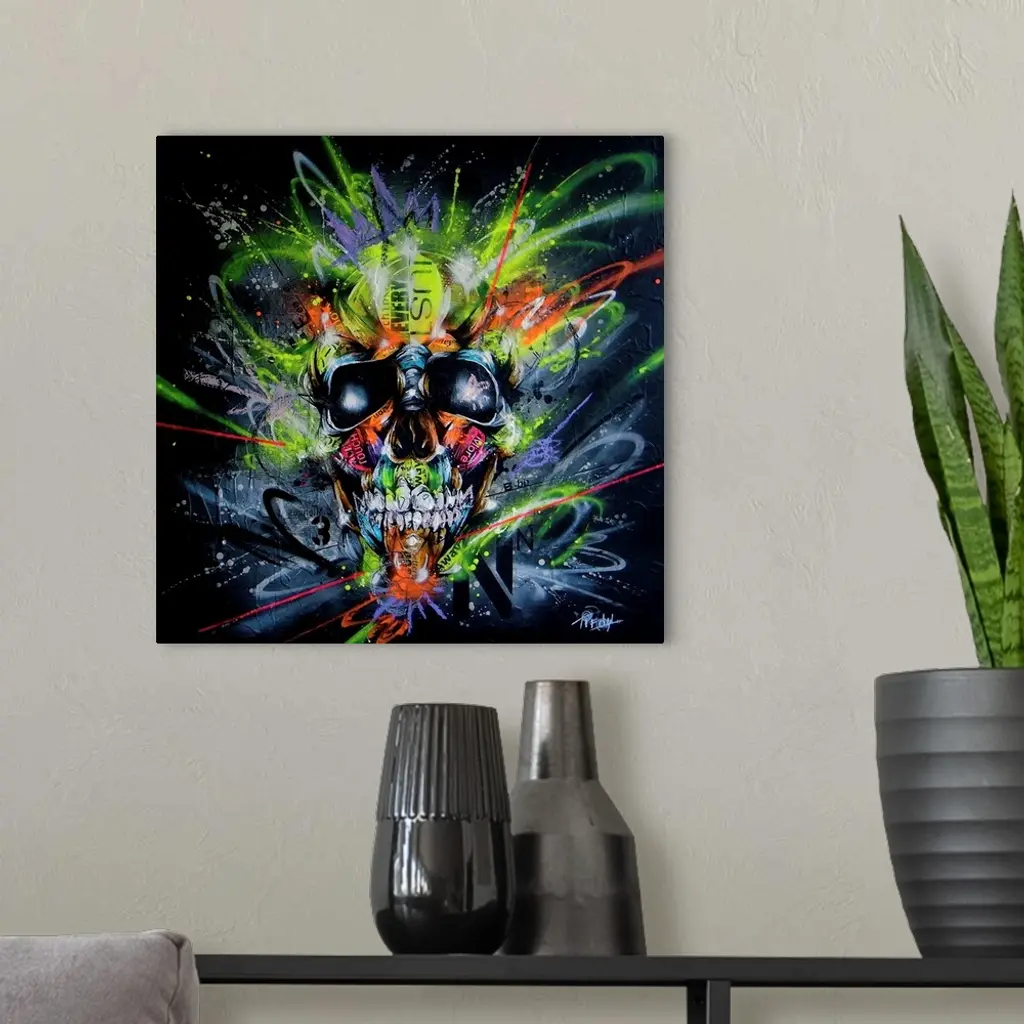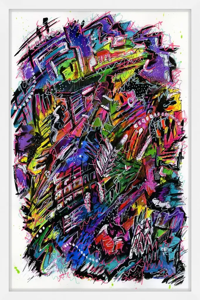Contemporary artwork with a vibrant urban art feel, using wild colors and shapes.