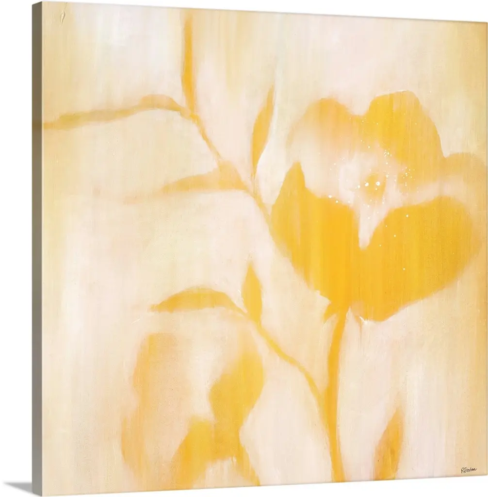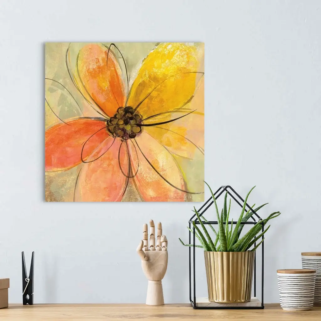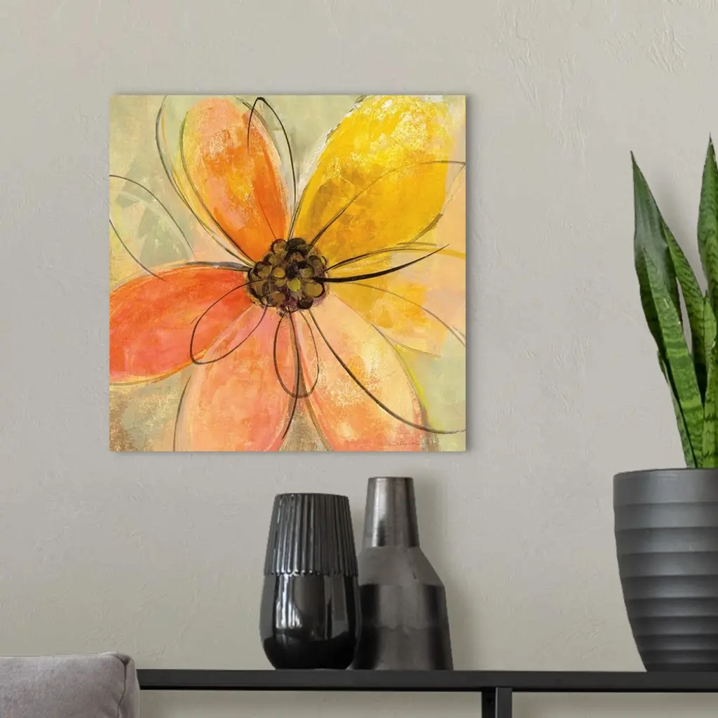 Square painting of a big yellow and pink flower with black outlined petals on a neutral green and brown hued background.