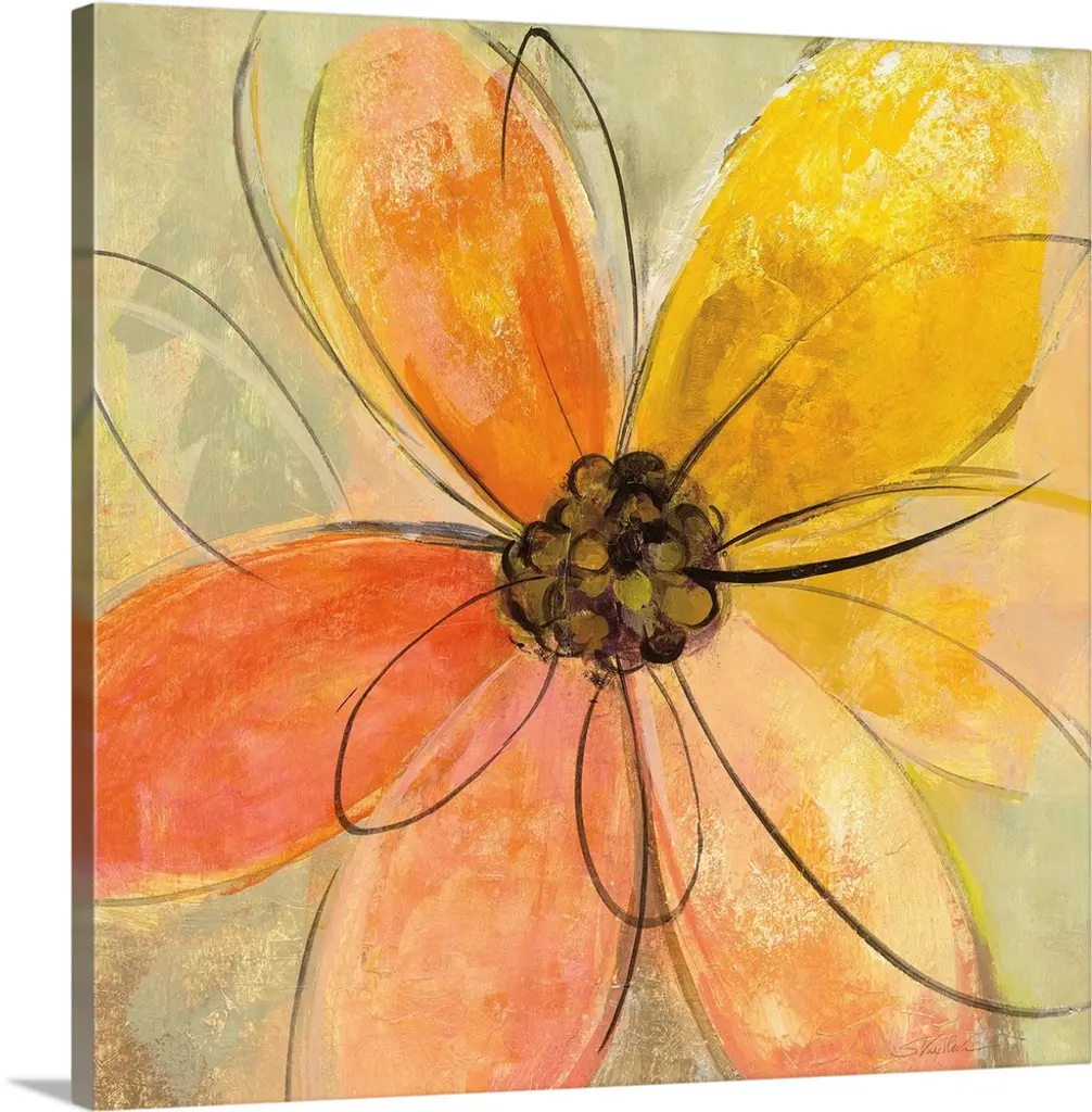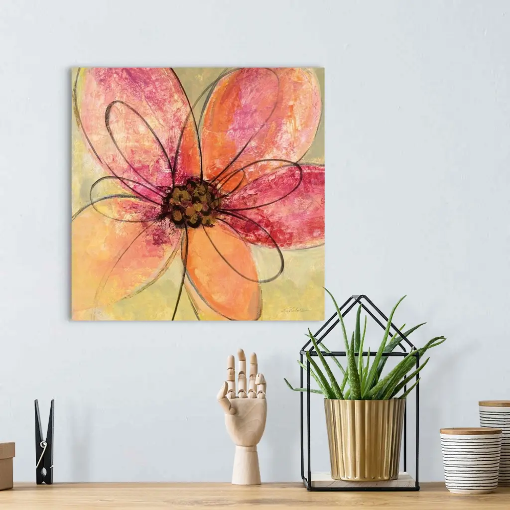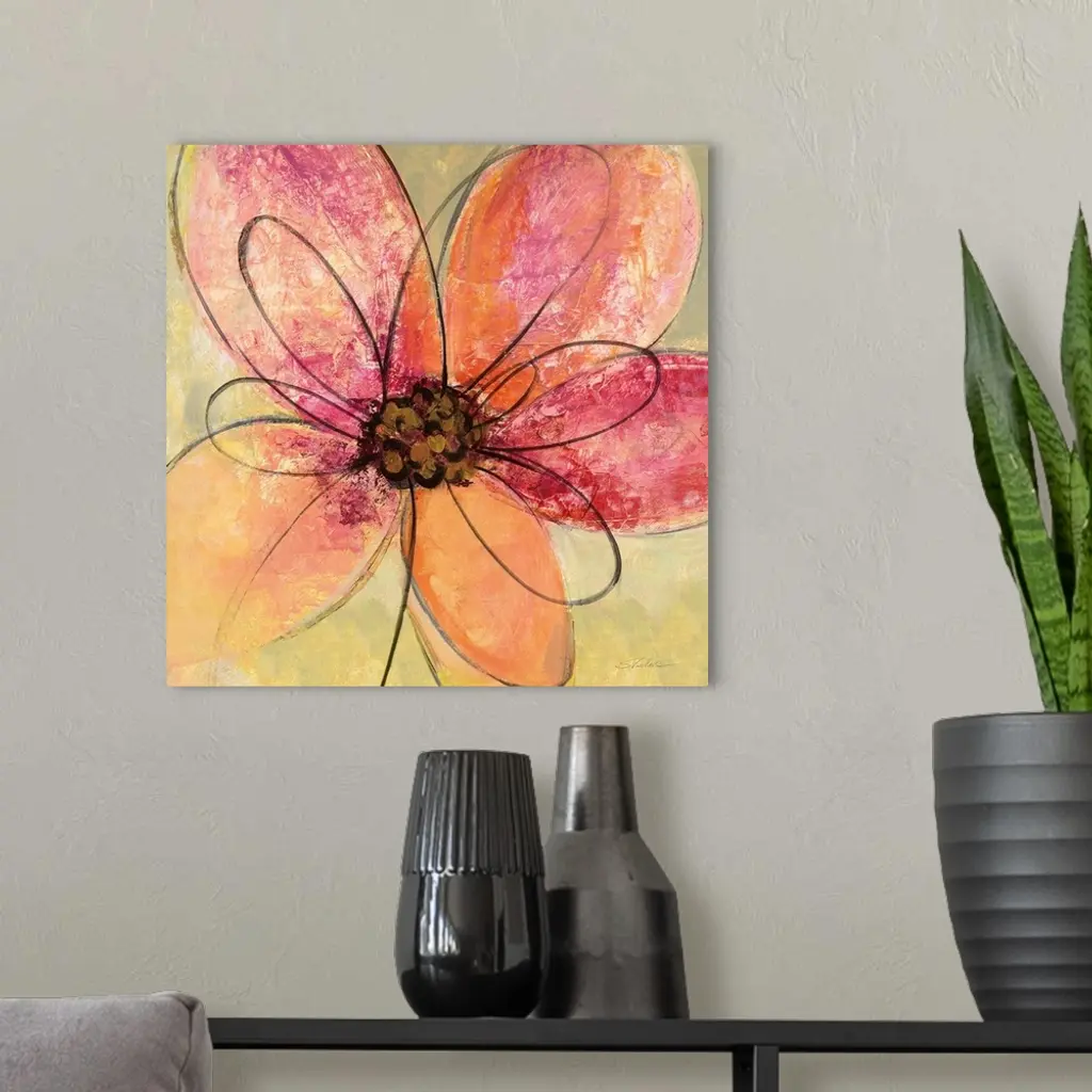 Square painting of a big pink and orange flower with black outlined petals on a neutral green and brown hued background.