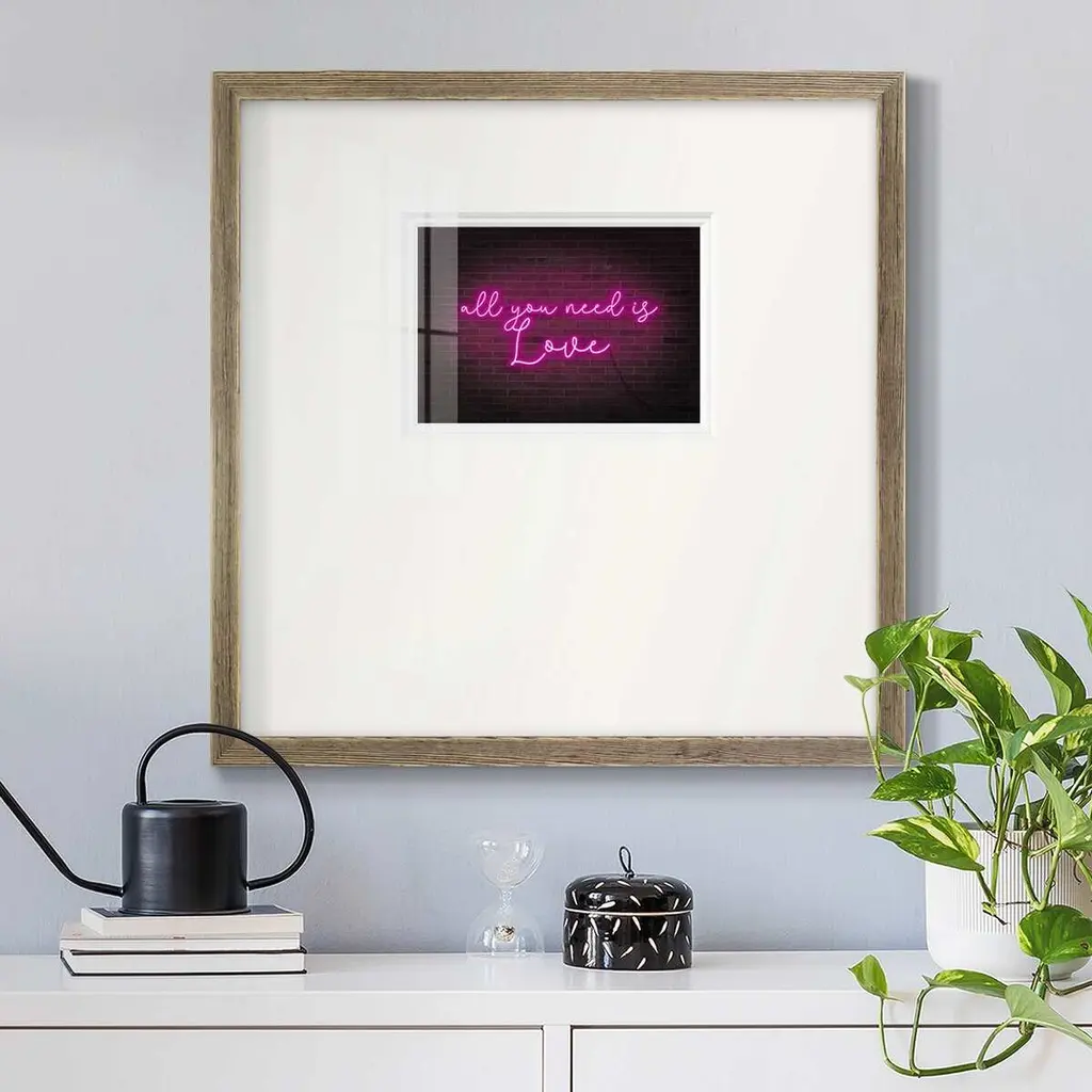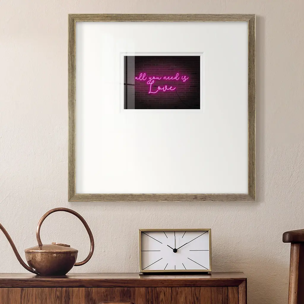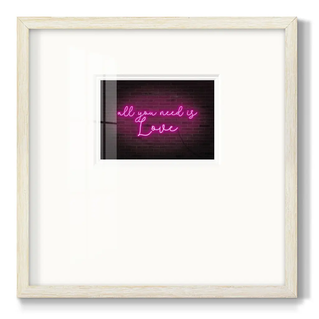 Neon Love IPremium Framed Print A framed cold pressed paper print featuring superior double matting and quality frame. 2 SIZES AVAILABLE 16''X16''' - Overall Size 20''X20''' - Overall Size Each piece is made to order. Each piece comes with hanging hardware. Made in the USA Ready to Hang Giclee Paper Print Plexiglass Beveled Matt Board Double Matte Board