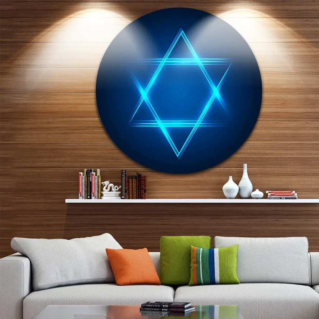 Bring Contemporary Abstraction to your home with this large Circle Metal wall art. This Neon Star of David Metal Artwork makes it the focal point of any room or office. - White Gloss Coating ensures colors are extra vibrant with light reflection.- Aluminum grade Sheet Metal with 1 inch mounting frame on the back giving the illusion that the artwork is floating on the wall..- Mounting Brackets are included along with instructions.- High Quality Digital images are created directly into a glossy aluminum panel producing a stunning and captivating print into the glossy finish of the metal.- Water, Fire and Scratch resistant HD Aluminum panels.- Looks better than any photo paper and guaranteed to last at least 20 years- Easy to clean with a microfiber cloth. Colors are far superior to regular Canvas Art. - Easy to Hang