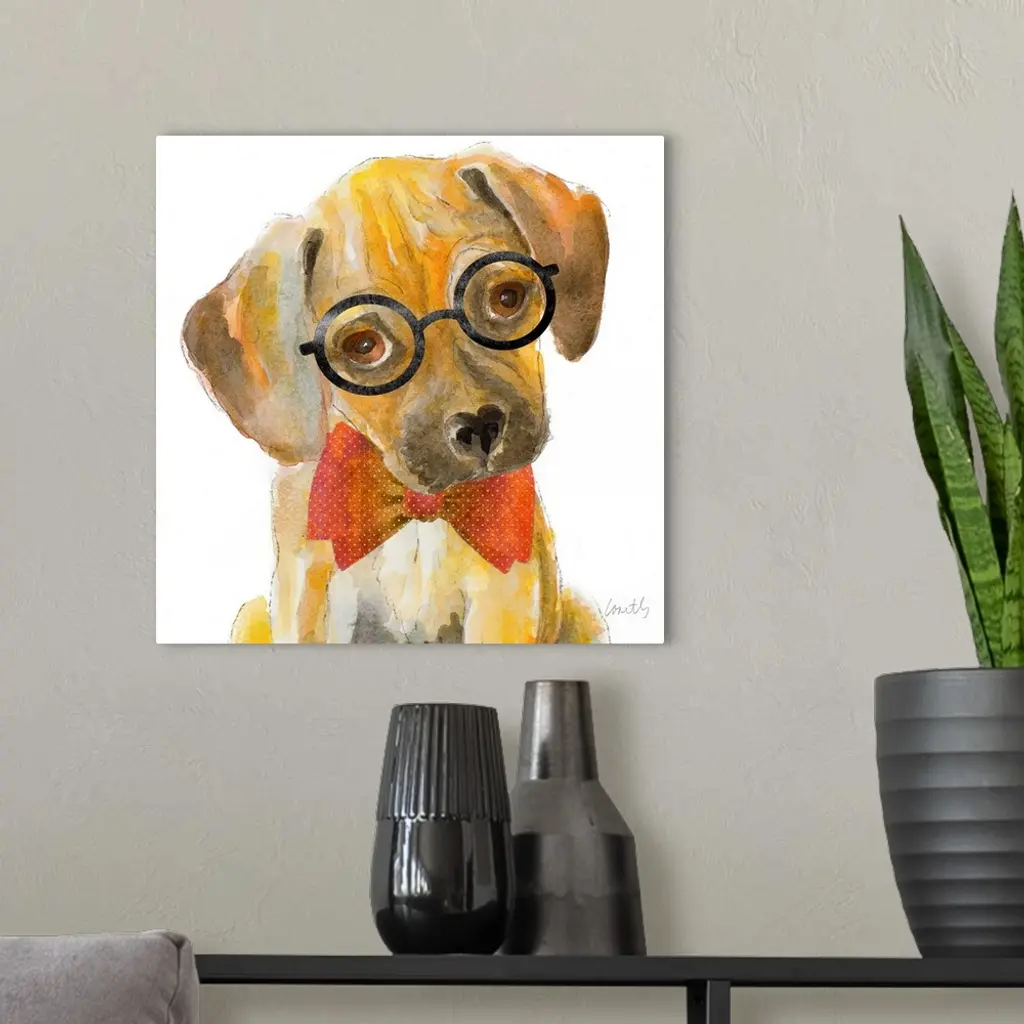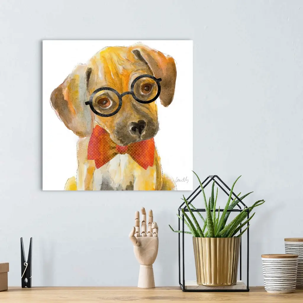 Square watercolor painting of a puppy wearing circular framed glasses and a red bow tie.