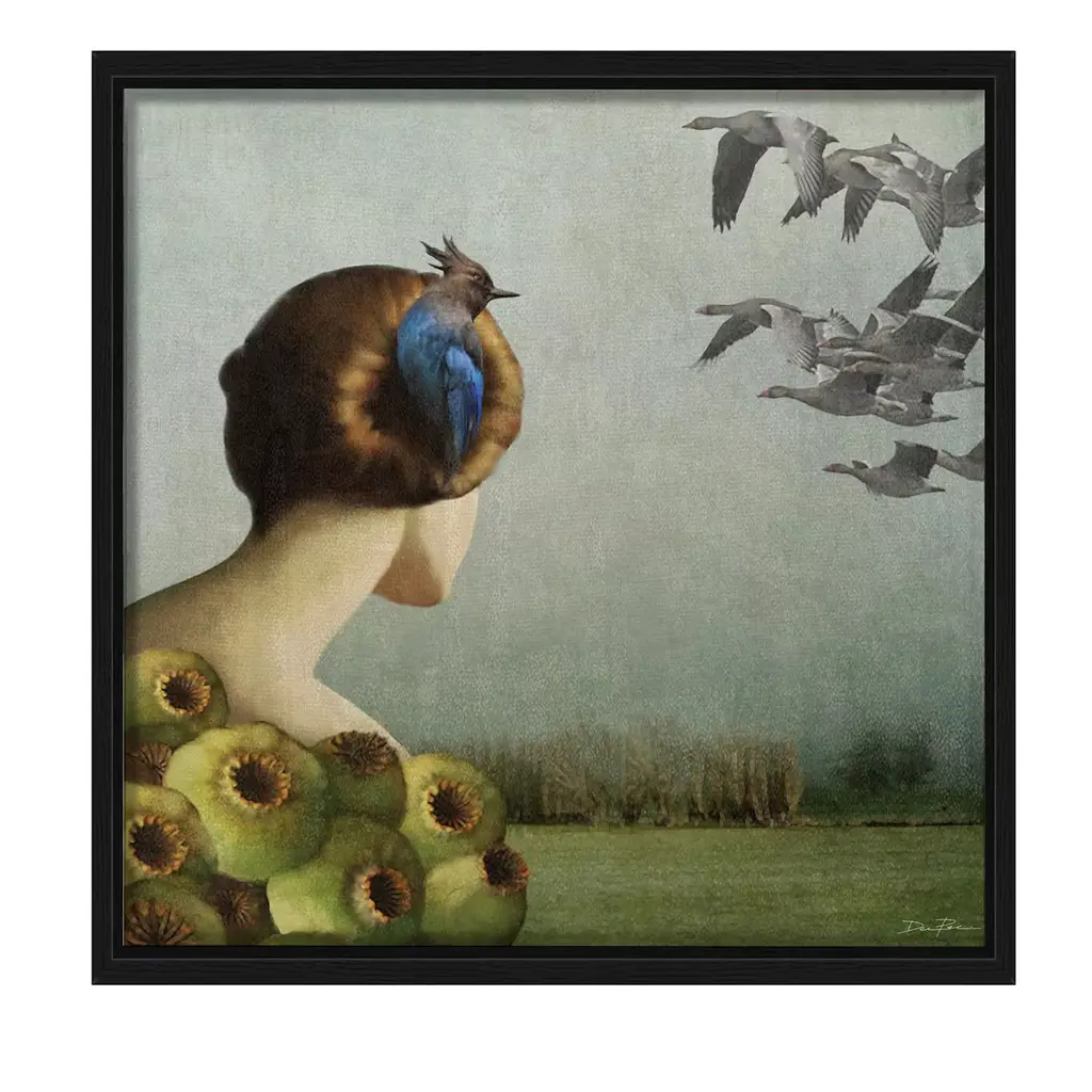 This Pop-Surrealist digital painting depicts a blue woodpecker nestled in a woman's hair, lost in happy thoughts. Viewed from behind, the female figure looks out at the leaden horizons of fate, punctuated by a flock of gray geese, the messengers of dark omens. Basswood box frame. Signed, numbered Limited Edition with "Certificate of Authenticity".Year of Creation: 2015Edition Number: 1/300Artist’s Signature: Printed on the Canvas + original signature on Limited Edition Certificate which will be given with the purchase of the itemCondition: NewMaterials: Cotton canvas, basswood box frame, dried fir structure