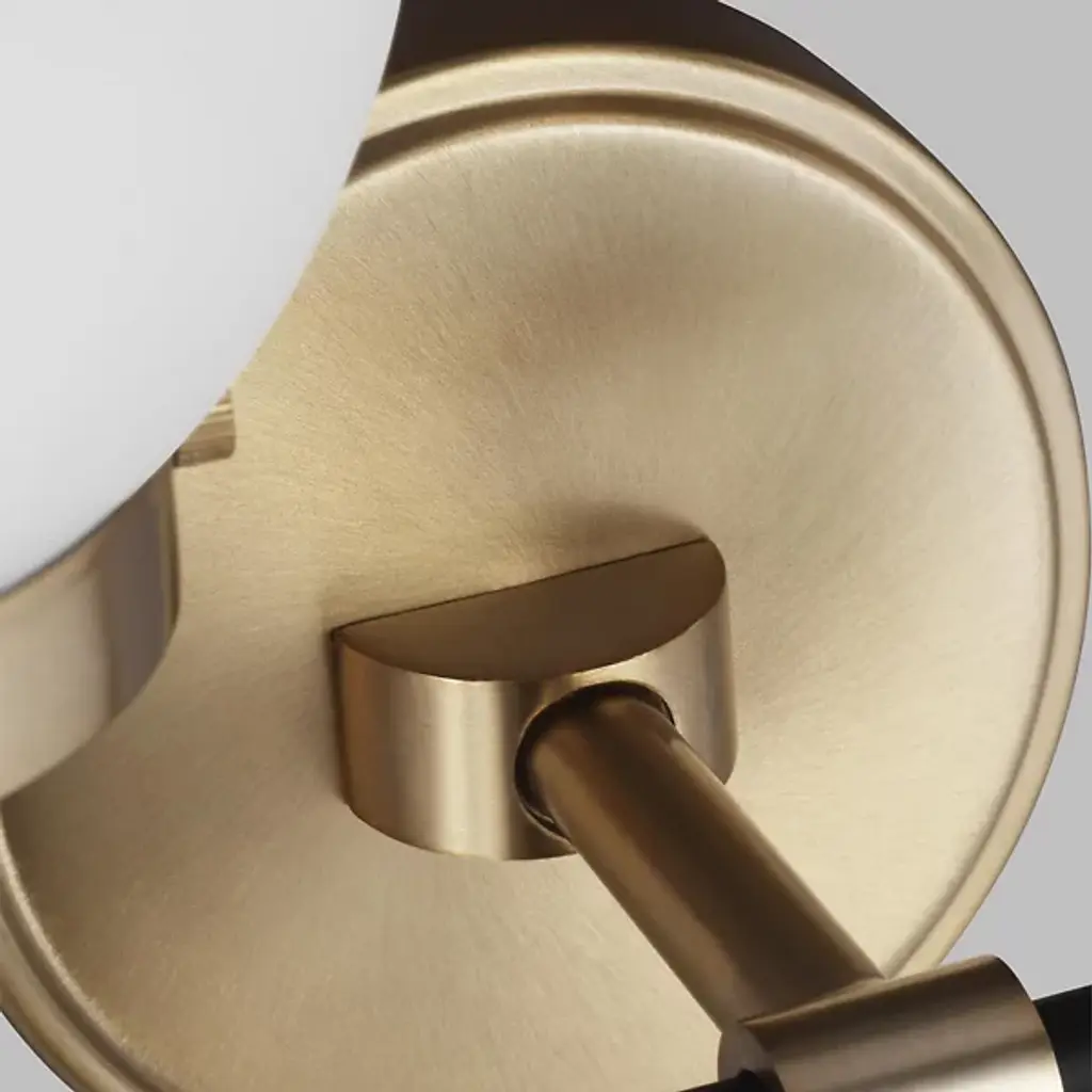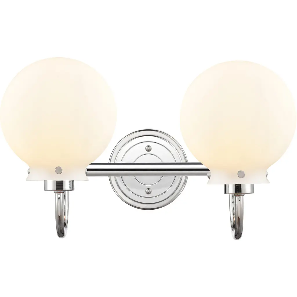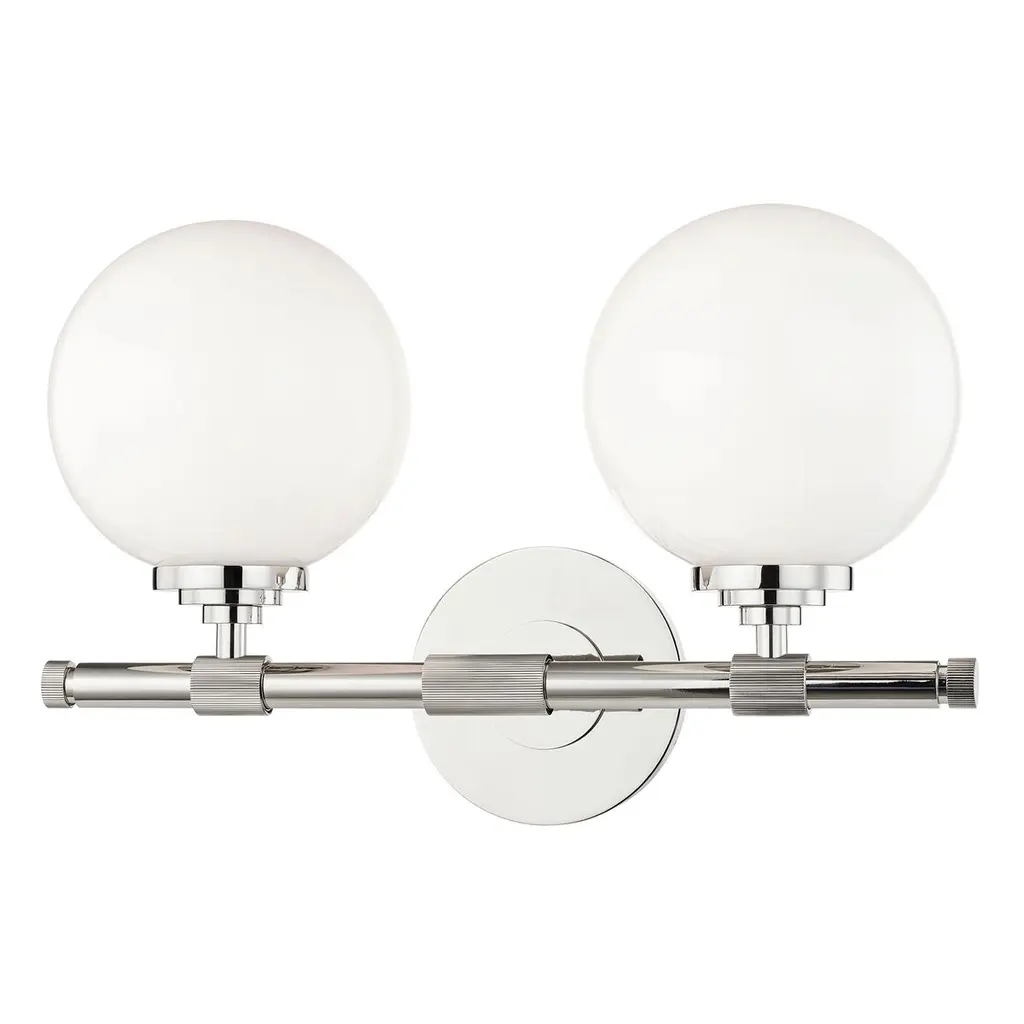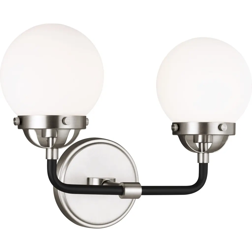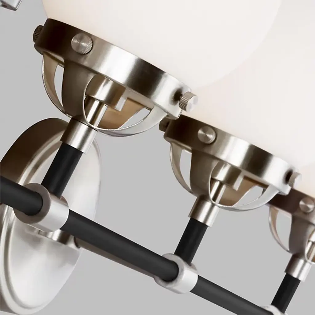 Bask in the generous wash of ambient light from the ever-elegant Nette Vanity Light from Alder & Ore. Securely anchored by a smooth, stepped-disc wall mount, it uses a short but robust stem to hold out a matte-textured horizontal rod. This part of the fixture is flexible, easily oriented to suspend its lighting downward for more direct illumination, or hold it up for an indirect glow. Each damp-listed lamp is set inside a globe shade of etched white glass and held in place by a steel dome collar that offers a tasteful contrast with both the glass and matte rod around it.