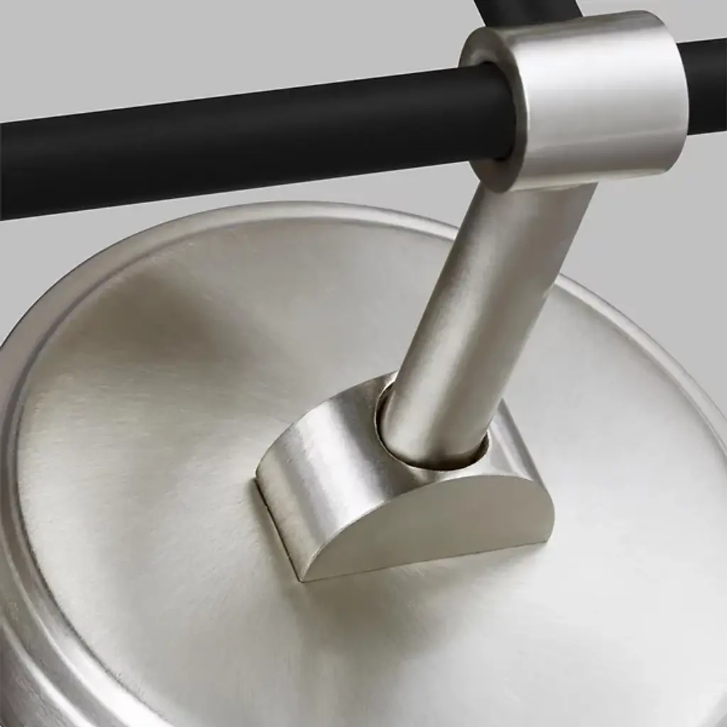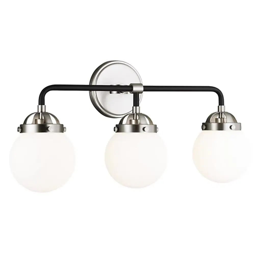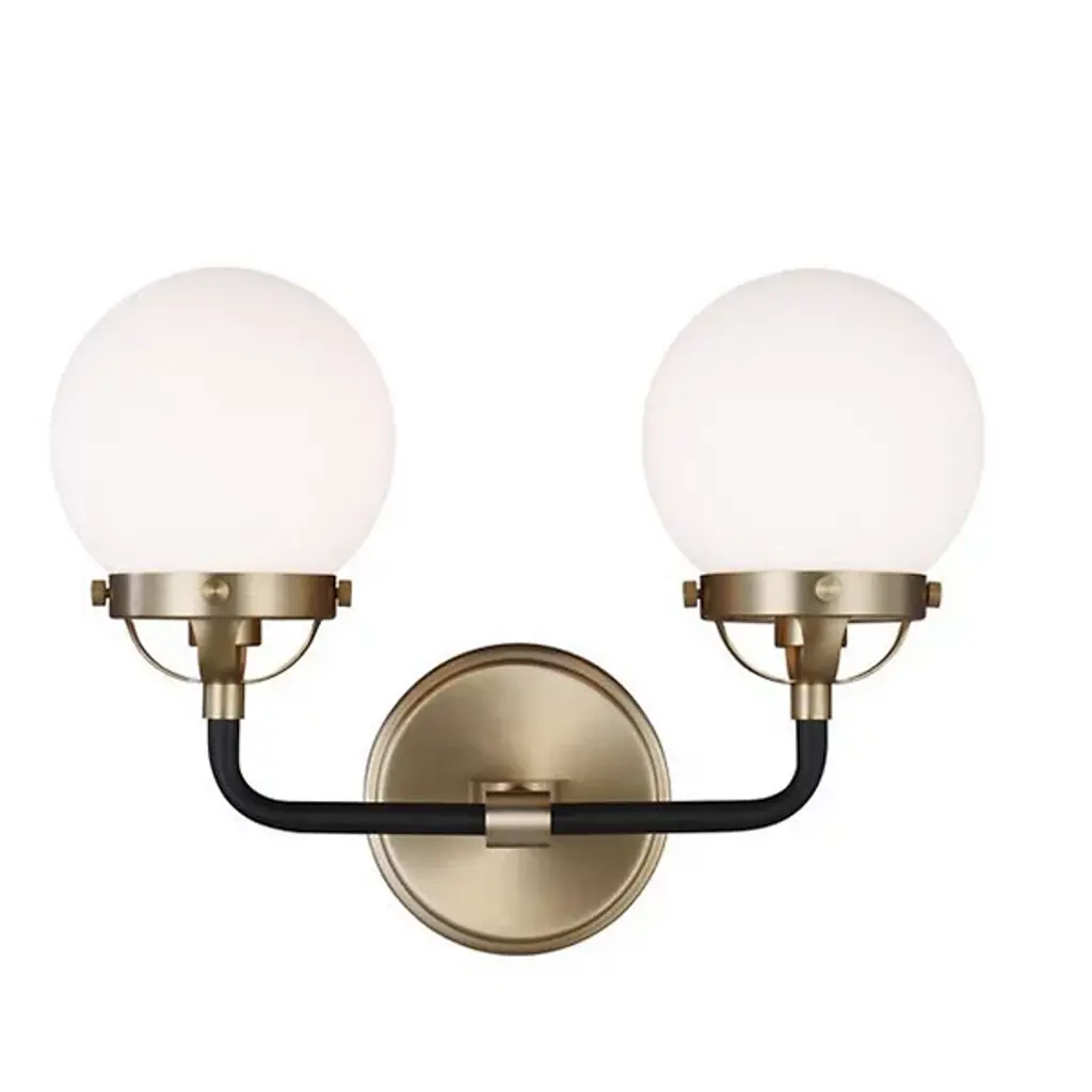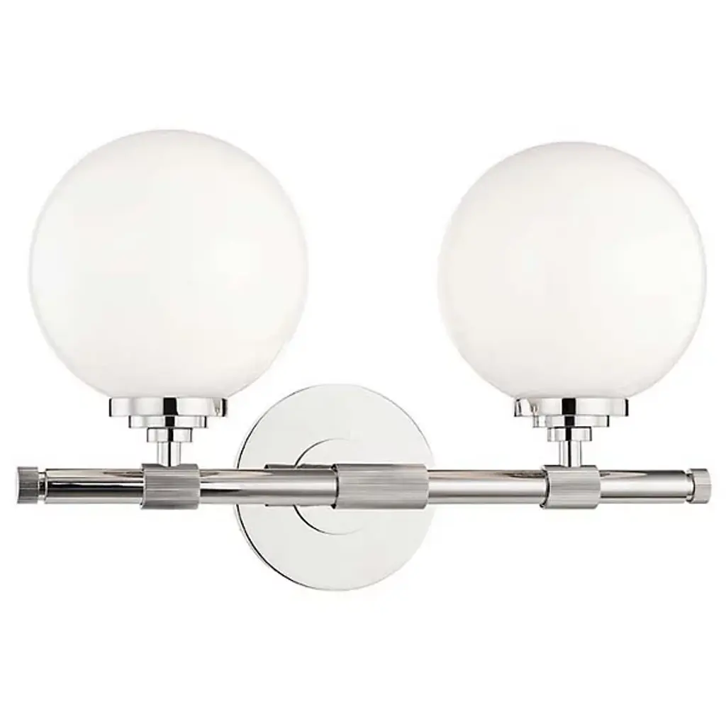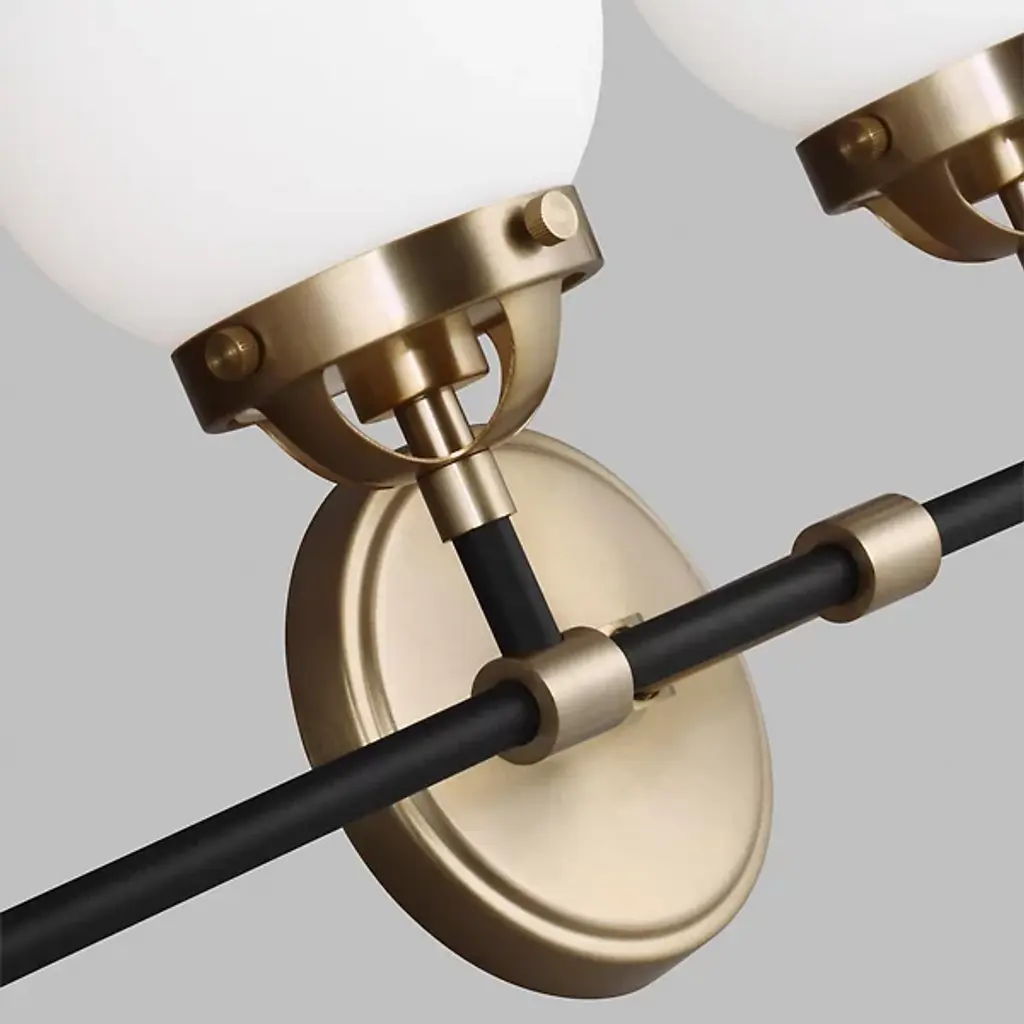Bask in the generous wash of ambient light from the ever-elegant Nette Vanity Light from Alder & Ore. Securely anchored by a smooth, stepped-disc wall mount, it uses a short but robust stem to hold out a matte-textured horizontal rod. This part of the fixture is flexible, easily oriented to suspend its lighting downward for more direct illumination, or hold it up for an indirect glow. Each damp-listed lamp is set inside a globe shade of etched white glass and held in place by a steel dome collar that offers a tasteful contrast with both the glass and matte rod around it.