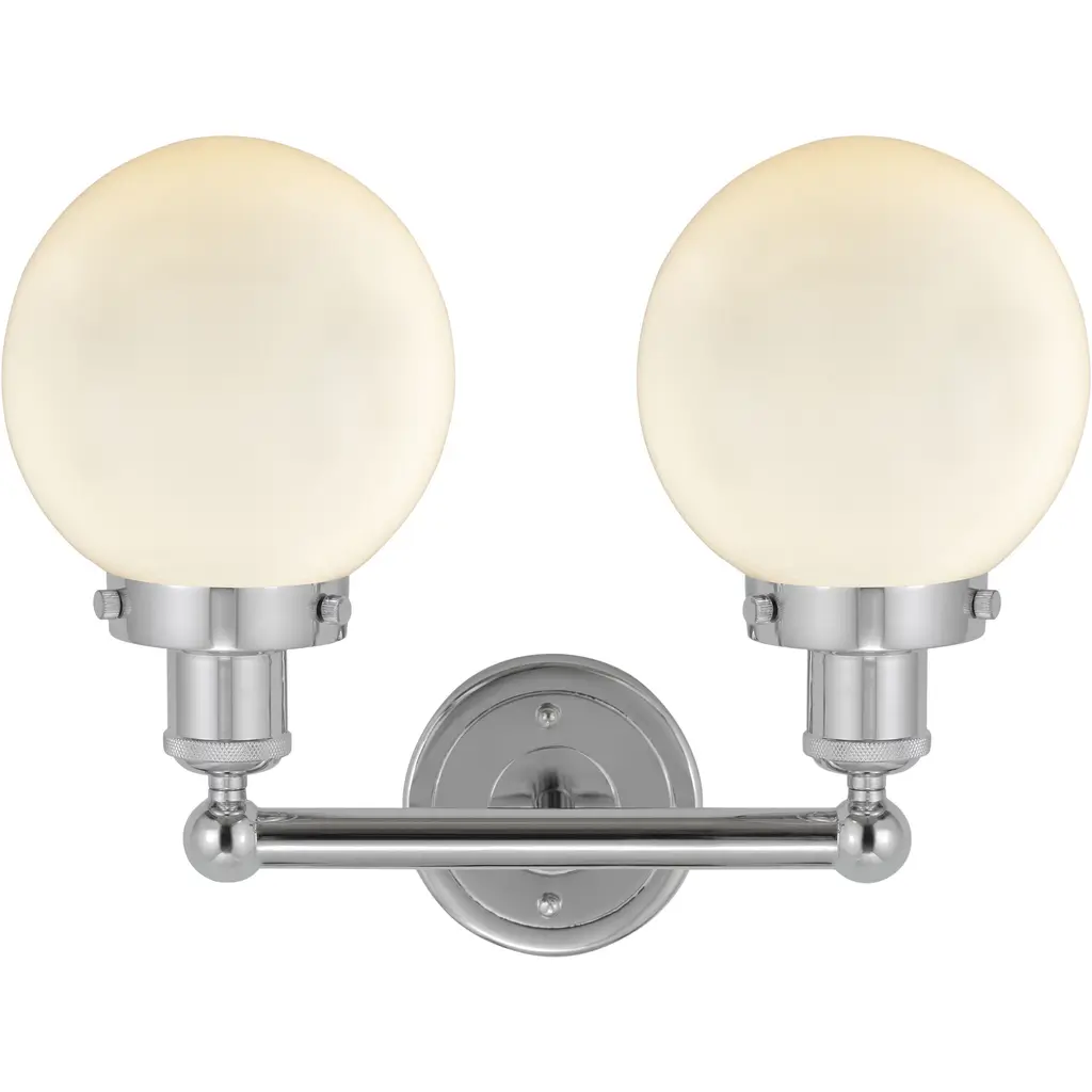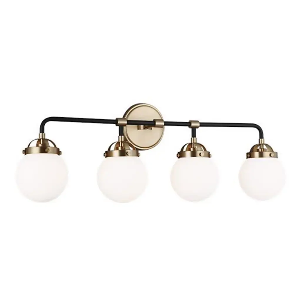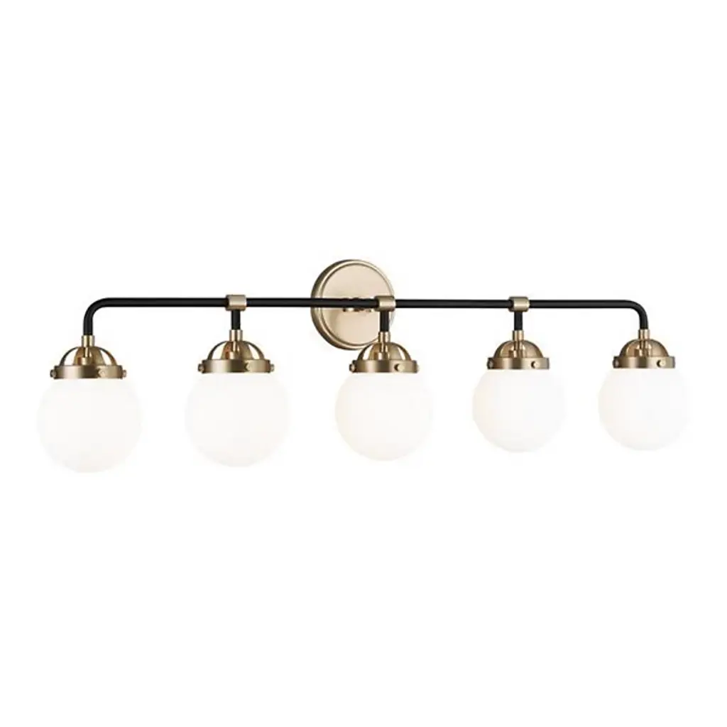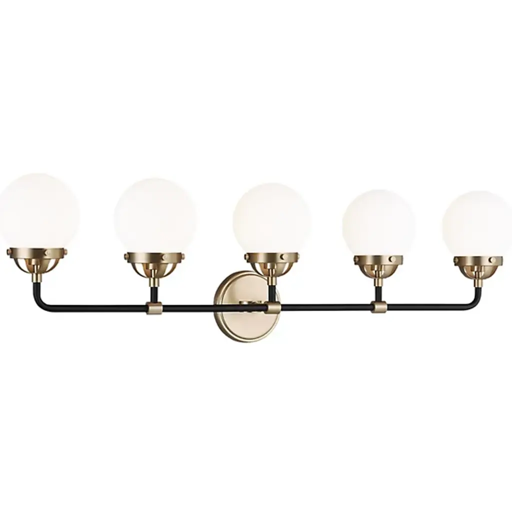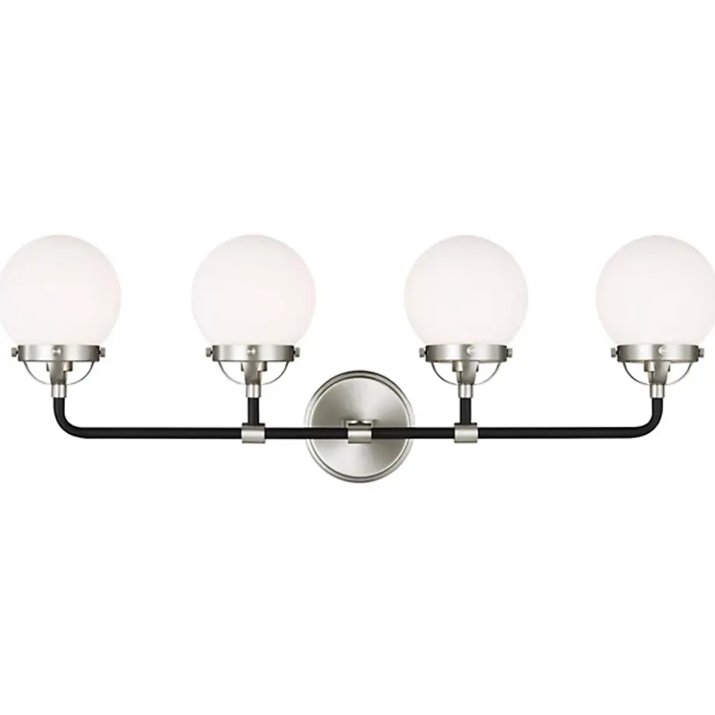 Bask in the generous wash of ambient light from the ever-elegant Nette Vanity Light from Alder & Ore. Securely anchored by a smooth, stepped-disc wall mount, it uses a short but robust stem to hold out a matte-textured horizontal rod. This part of the fixture is flexible, easily oriented to suspend its lighting downward for more direct illumination, or hold it up for an indirect glow. Each damp-listed lamp is set inside a globe shade of etched white glass and held in place by a steel dome collar that offers a tasteful contrast with both the glass and matte rod around it.