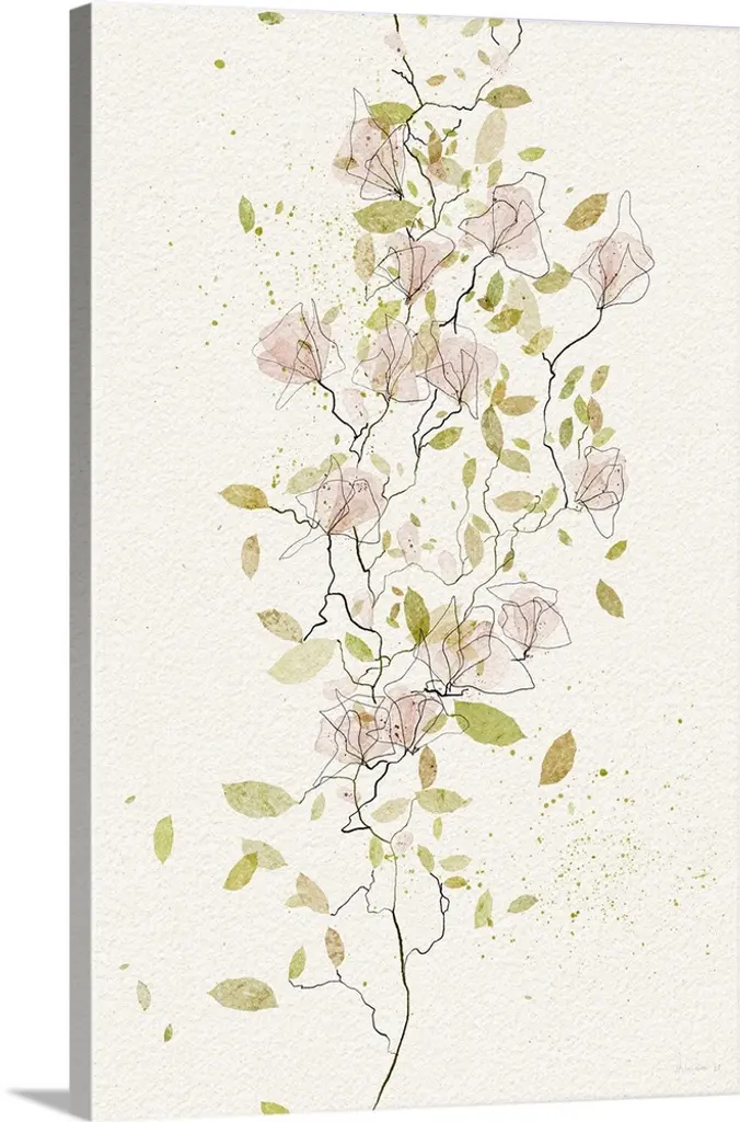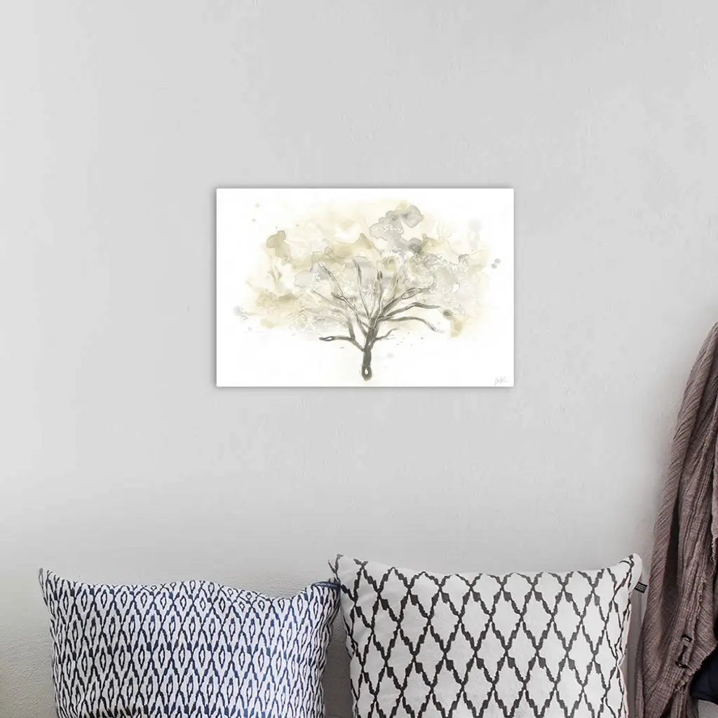 Watercolor painting of a tree in watered down brown shades with blurred spots.
