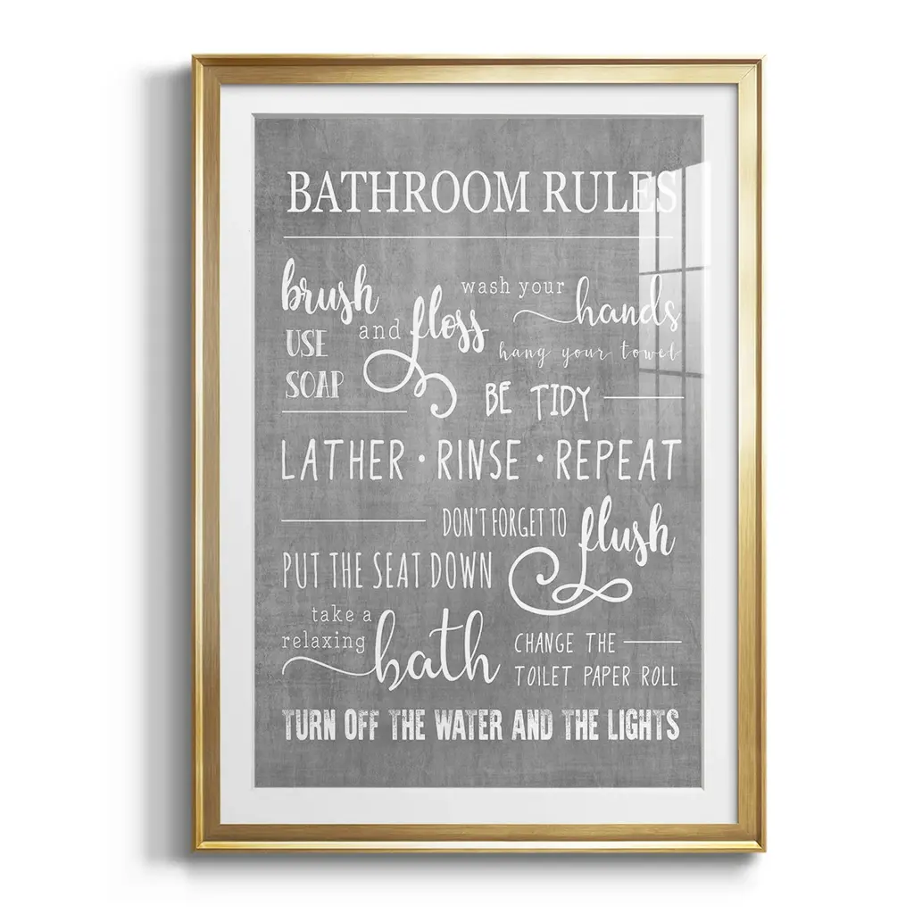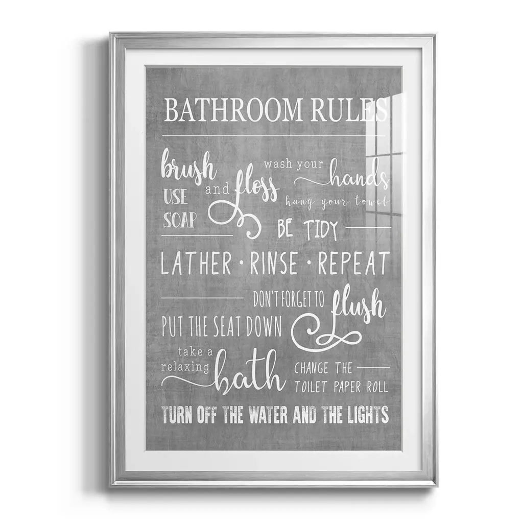 Neutral Bathroom Rules Premium Framed Print - Ready to Hang A Premium Framed Print created to last. Framed in distressed wood and available in an array of sizes and colors Featuring a beveled a solid wood stretcher bar, each piece comes ready to hand 4 SIZES AVAILABLE 30.5''X42.5'' - Overall Size 26.5'X36.5'' - Overall Size 22.5''x30.5'' - Overall Size 18.5''x24.5'' - Overall Size Each piece is made to order. Each piece comes with hanging hardware. Made in the USA Ready to Hang Giclee Paper Print Acrylic Glass Beveled Matt Board