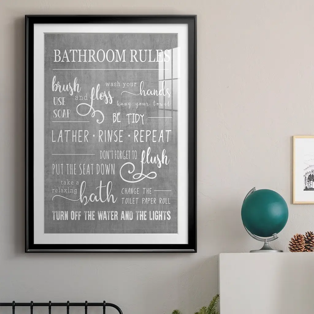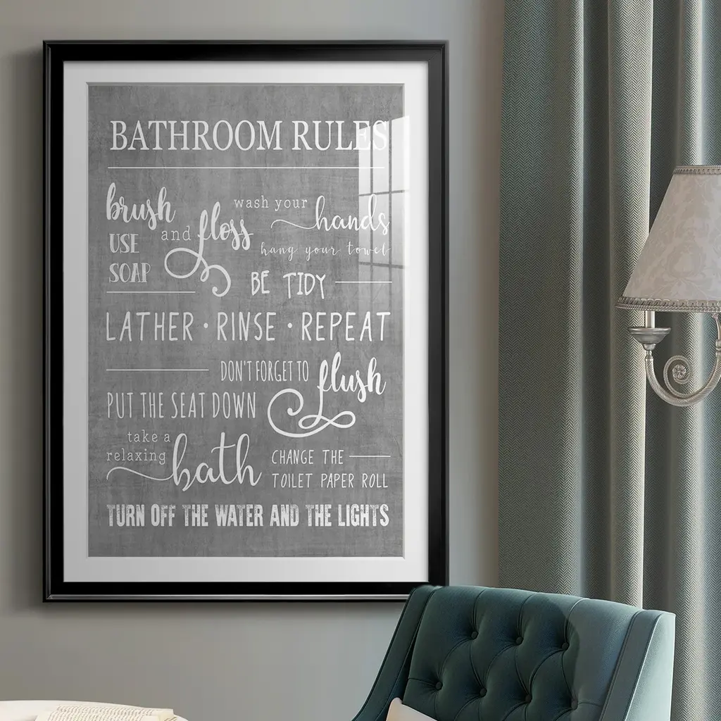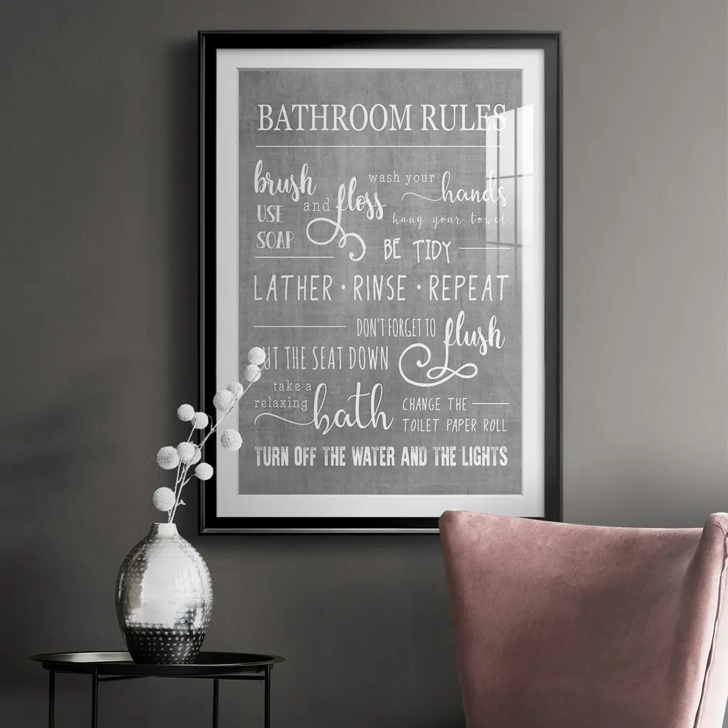 Neutral Bathroom Rules Premium Framed Print - Ready to Hang A Premium Framed Print created to last. Framed in distressed wood and available in an array of sizes and colors Featuring a beveled a solid wood stretcher bar, each piece comes ready to hand 4 SIZES AVAILABLE 30.5''X42.5'' - Overall Size 26.5'X36.5'' - Overall Size 22.5''x30.5'' - Overall Size 18.5''x24.5'' - Overall Size Each piece is made to order. Each piece comes with hanging hardware. Made in the USA Ready to Hang Giclee Paper Print Acrylic Glass Beveled Matt Board