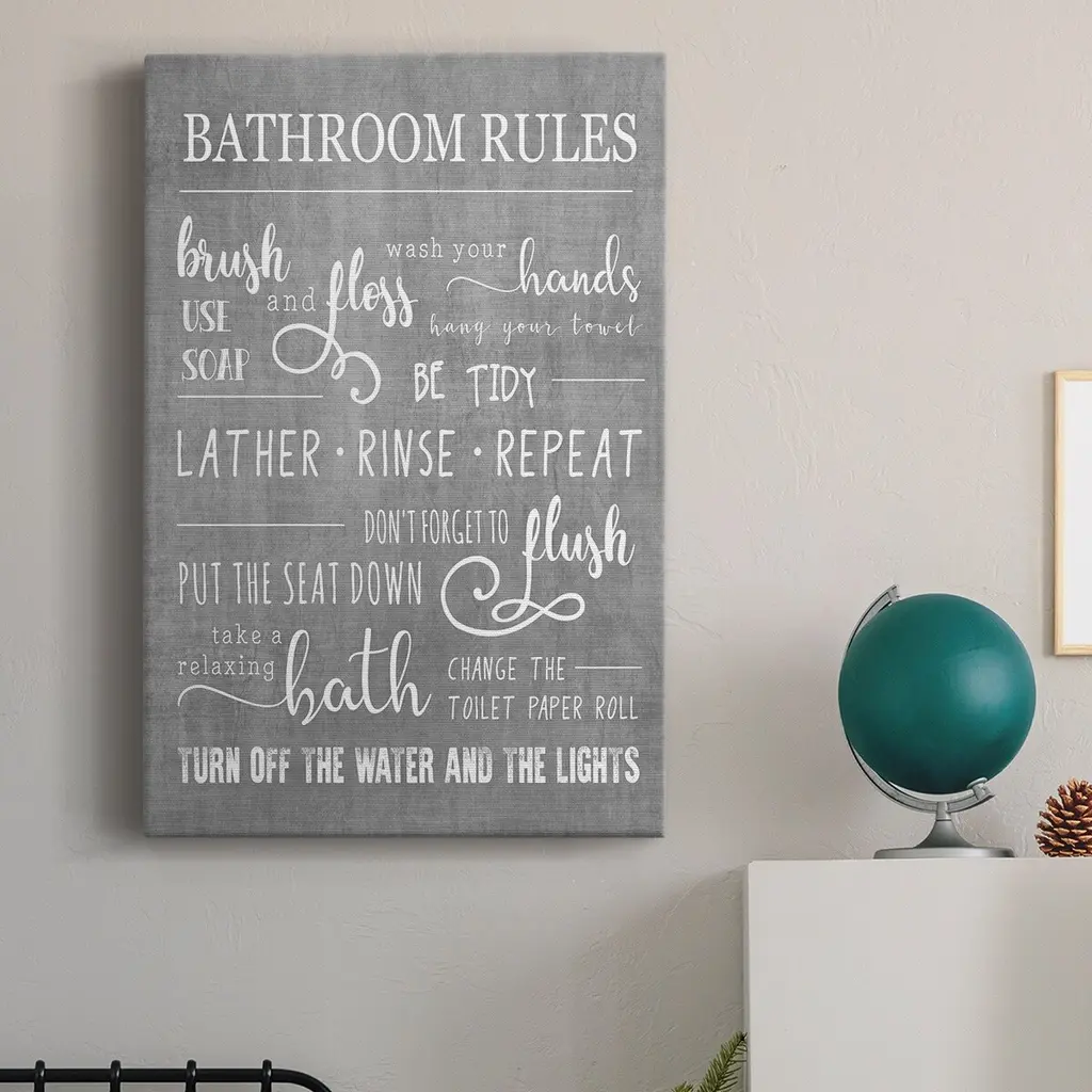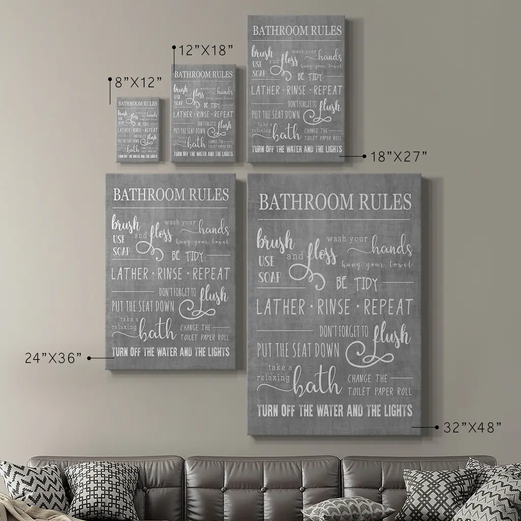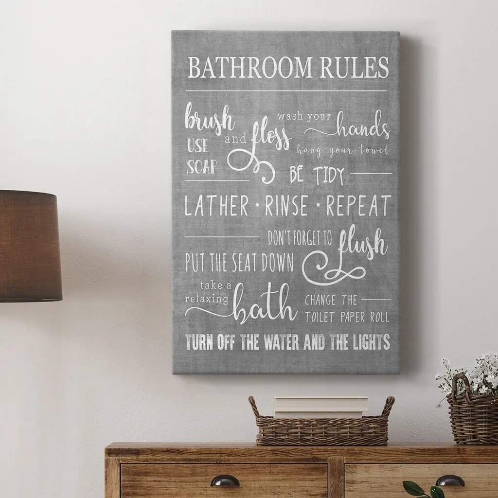 Neutral Bathroom Rules Premium Gallery Wrapped Canvas - Ready to Hang A premium hand stretched gallery wrapped canvas print created to last. Featuring a beveled a solid wood stretcher bar, each piece comes ready to hand 6 SIZES AVAILABLE 8''X12'' - Overall Size 12''X18'' - Overall Size 18''X27'' - Overall Size 24''x36'' - Overall Size 32''x48'' - Overall Size 40''x60'' - Overall Size Each piece is made to order. Built to Last Each piece comes ready to hang Solid wood stretcher Fade and Water resistant Made domestically