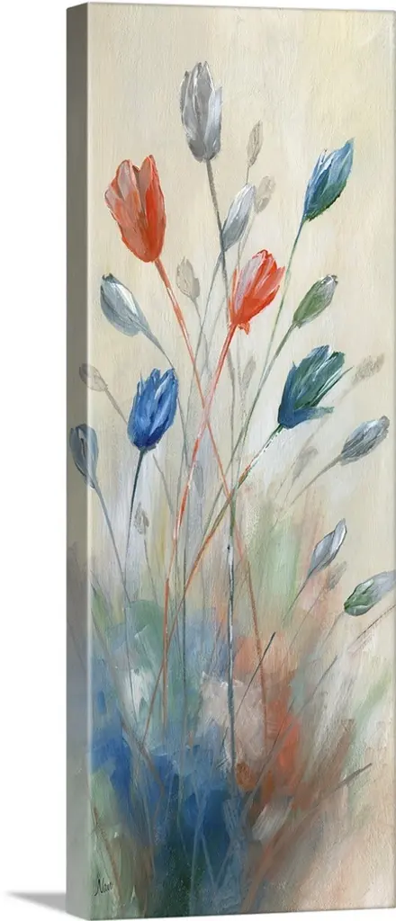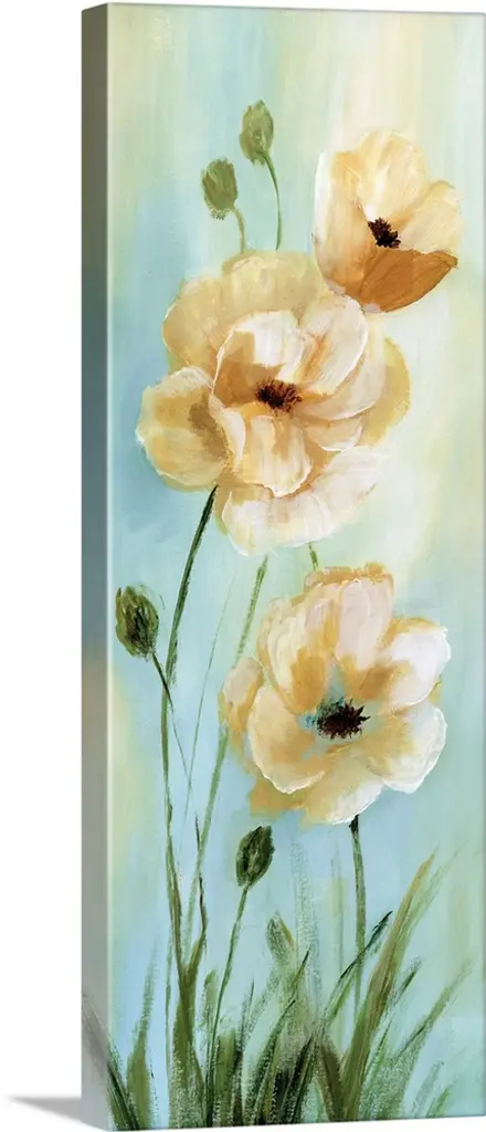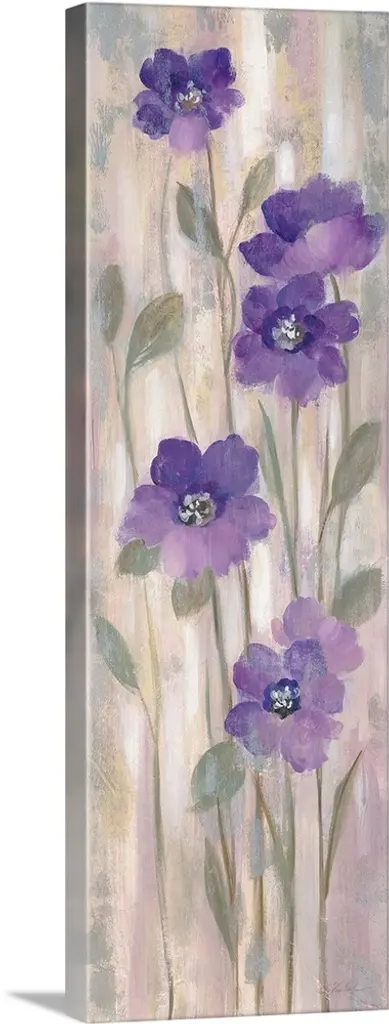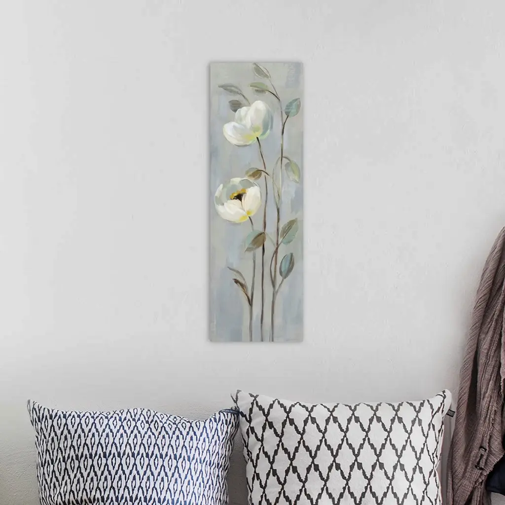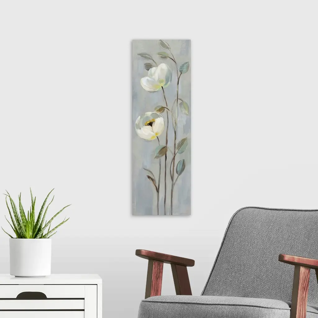 Tall cool toned painting of white flowers with long, thin stems on a grey background.