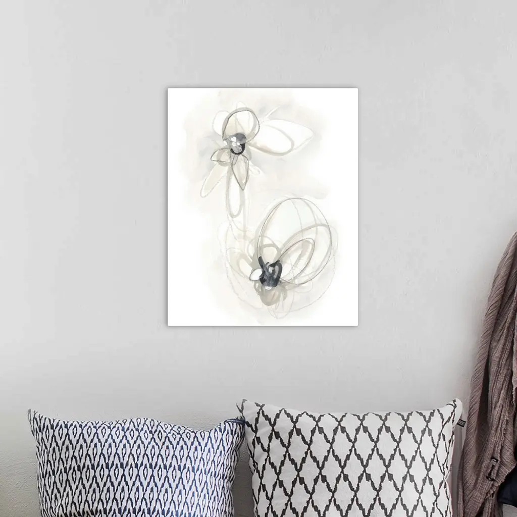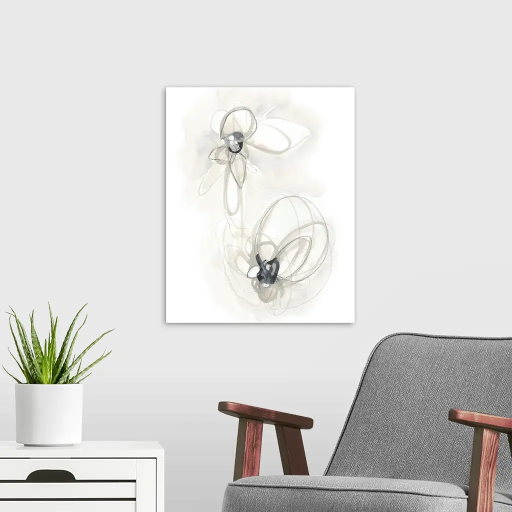 Circular brush strokes construct gestural flowers in neutral tones in this contemporary artwork.