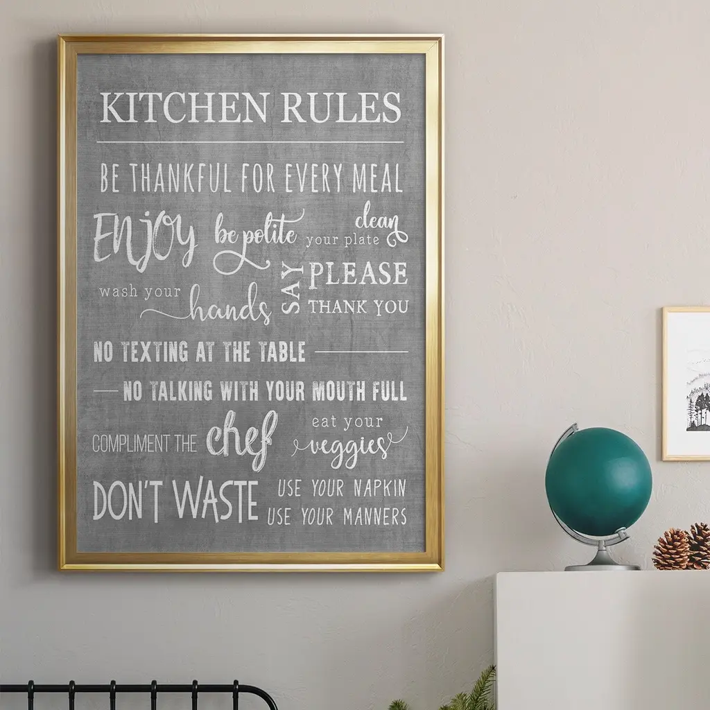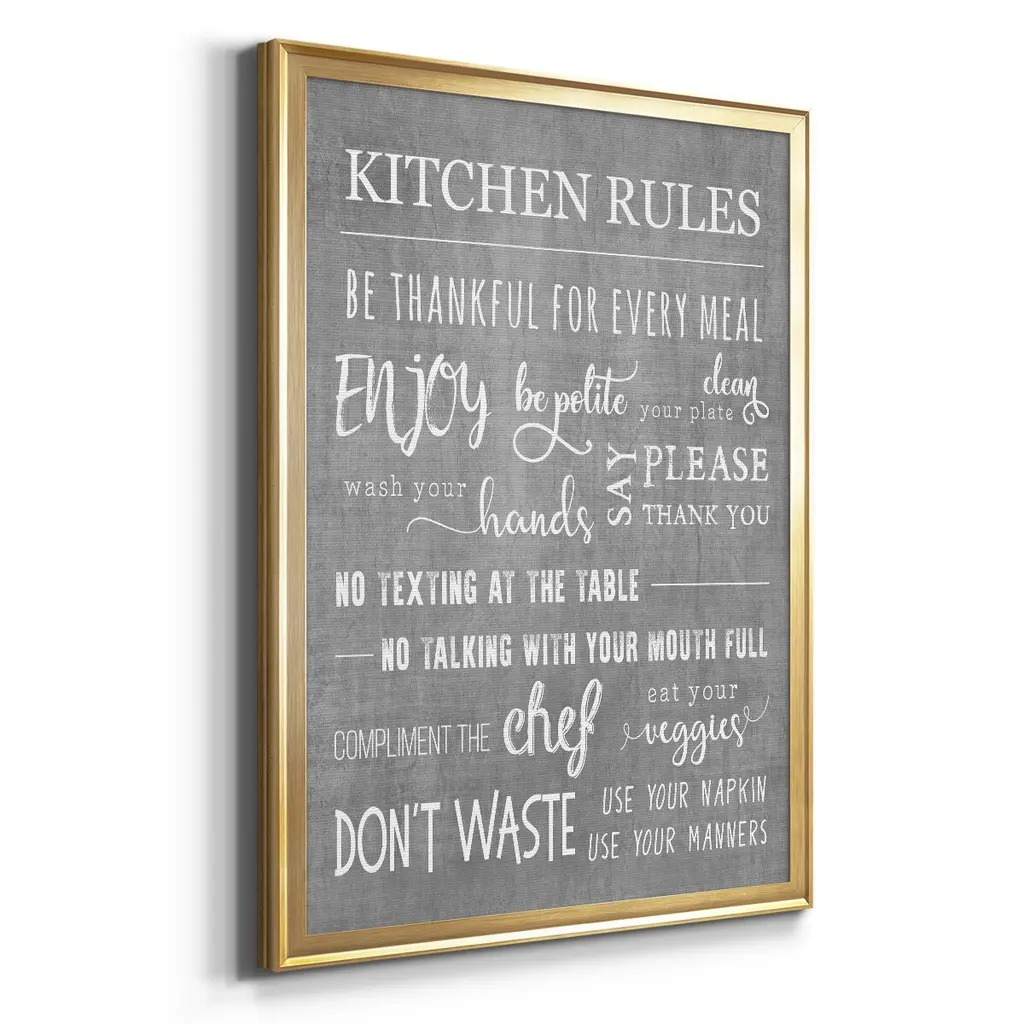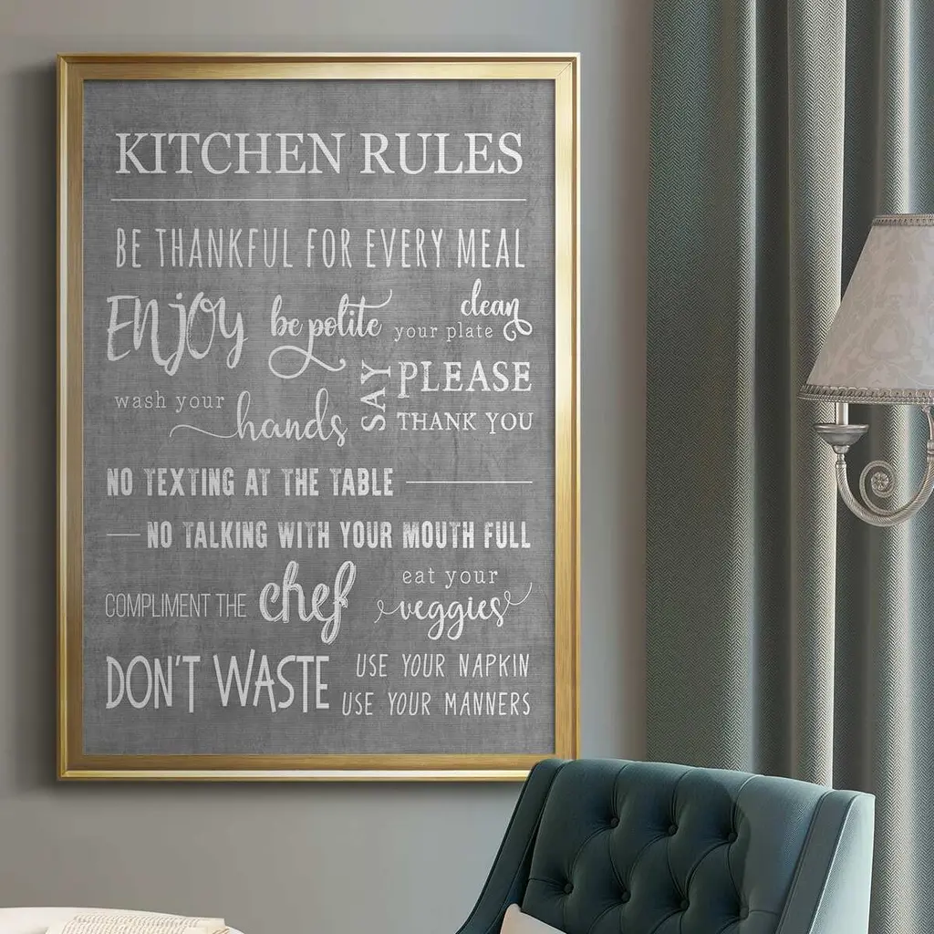 Neutral Kitchen Rules Premium Framed Print - Ready to Hang A Premium Framed Print created to last. Framed in distressed wood and available in an array of sizes and colors Featuring a beveled a solid wood stretcher bar, each piece comes ready to hand 4 SIZES AVAILABLE 30.5''X42.5'' - Overall Size 26.5'X36.5'' - Overall Size 22.5''x30.5'' - Overall Size 18.5''x24.5'' - Overall Size Each piece is made to order. Each piece comes with hanging hardware. Made in the USA Ready to Hang