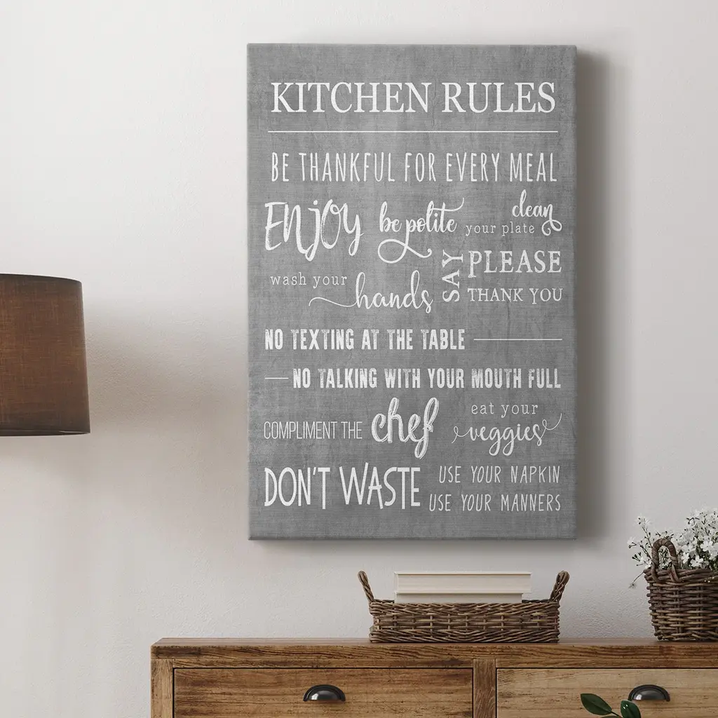 Neutral Kitchen Rules Premium Gallery Wrapped Canvas - Ready to Hang A premium hand stretched gallery wrapped canvas print created to last. Featuring a beveled a solid wood stretcher bar, each piece comes ready to hand 6 SIZES AVAILABLE 8''X12'' - Overall Size 12''X18'' - Overall Size 18''X27'' - Overall Size 24''x36'' - Overall Size 32''x48'' - Overall Size 40''x60'' - Overall Size Each piece is made to order. Built to Last Each piece comes ready to hang Solid wood stretcher Fade and Water resistant Made domestically