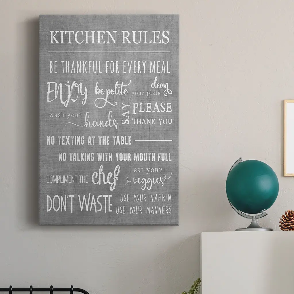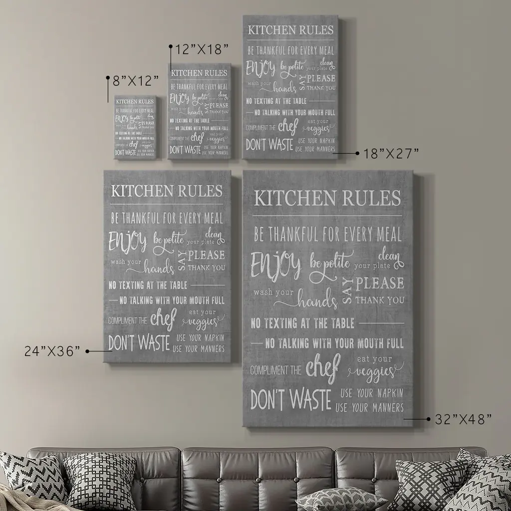 Neutral Kitchen Rules Premium Gallery Wrapped Canvas - Ready to Hang A premium hand stretched gallery wrapped canvas print created to last. Featuring a beveled a solid wood stretcher bar, each piece comes ready to hand 6 SIZES AVAILABLE 8''X12'' - Overall Size 12''X18'' - Overall Size 18''X27'' - Overall Size 24''x36'' - Overall Size 32''x48'' - Overall Size 40''x60'' - Overall Size Each piece is made to order. Built to Last Each piece comes ready to hang Solid wood stretcher Fade and Water resistant Made domestically