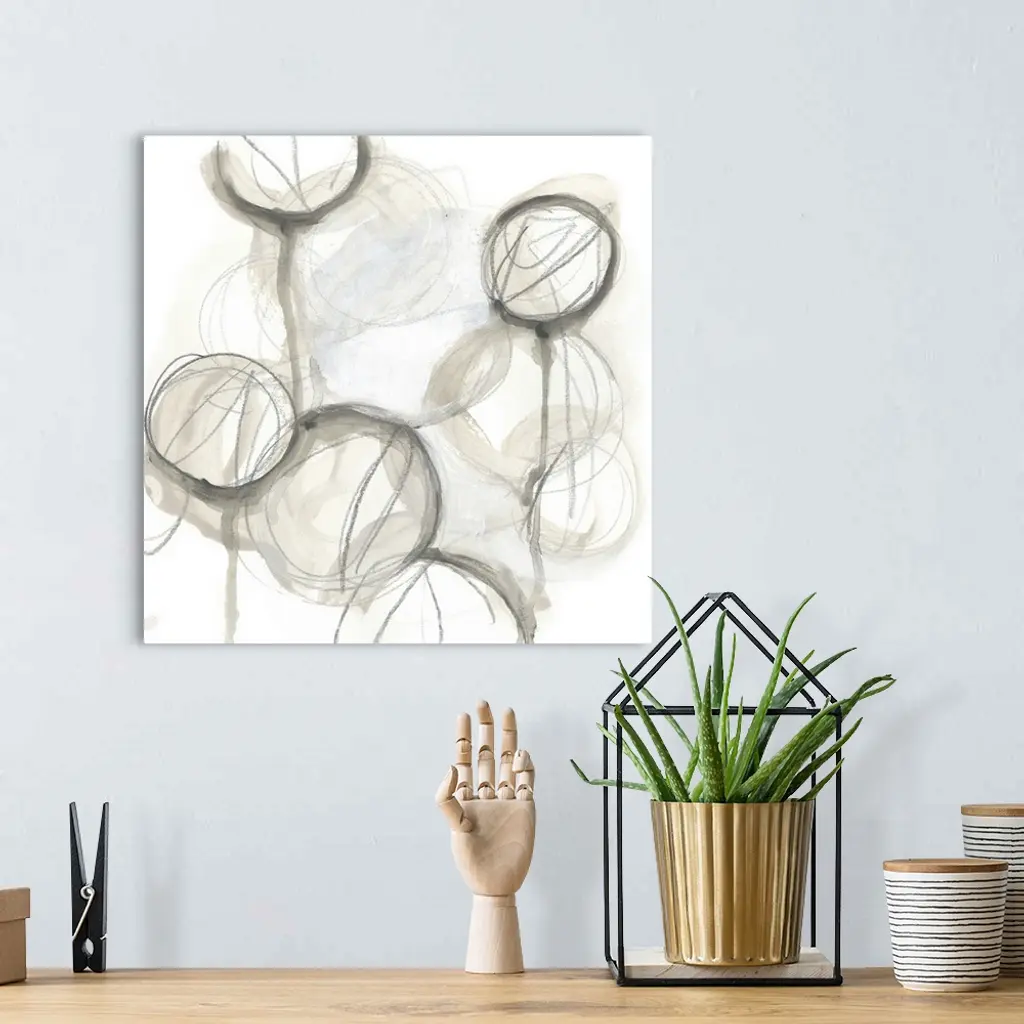 Contemporary watercolor abstract painting consisting of various circular shapes in neutral tones.