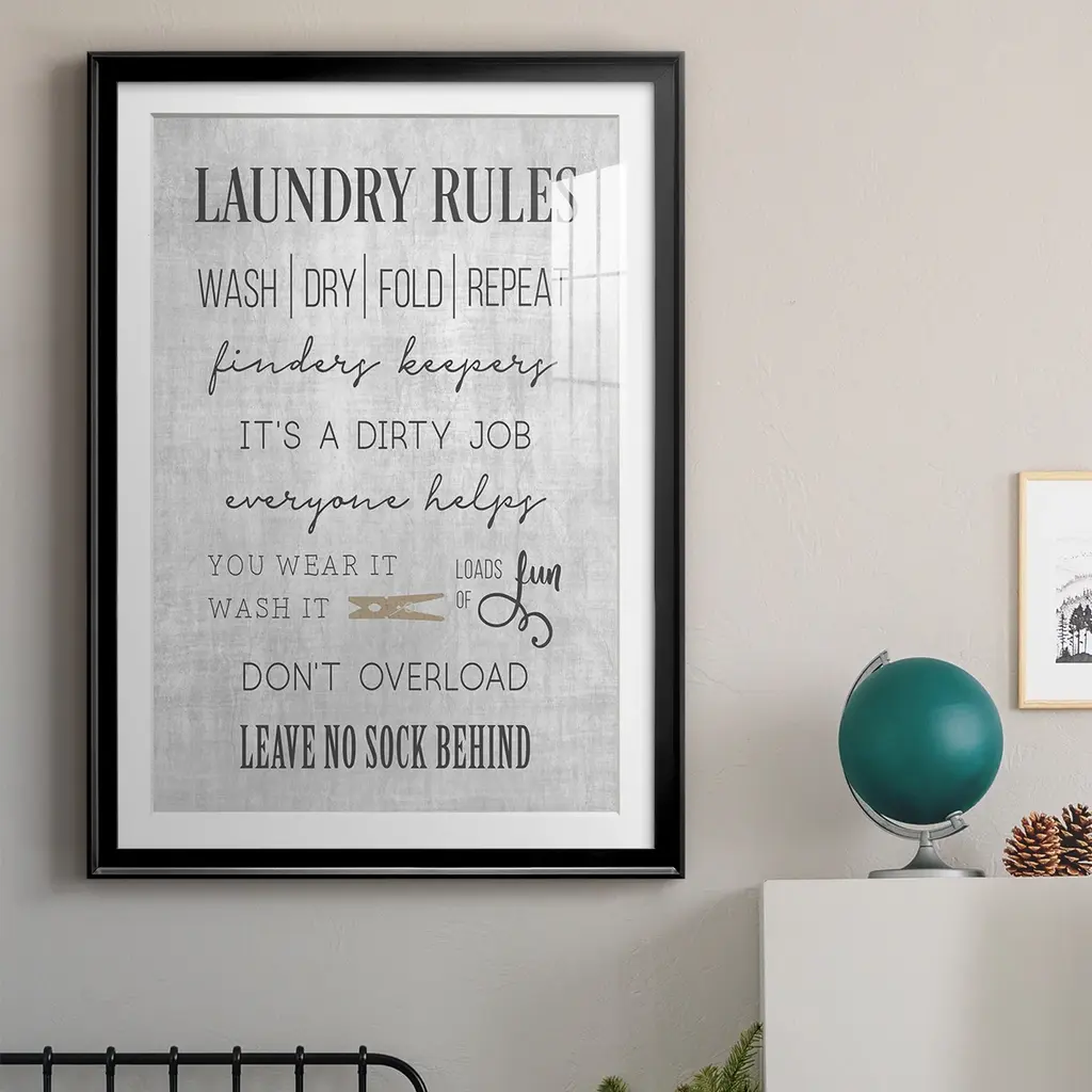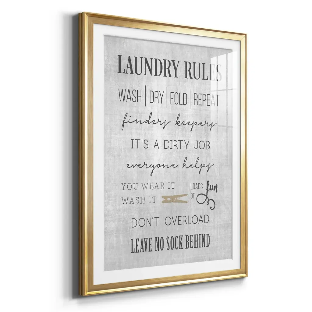 Neutral Laundry Rules Premium Framed Print - Ready to Hang A Premium Framed Print created to last. Framed in distressed wood and available in an array of sizes and colors Featuring a beveled a solid wood stretcher bar, each piece comes ready to hand 4 SIZES AVAILABLE 30.5''X42.5'' - Overall Size 26.5'X36.5'' - Overall Size 22.5''x30.5'' - Overall Size 18.5''x24.5'' - Overall Size Each piece is made to order. Each piece comes with hanging hardware. Made in the USA Ready to Hang Giclee Paper Print Acrylic Glass Beveled Matt Board
