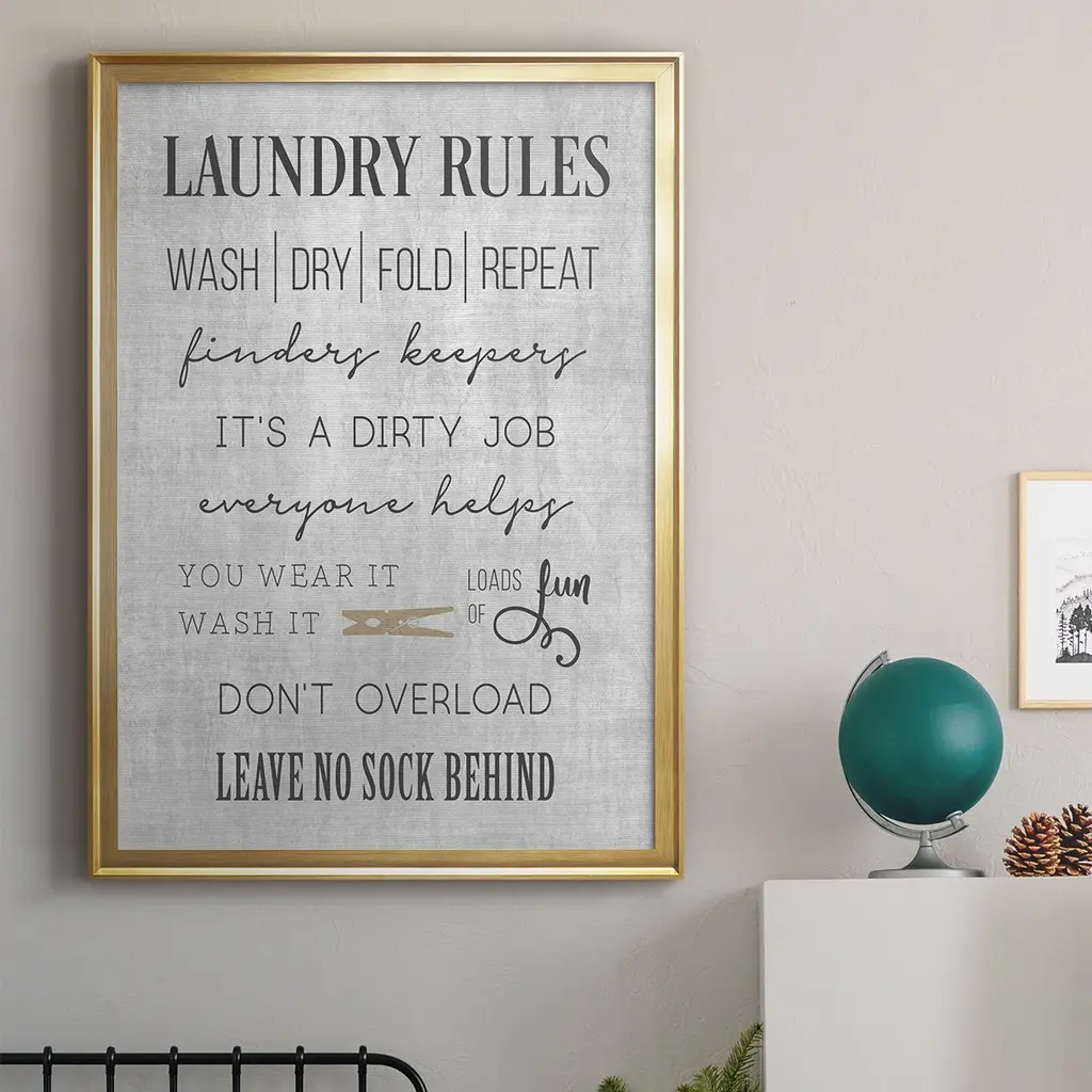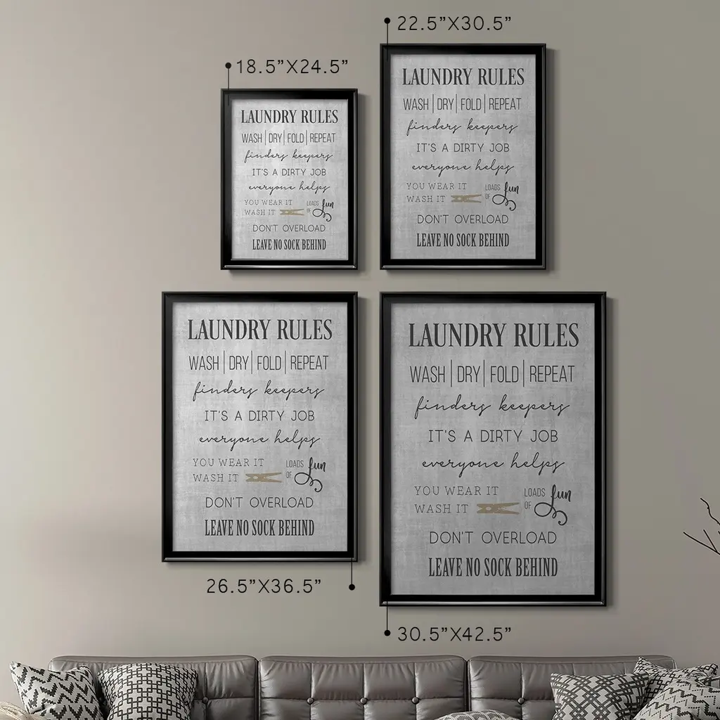 Neutral Laundry Rules Premium Framed Print - Ready to Hang A Premium Framed Print created to last. Framed in distressed wood and available in an array of sizes and colors Featuring a beveled a solid wood stretcher bar, each piece comes ready to hand 4 SIZES AVAILABLE 30.5''X42.5'' - Overall Size 26.5'X36.5'' - Overall Size 22.5''x30.5'' - Overall Size 18.5''x24.5'' - Overall Size Each piece is made to order. Each piece comes with hanging hardware. Made in the USA Ready to Hang
