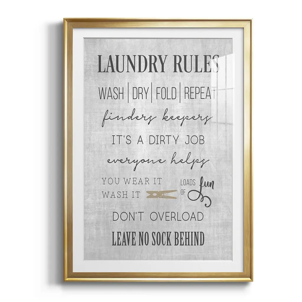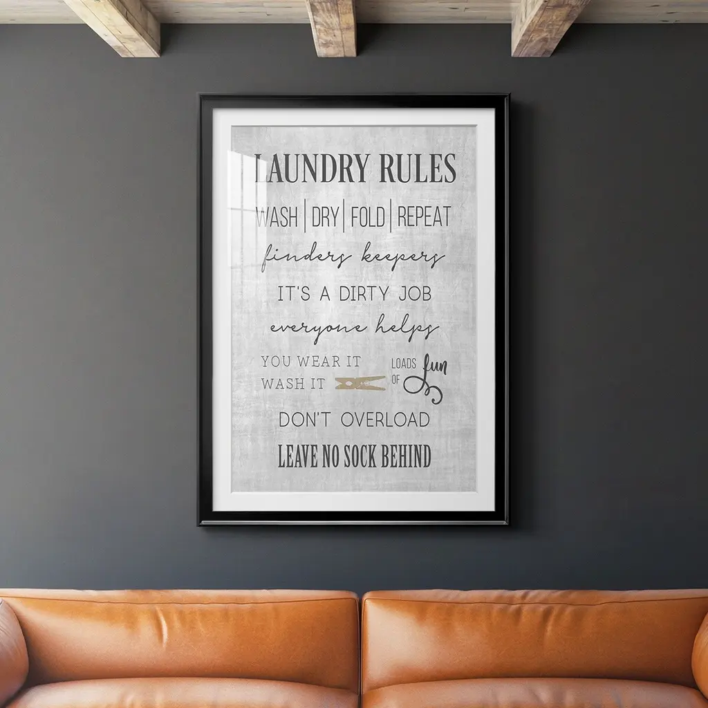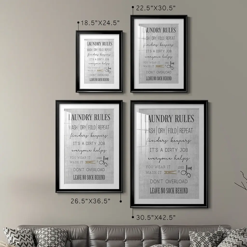 Neutral Laundry Rules Premium Framed Print - Ready to Hang A Premium Framed Print created to last. Framed in distressed wood and available in an array of sizes and colors Featuring a beveled a solid wood stretcher bar, each piece comes ready to hand 4 SIZES AVAILABLE 30.5''X42.5'' - Overall Size 26.5'X36.5'' - Overall Size 22.5''x30.5'' - Overall Size 18.5''x24.5'' - Overall Size Each piece is made to order. Each piece comes with hanging hardware. Made in the USA Ready to Hang Giclee Paper Print Acrylic Glass Beveled Matt Board