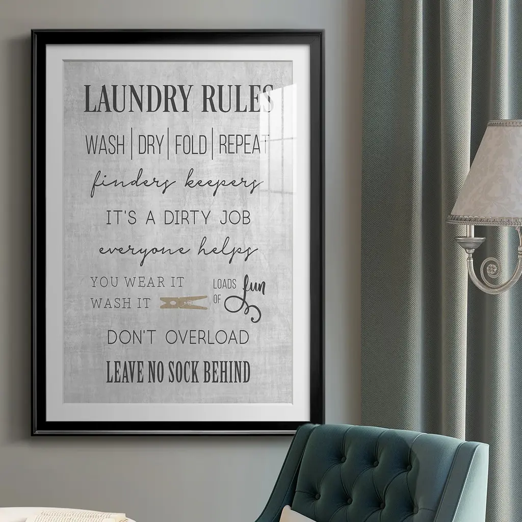 Neutral Laundry Rules Premium Framed Print - Ready to Hang A Premium Framed Print created to last. Framed in distressed wood and available in an array of sizes and colors Featuring a beveled a solid wood stretcher bar, each piece comes ready to hand 4 SIZES AVAILABLE 30.5''X42.5'' - Overall Size 26.5'X36.5'' - Overall Size 22.5''x30.5'' - Overall Size 18.5''x24.5'' - Overall Size Each piece is made to order. Each piece comes with hanging hardware. Made in the USA Ready to Hang Giclee Paper Print Acrylic Glass Beveled Matt Board