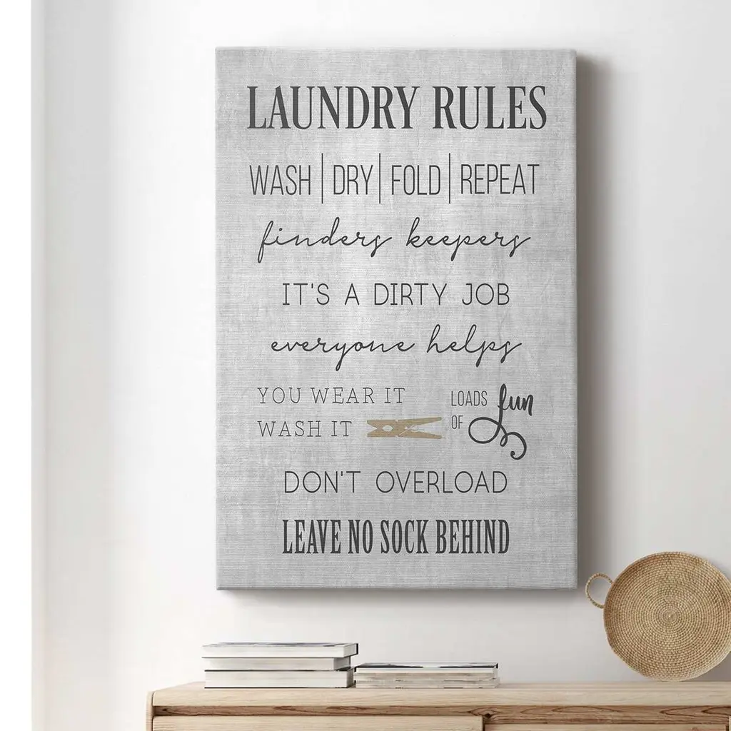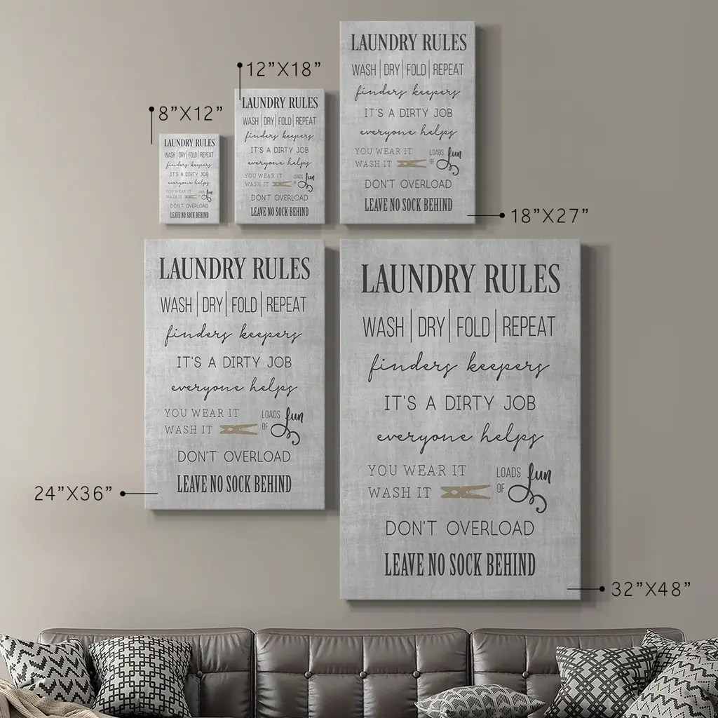 Neutral Laundry Rules Premium Gallery Wrapped Canvas - Ready to Hang A premium hand stretched gallery wrapped canvas print created to last. Featuring a beveled a solid wood stretcher bar, each piece comes ready to hand 6 SIZES AVAILABLE 8''X12'' - Overall Size 12''X18'' - Overall Size 18''X27'' - Overall Size 24''x36'' - Overall Size 32''x48'' - Overall Size 40''x60'' - Overall Size Each piece is made to order. Built to Last Each piece comes ready to hang Solid wood stretcher Fade and Water resistant Made domestically