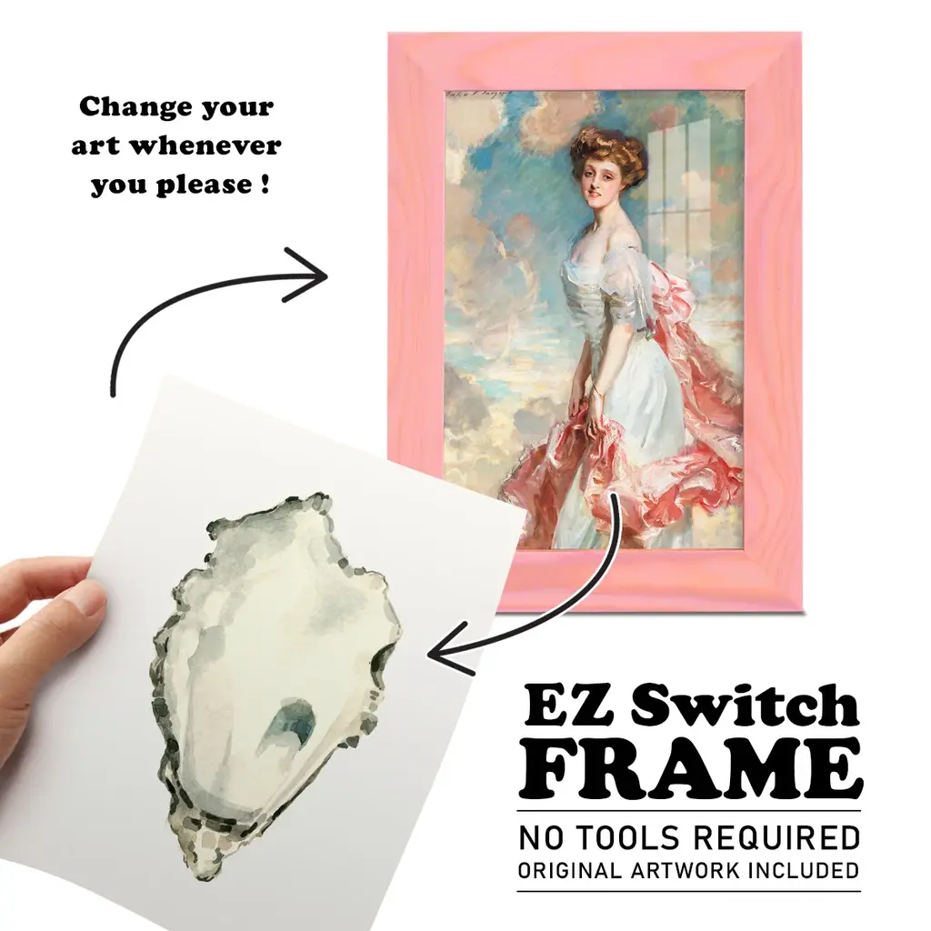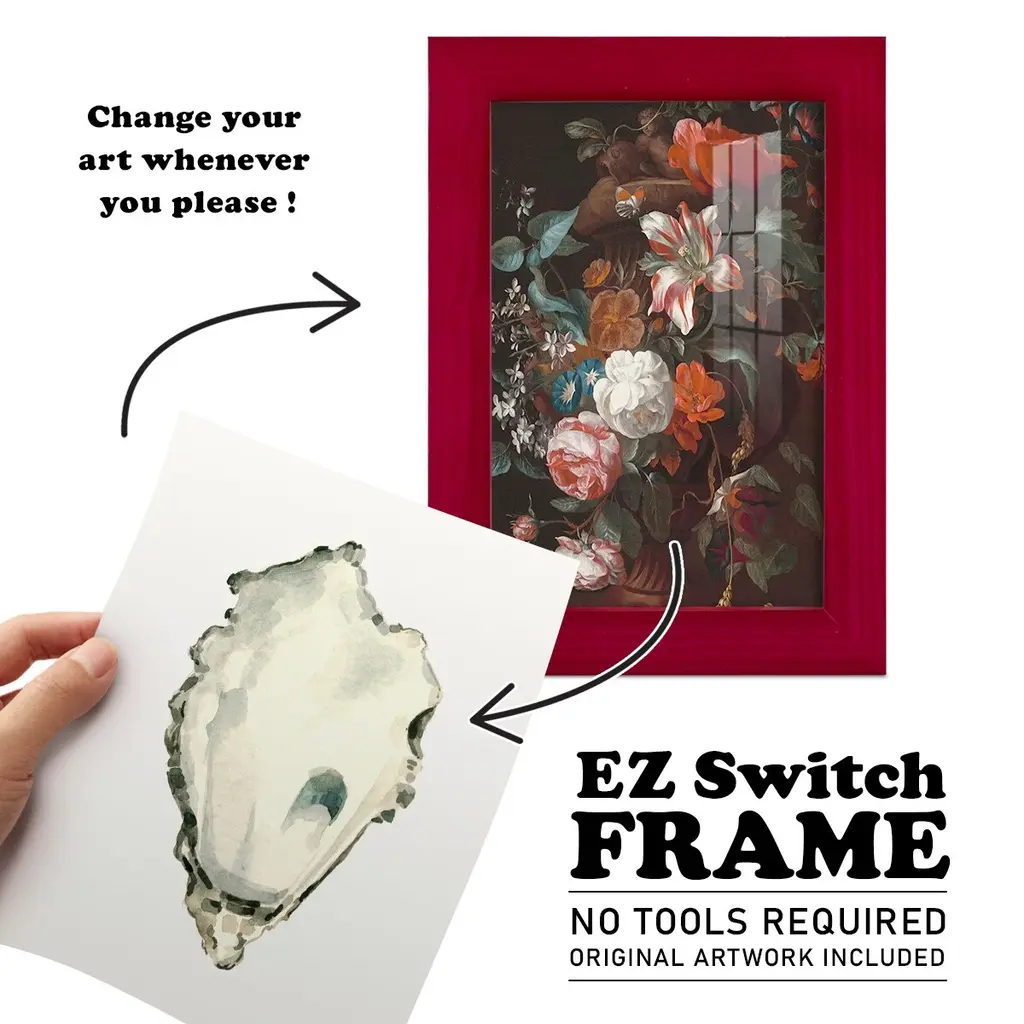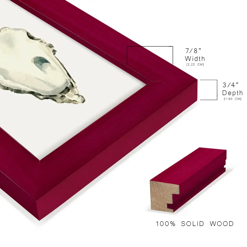 Neutral Oyster Study IV -EZ SWITCH Framed Print w/glass-Cherry Red A delightful, framed print. Featuring a solid wood frame with real wood glass. This premium print is giclee quality. In addition, every frame features a removable back and table top stand. This allows you to change your art in the future or to just stand the art on a table for a new look. We are sure you'll enjoy our new series of EZ SWITCH Framed Art. Solid Wood Frame Real Glass Removable / Replaceable Art Built in Tabletop Stand Sizes range from 4x6 up to 12x15 - buy just one or pair them up as sets as you see fit.