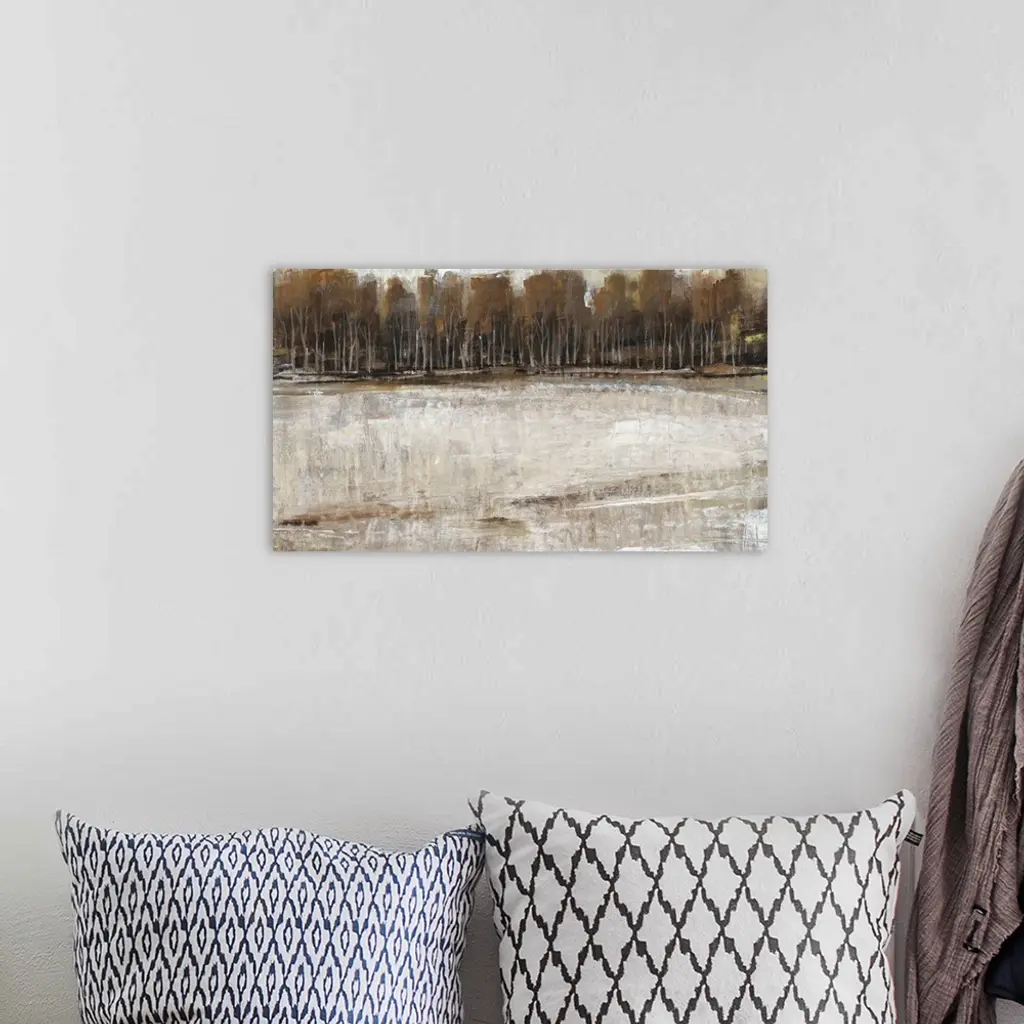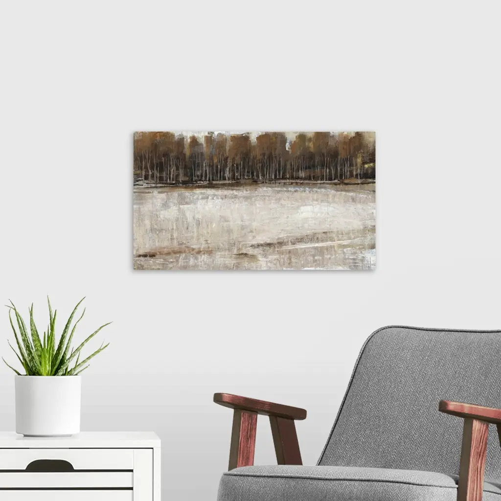 Abstract landscape artwork of a forest at the edge of a lake in earth tones.