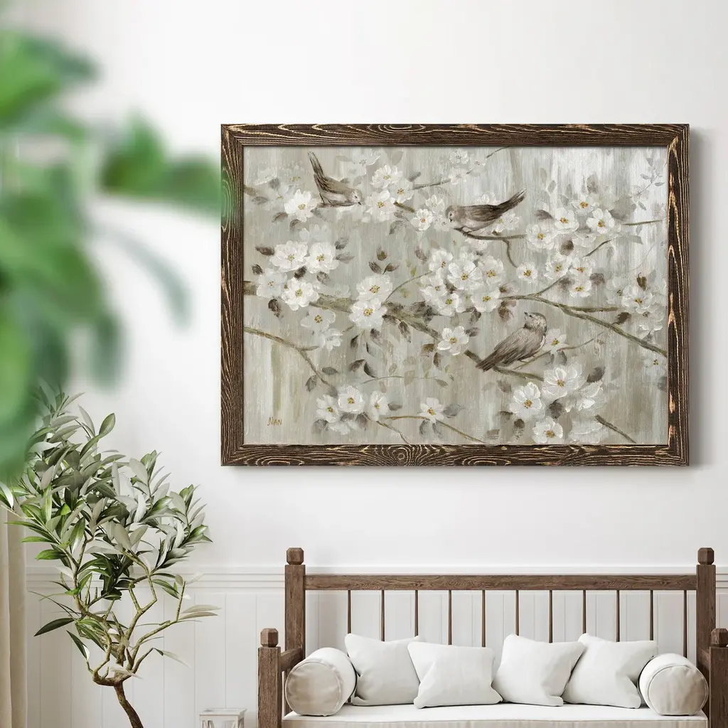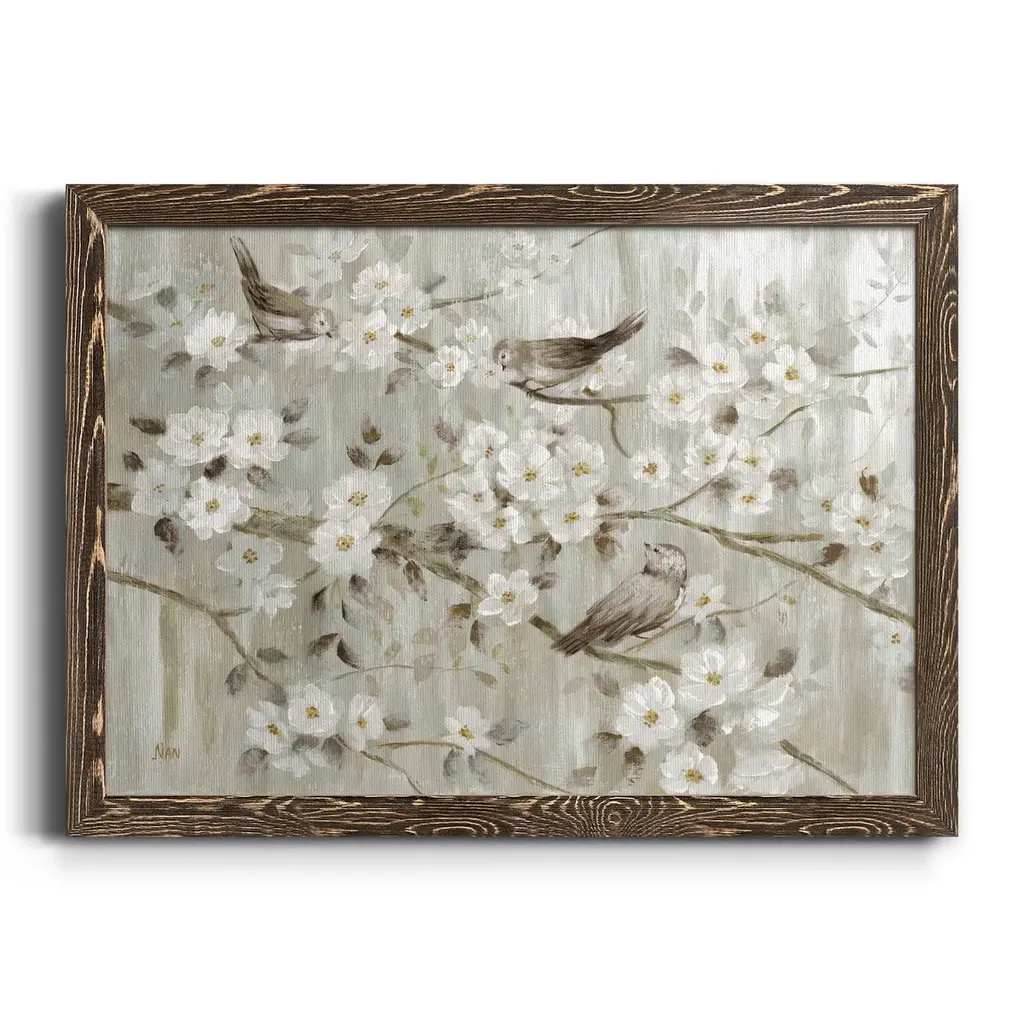 Neutral Spring Birds-Premium Framed Canvas - Ready to Hang Framed in distressed wood and available in an array of sizes and colors Each piece is joined and assembled by hand and comes ready to hang Framed Giclee Canvas READY TO HANG MADE IN THE USA SOLID WOOD FRAME MADE IN USA FADE RESISTANT GICLEE PRINTING on Canvas or Paper