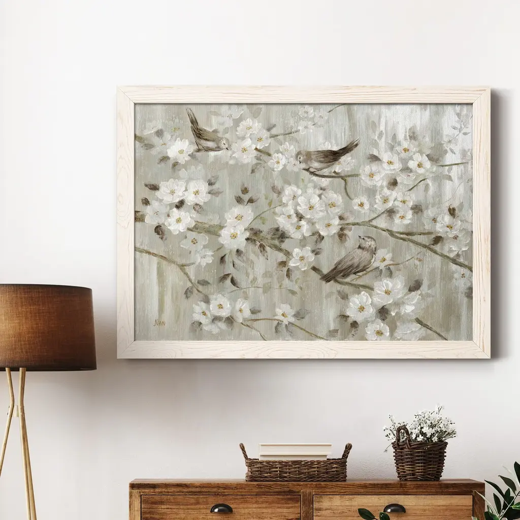 Neutral Spring Birds-Premium Framed Canvas - Ready to Hang Framed in distressed wood and available in an array of sizes and colors Each piece is joined and assembled by hand and comes ready to hang Framed Giclee Canvas READY TO HANG MADE IN THE USA SOLID WOOD FRAME MADE IN USA FADE RESISTANT GICLEE PRINTING on Canvas or Paper