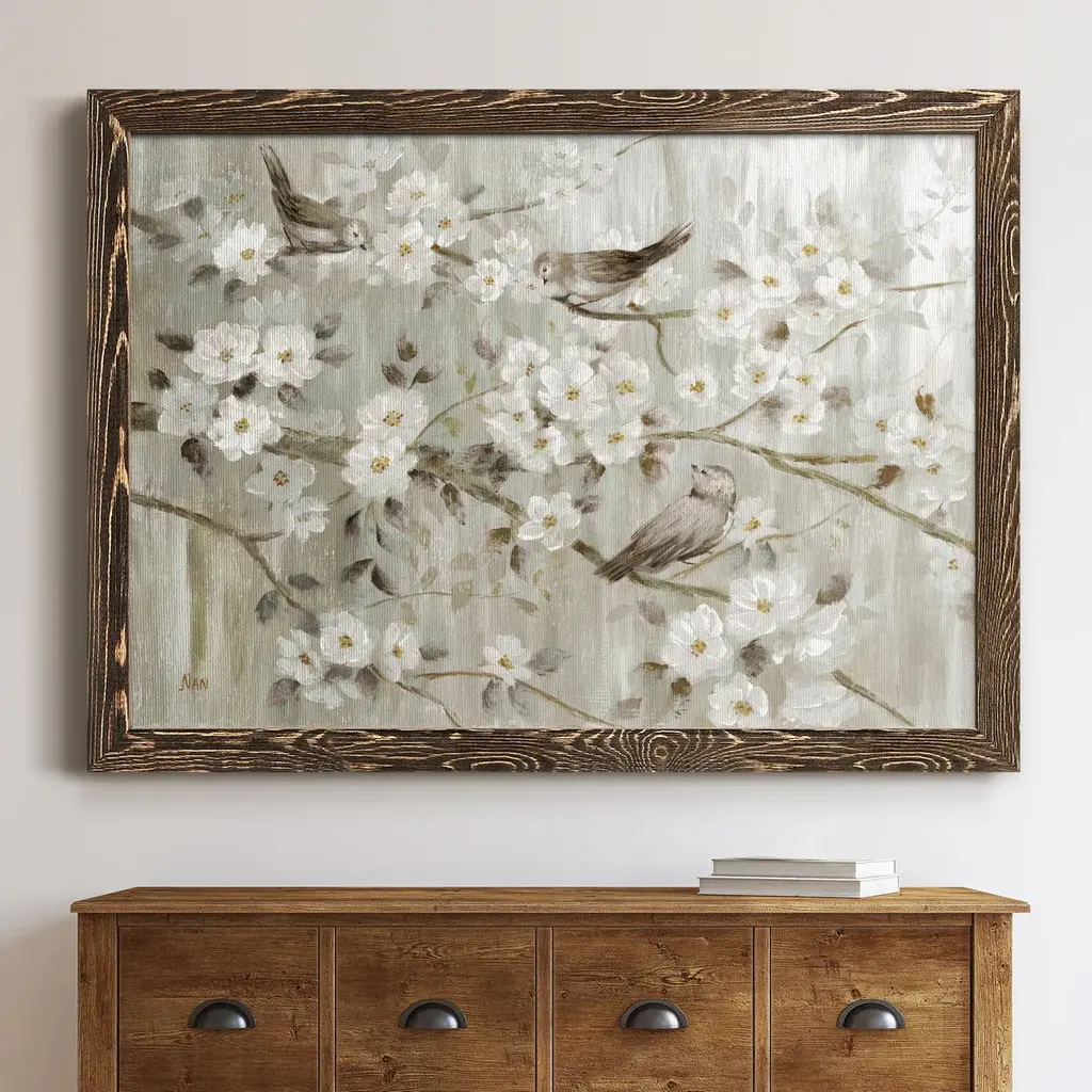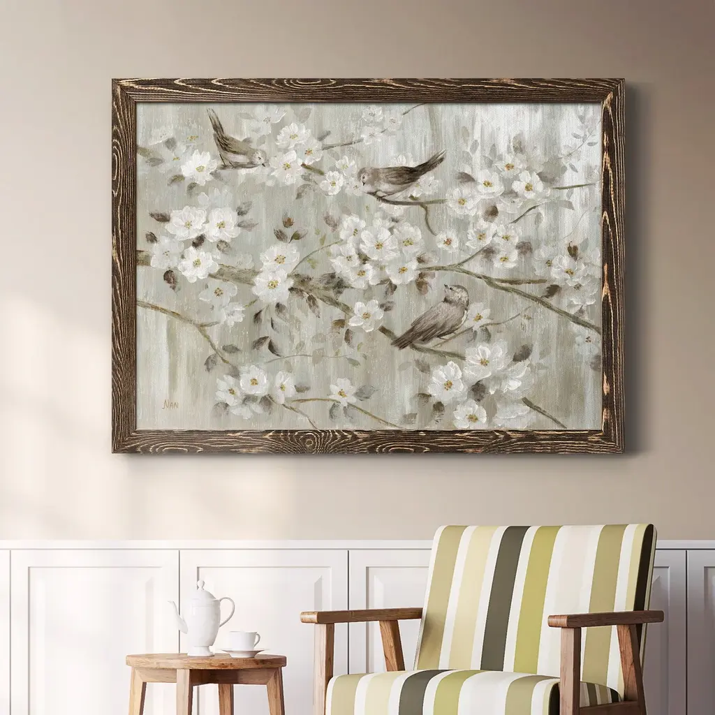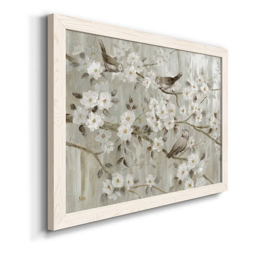 Neutral Spring Birds-Premium Framed Canvas - Ready to Hang Framed in distressed wood and available in an array of sizes and colors Each piece is joined and assembled by hand and comes ready to hang Framed Giclee Canvas READY TO HANG MADE IN THE USA SOLID WOOD FRAME MADE IN USA FADE RESISTANT GICLEE PRINTING on Canvas or Paper