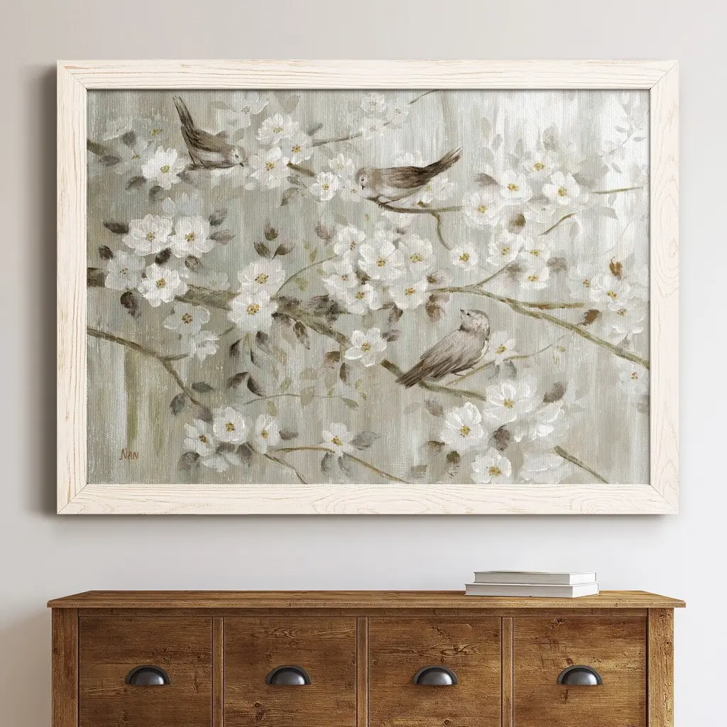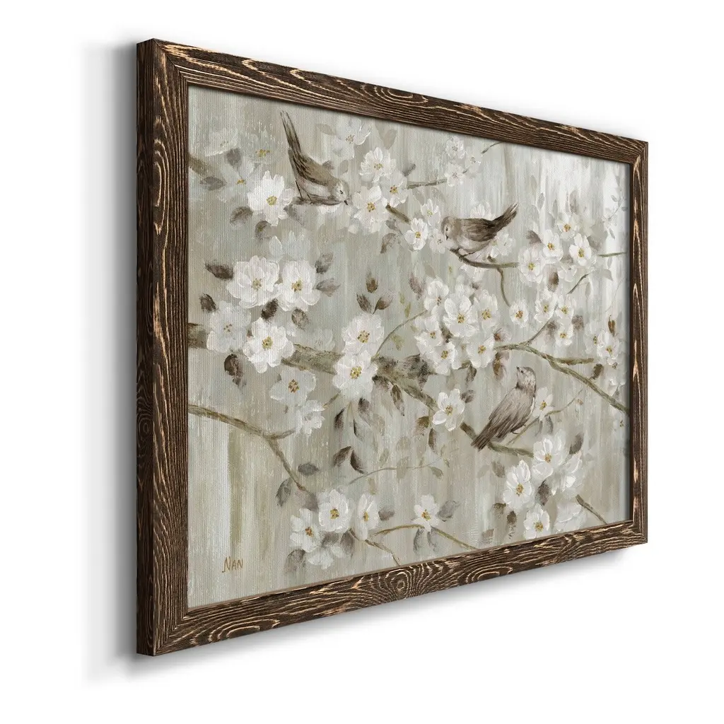 Neutral Spring Birds-Premium Framed Canvas - Ready to Hang Framed in distressed wood and available in an array of sizes and colors Each piece is joined and assembled by hand and comes ready to hang Framed Giclee Canvas READY TO HANG MADE IN THE USA SOLID WOOD FRAME MADE IN USA FADE RESISTANT GICLEE PRINTING on Canvas or Paper
