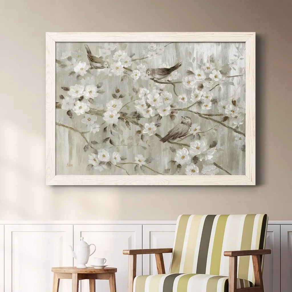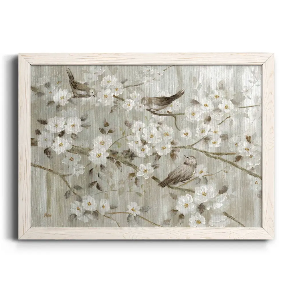 Neutral Spring Birds-Premium Framed Canvas - Ready to Hang Framed in distressed wood and available in an array of sizes and colors Each piece is joined and assembled by hand and comes ready to hang Framed Giclee Canvas READY TO HANG MADE IN THE USA SOLID WOOD FRAME MADE IN USA FADE RESISTANT GICLEE PRINTING on Canvas or Paper