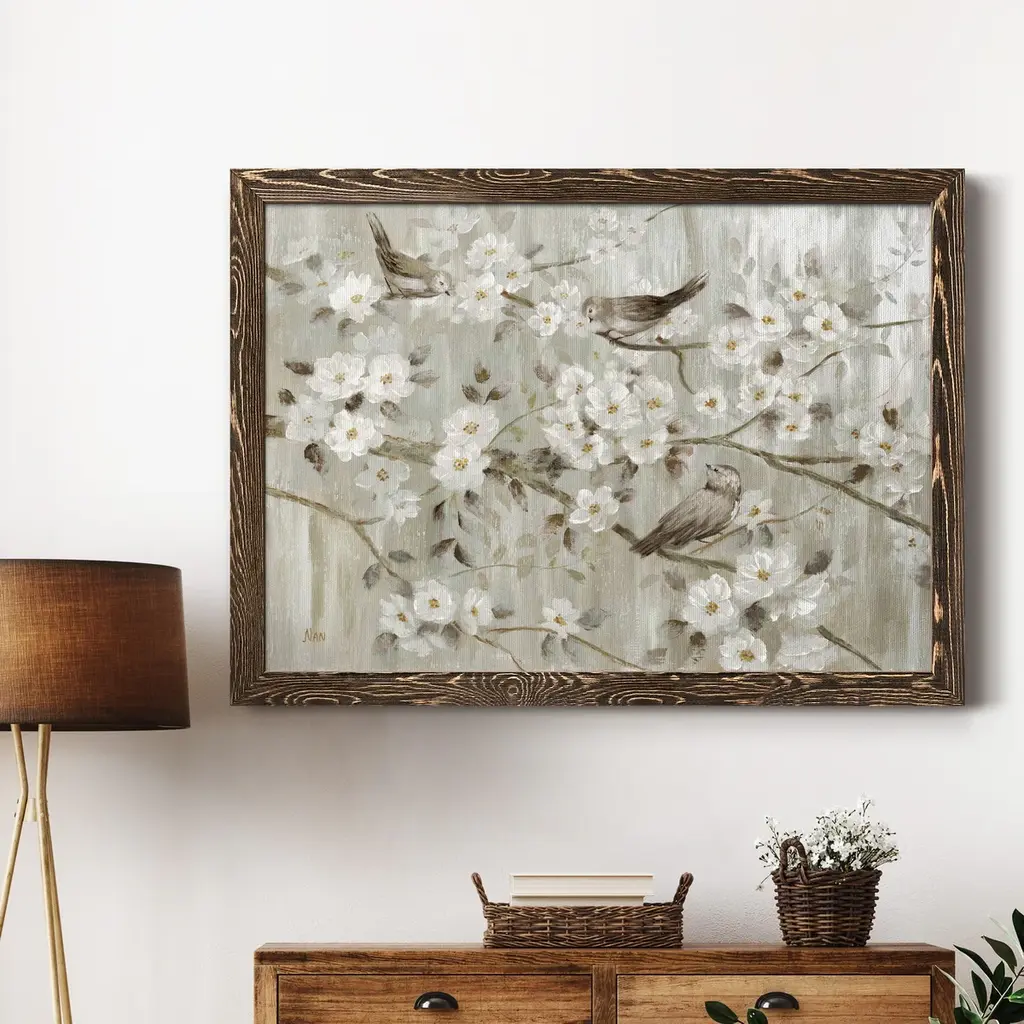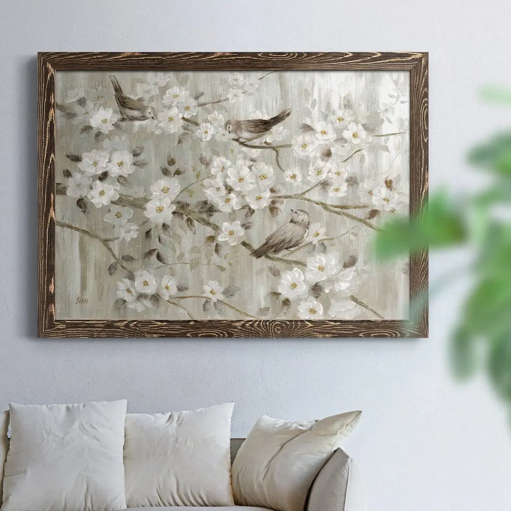 Neutral Spring Birds-Premium Framed Canvas - Ready to Hang Framed in distressed wood and available in an array of sizes and colors Each piece is joined and assembled by hand and comes ready to hang Framed Giclee Canvas READY TO HANG MADE IN THE USA SOLID WOOD FRAME MADE IN USA FADE RESISTANT GICLEE PRINTING on Canvas or Paper