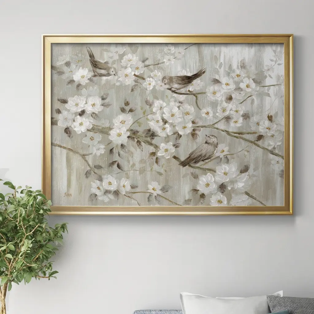 Neutral Spring Birds Premium Framed Canvas - Ready to Hang A Premium Framed Canvas created to last. Framed in distressed wood and available in an array of sizes and colors Featuring a beveled a solid wood stretcher bar, each piece comes ready to hand 4 SIZES AVAILABLE 30.5''X42.5'' - Overall Size 26.5'X36.5'' - Overall Size 22''x30'' - Overall Size 18''x24'' - Overall Size Each piece is made to order. Each piece comes with hanging hardware. Made in the USA Ready to Hang Giclee Paper Print Acrylic Glass Beveled Matt Board