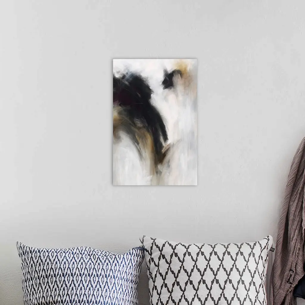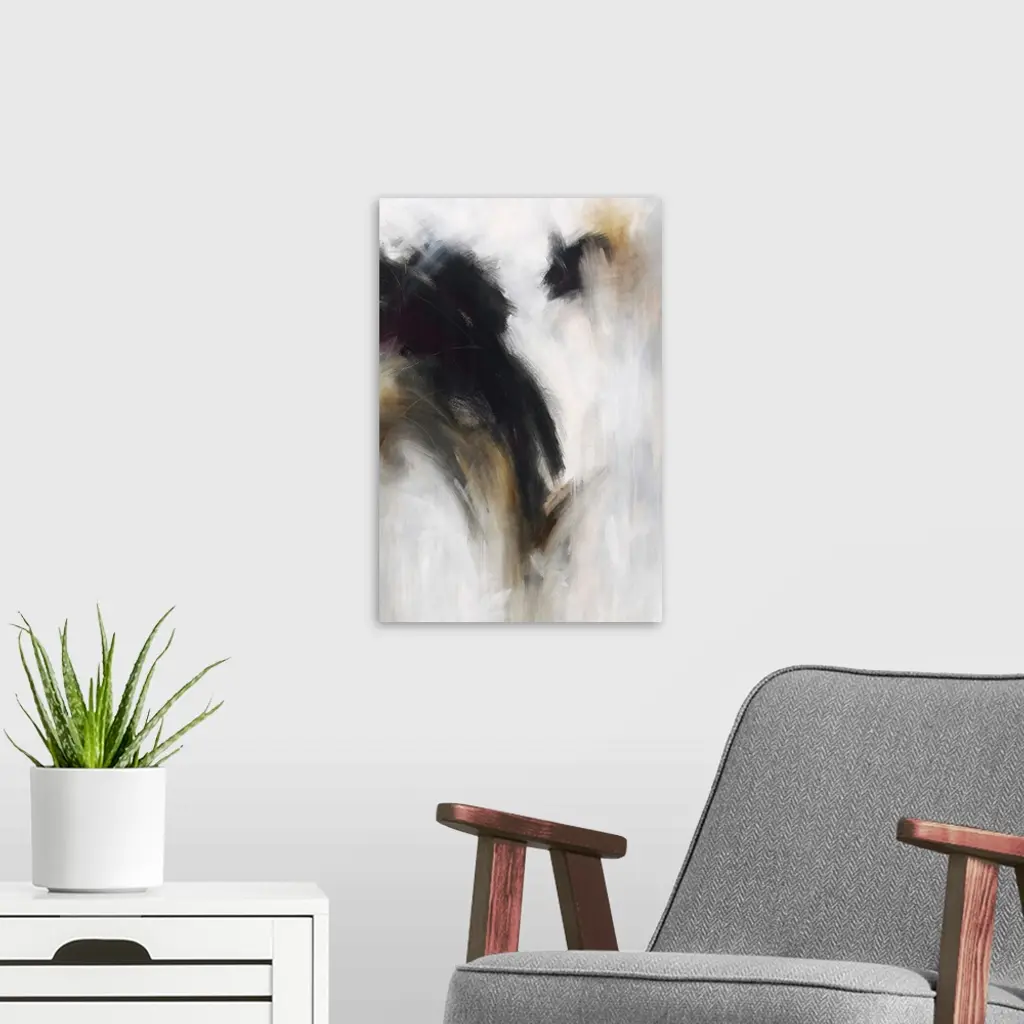 Vertical abstract painting with dark black over bright grey.