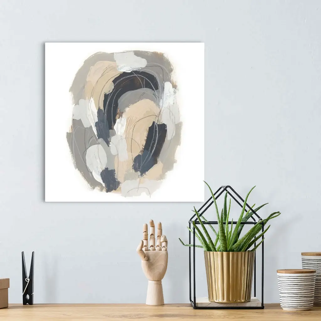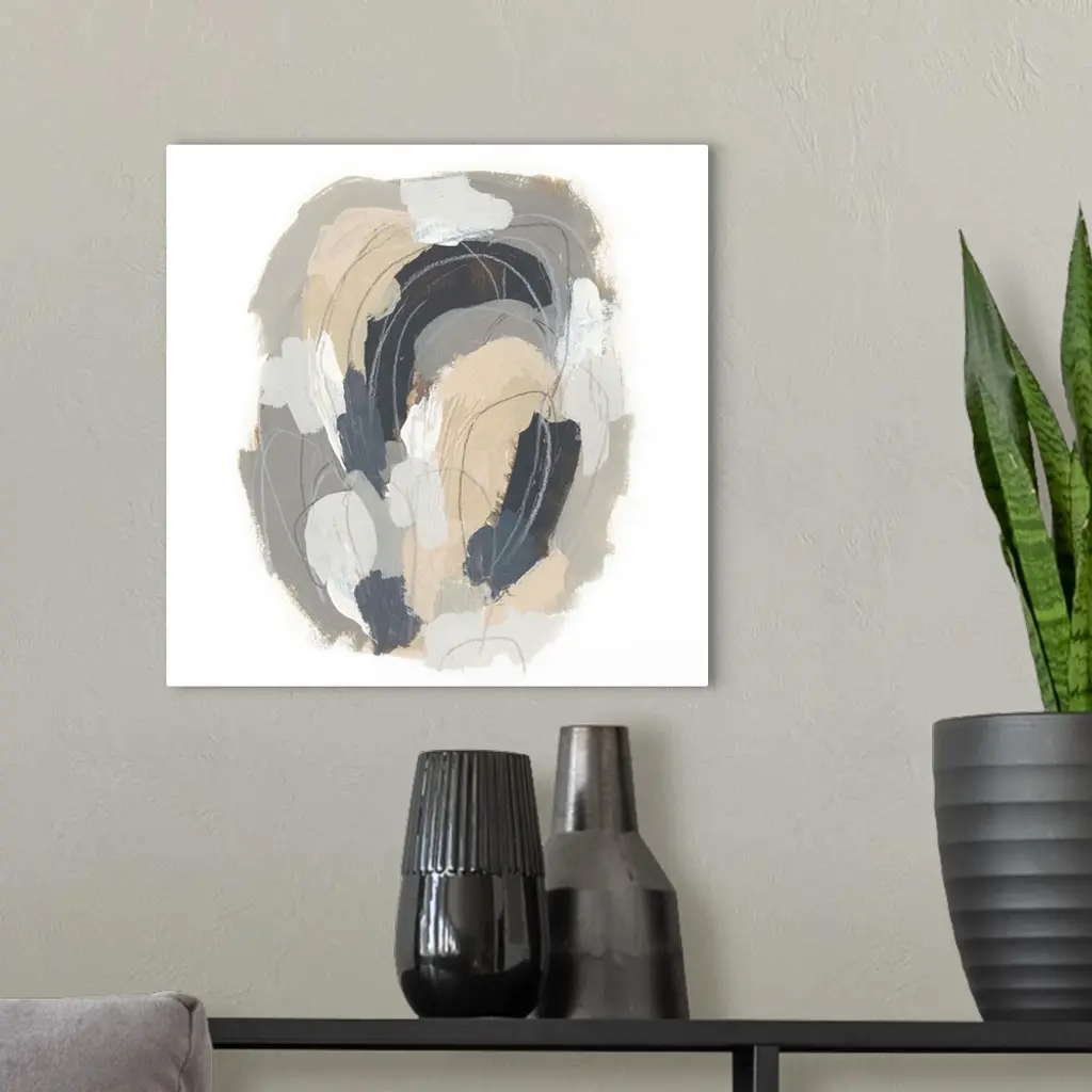Square abstract painting in neutral tones of gray, beige and white with overlaying fine gray lines in circular shapes.