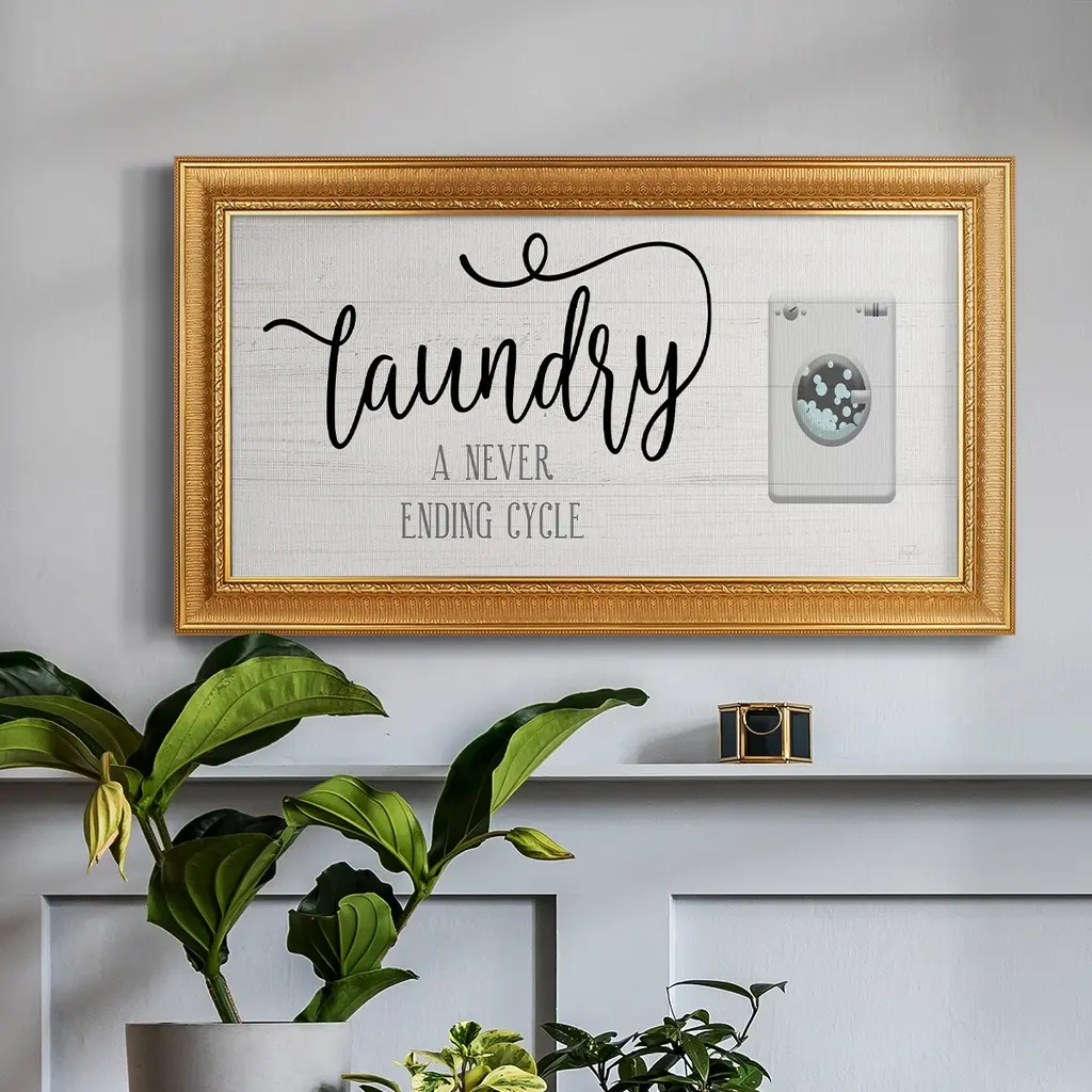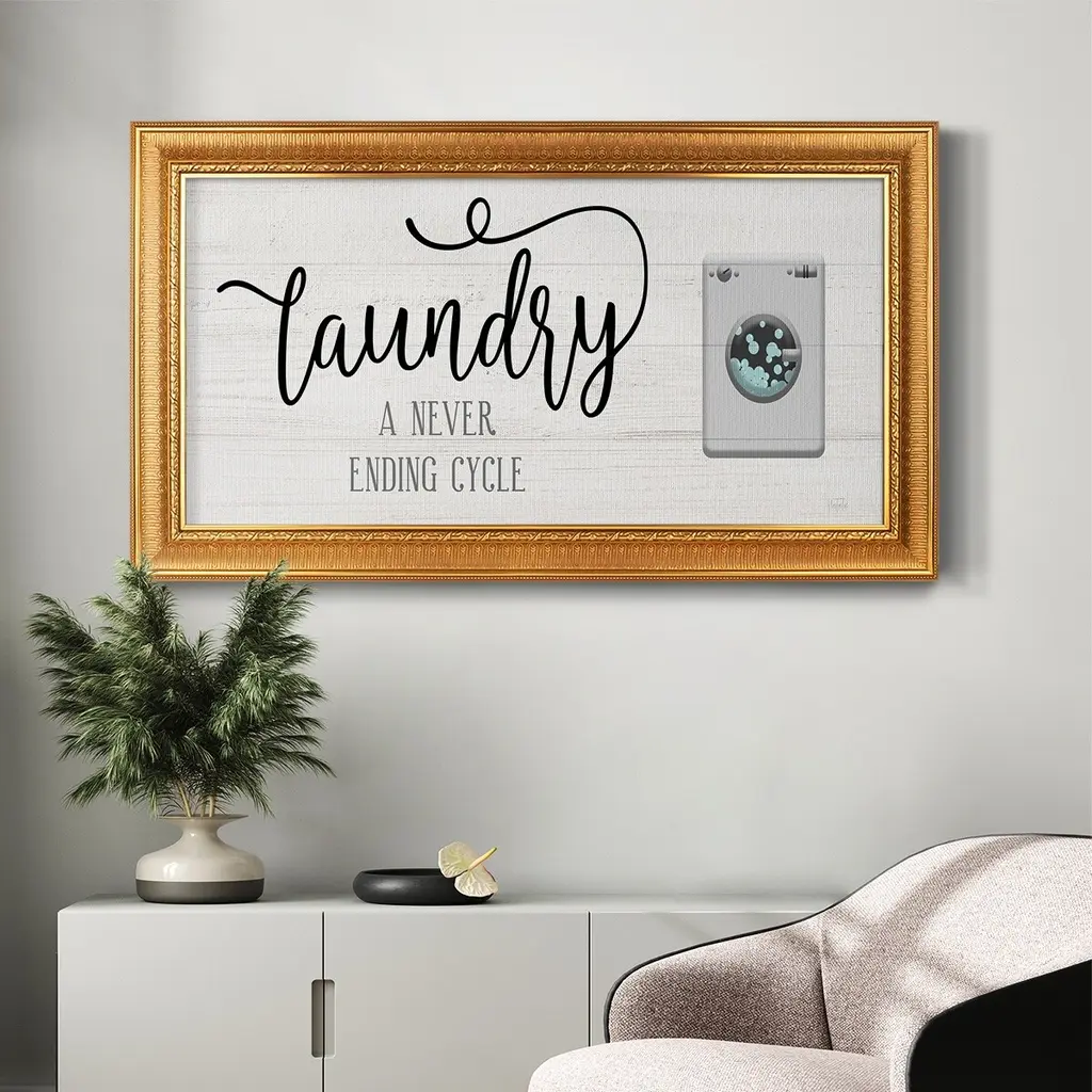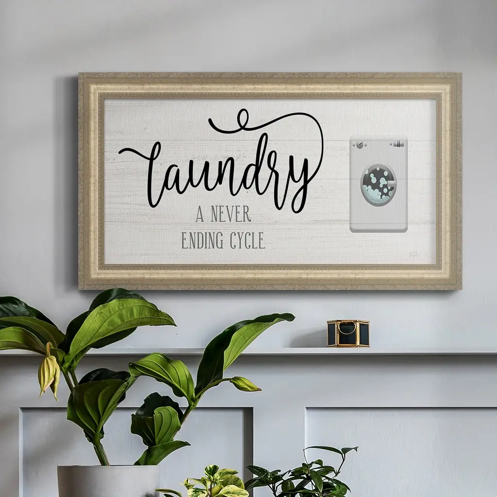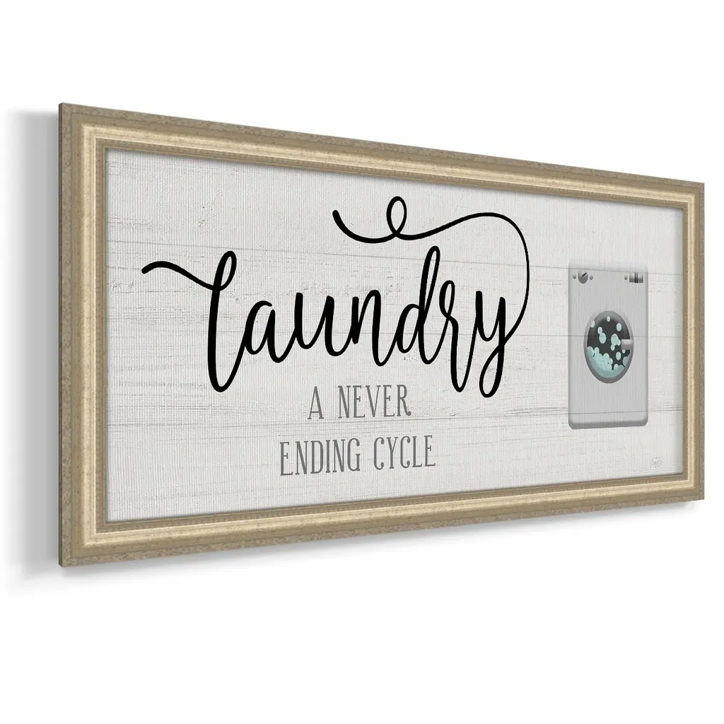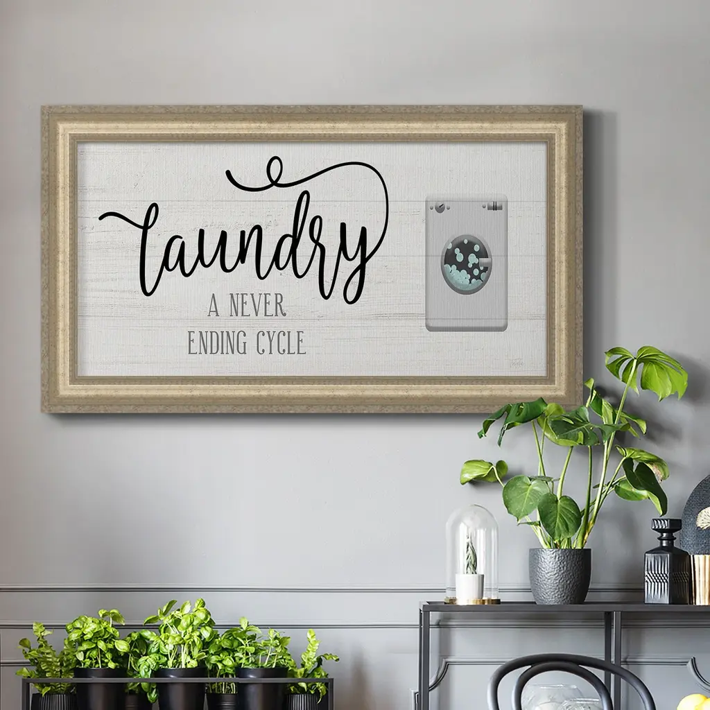 Never Ending Laundry Premium Framed Canvas- Ready to Hang A Premium Framed Canvas created to last. Framed in distressed wood and available in an array of sizes and colors Featuring a beveled a solid wood stretcher bar, each piece comes ready to hand 3 SIZES AVAILABLE 21''X37'' - Overall Size 25''X45'' - Overall Size 29''x53'' - Overall Size Each piece is made to order. Each piece comes with hanging hardware. Made in the USA Ready to Hang Giclee Paper Print Acrylic Glass Beveled Matt Board