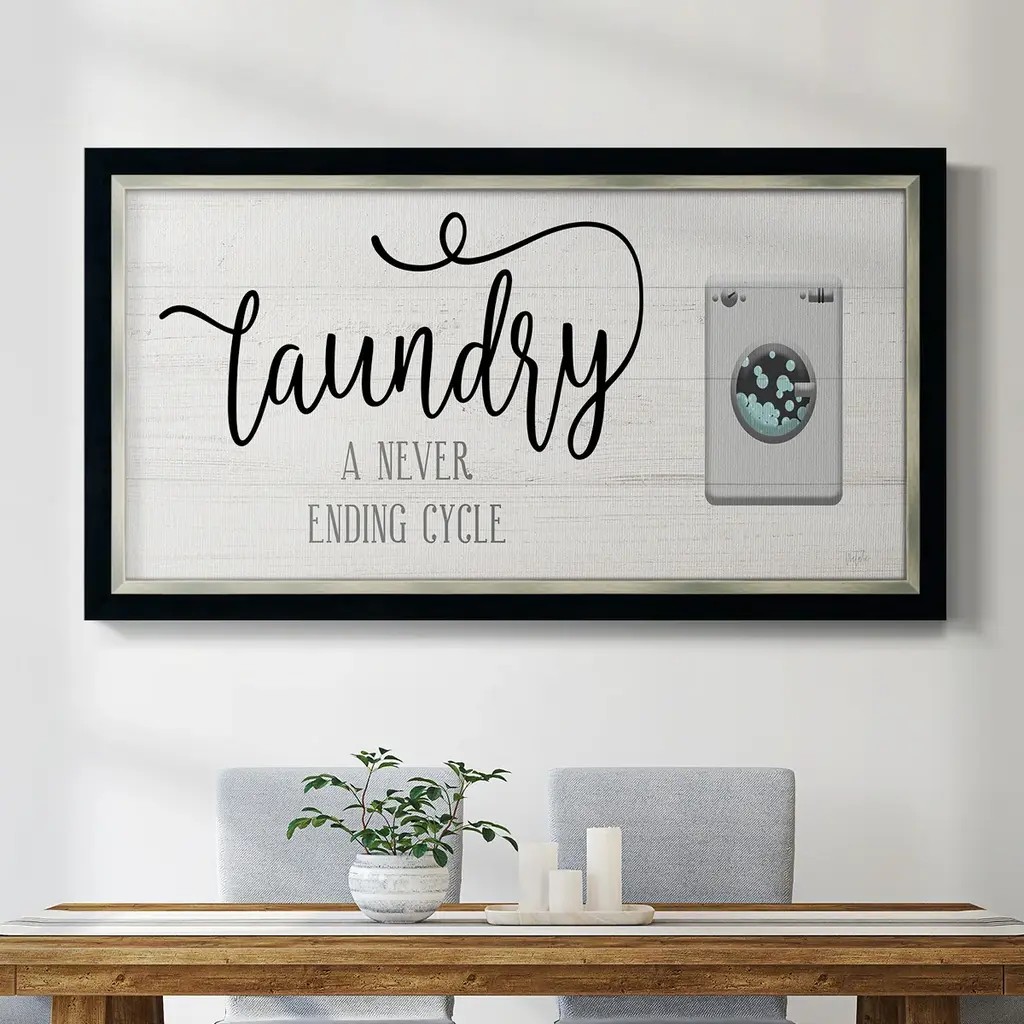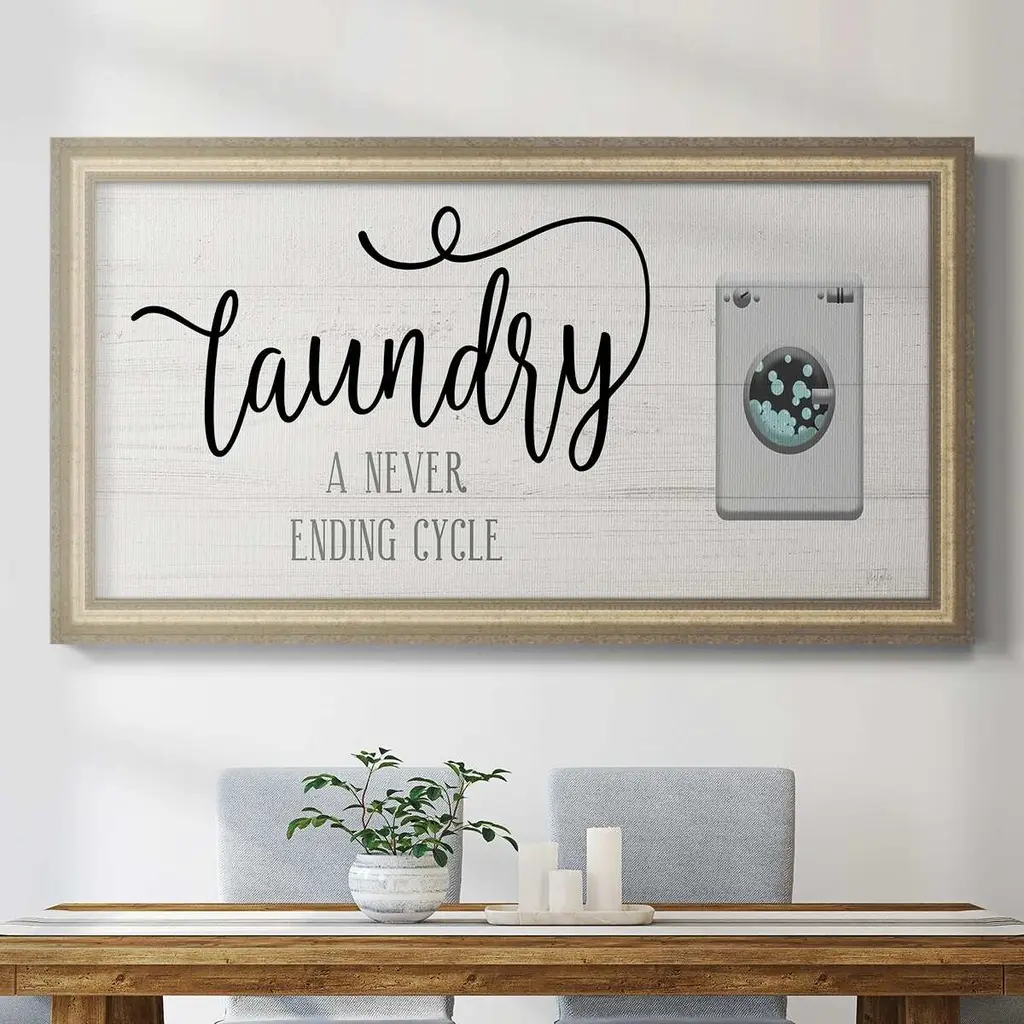 Never Ending Laundry Premium Framed Canvas- Ready to Hang A Premium Framed Canvas created to last. Framed in distressed wood and available in an array of sizes and colors Featuring a beveled a solid wood stretcher bar, each piece comes ready to hand 3 SIZES AVAILABLE 21''X37'' - Overall Size 25''X45'' - Overall Size 29''x53'' - Overall Size Each piece is made to order. Each piece comes with hanging hardware. Made in the USA Ready to Hang Giclee Paper Print Acrylic Glass Beveled Matt Board
