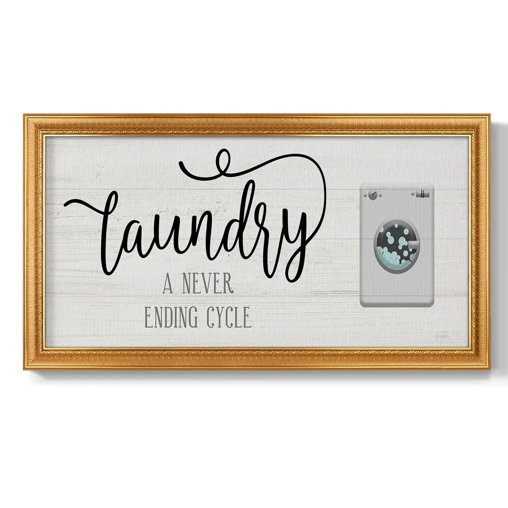 Never Ending Laundry Premium Framed Canvas- Ready to Hang A Premium Framed Canvas created to last. Framed in distressed wood and available in an array of sizes and colors Featuring a beveled a solid wood stretcher bar, each piece comes ready to hand 3 SIZES AVAILABLE 21''X37'' - Overall Size 25''X45'' - Overall Size 29''x53'' - Overall Size Each piece is made to order. Each piece comes with hanging hardware. Made in the USA Ready to Hang Giclee Paper Print Acrylic Glass Beveled Matt Board